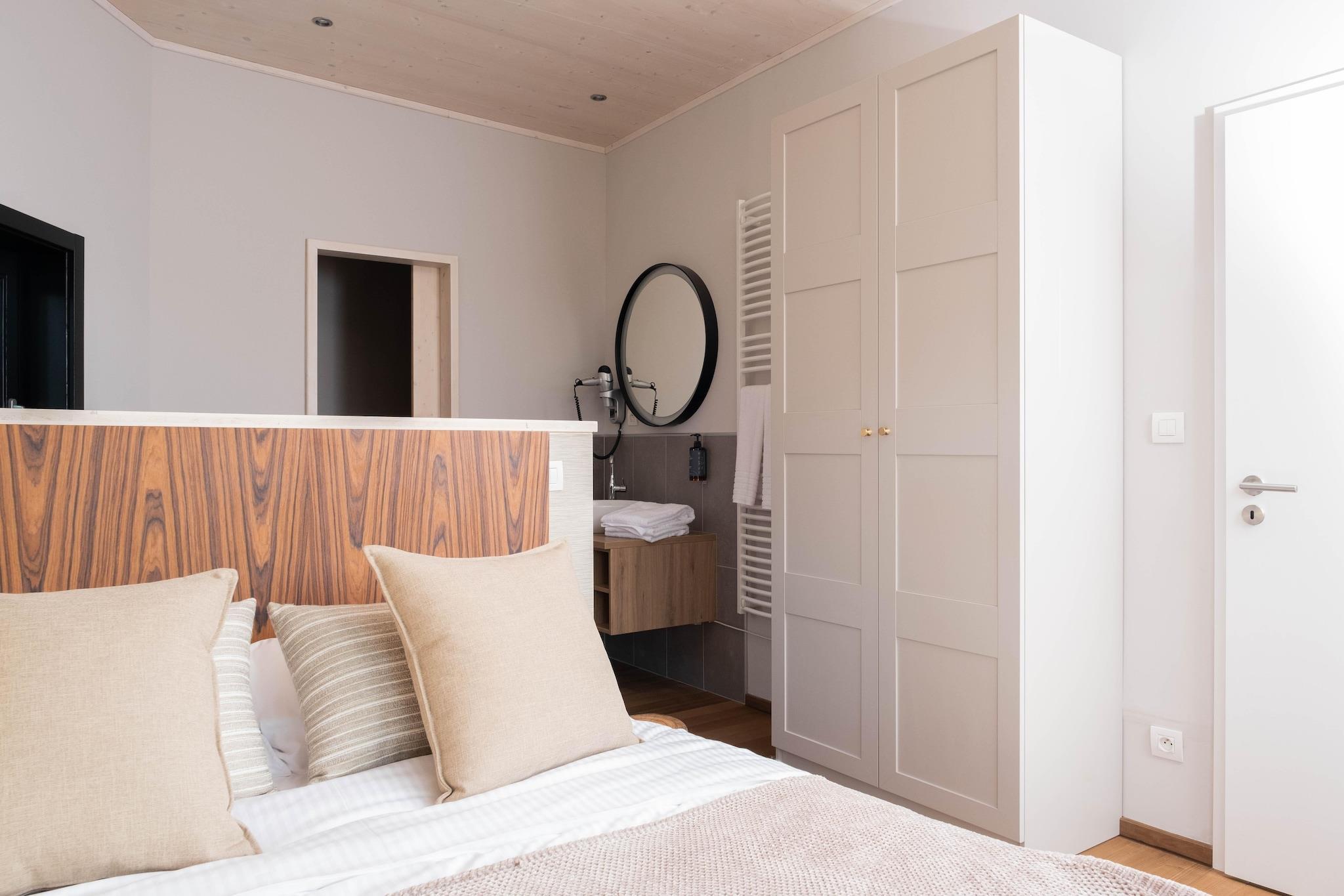Stueetage: (åbent køkken(elkedel, komfur, kaffemaskine(kaffepude), ovn, opvaskemaskine , køle-fryseskab), stue / spisestue(Fjernsyn(Smart-TV), spisebord, pejs, sofahjørne), Soveværelse med badeværelse(dobbeltseng(160 x 200 cm), bruser, håndvask, toilet), Soveværelse med badeværelse(enkeltseng(80 x 200 cm), enkeltseng(80 x 200 cm), bruser, håndvask, toilet), sal, Internetadgang) balkon eller terrasse, havemøbler, parkering, swimmingpool(deles med andre gæster, udendørs), swimmingpool(deles med andre gæster, indendørs), padelbane, loungemøbler