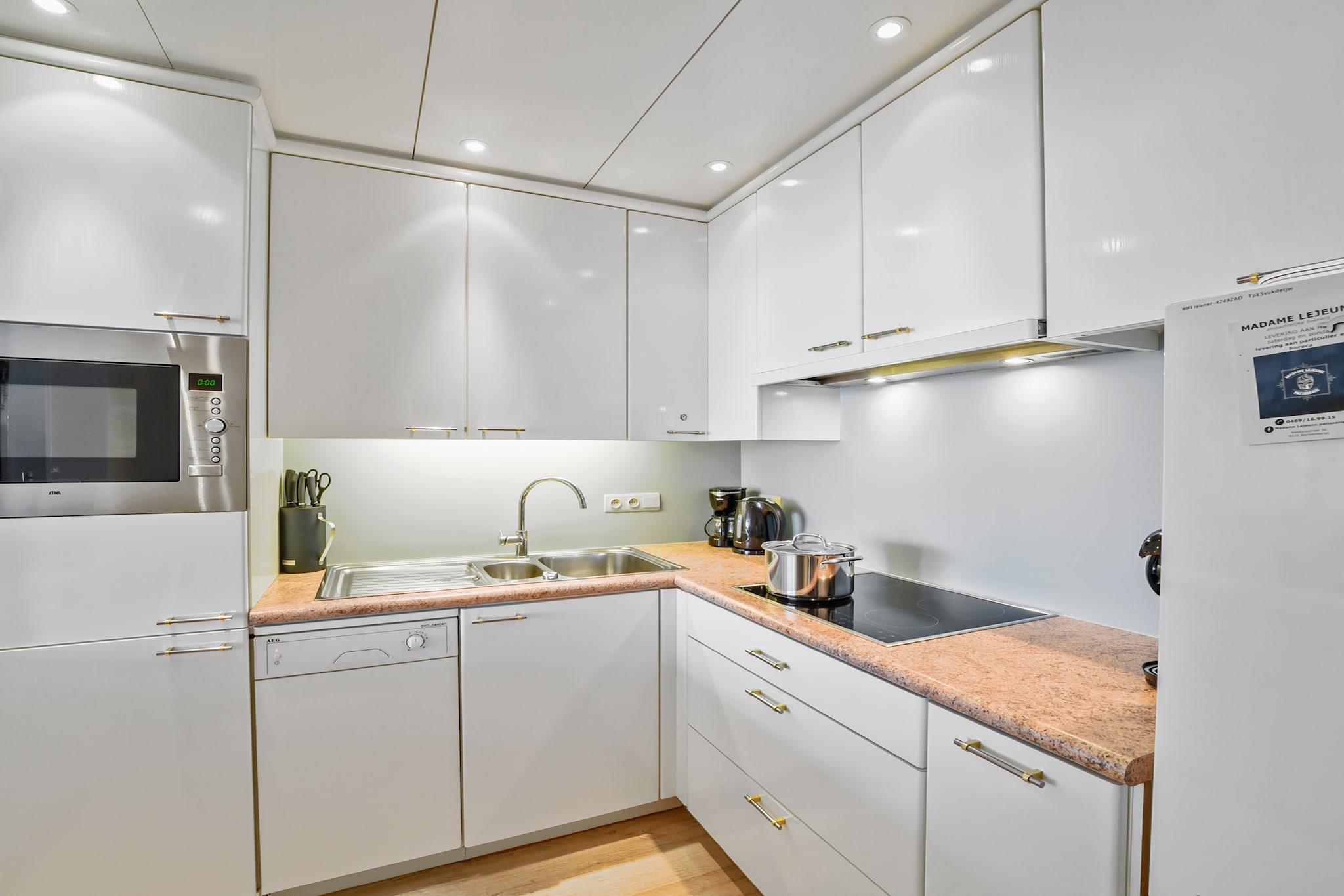 Denne moderne og luksuriøst indrettede 2-værelses lejlighed i hjertet af Blankenberge tilbyder en raffineret kystflugt. Designet med avancerede materialer og elegante finish, er opholdsstuen i åbent plan badet i naturligt lys fra store vinduer, hvilket skaber et lyst og indbydende rum. Begge soveværelser har indbyggede skabe og stilfuld indretning, hvilket sikrer et afslappende og behageligt ophold. Lejligheden kan prale af to fantastiske terrasser: en frontterrasse med panoramaudsigt over havet, perfekt til morgenkaffe og solopgange, og en sydvendt terrasse, der inviterer dig til at sole dig i solen hele dagen. Med rigelig plads til udendørs siddepladser tilbyder begge terrasser de ideelle rammer til at slappe af og nyde kyststemningen. Kun en kort gåtur fra stranden er denne lejlighed perfekt placeret til at udforske Blankenberges højdepunkter, herunder havnen, Sea Life Marine Park og Belle Epoque Center. Den nærliggende kystsporvogn gør det nemt at besøge andre charmerende kystbyer langs den belgiske kyst. Uanset om du søger afslapning eller eventyr, tilbyder denne lejlighed en stilfuld og fredfyldt base for din ferie.