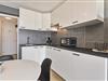 På 8. etage: (Stue(dobbeltsovesofa(140 x 200 cm), Fjernsyn(fladskærm, digital), spisebord), åbent køkken(kogeplade(elektrisk), elkedel, brødrister, kaffemaskine, ovn, mikrobølgeovn, køle-fryseskab, Saftpresser), soveniche(køjeseng(dynebetræk, 90 x 200 cm), køjeseng(dynebetræk, 90 x 200 cm)), badeværelse(bruser, håndvask, toilet)) terrasse, cykelopbevaring, havemøbler, elevator