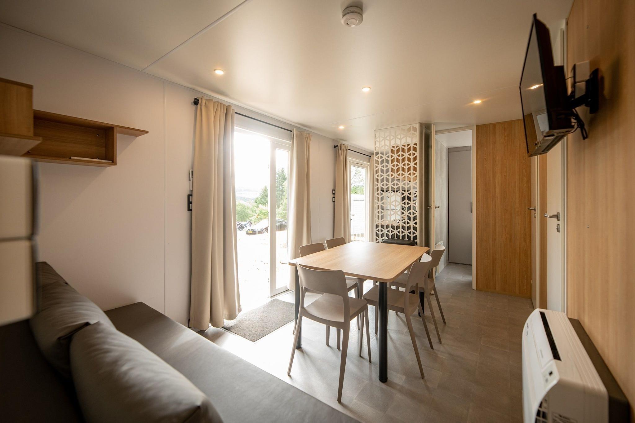 Charmerende ophold midt i Ardennernes grønne områder Gemt i det smukke landskab på Camping Petite Suisse tilbyder dette fritliggende mobilehome et fredeligt tilflugtssted for naturelskere og familier. Designet til komfort med et luftigt layout og aircondition, det har en dejlig privat terrasse med havemøbler og parasol - perfekt til at slappe af efter en dag med udforskning. Gæsterne kan nyde adgangen til den store, opvarmede udendørs swimmingpool, hvilket gør det til en ideel sommerferie. Naturvandringer og udendørs eventyr Beliggende kun 700 m fra frodige skovstier, er dette sted perfekt til naturskønne vandreture, morgenture med din hund eller cykeleventyr gennem de belgiske Ardenner. Gå ikke glip af Parc Chlorophylle, en nærliggende eventyrpark med skovtema, der er fantastisk til både børn og voksne. For mere natur, udforsk Ourthe-flodens dal eller besøg La Roche-en-Ardenne, en charmerende by med borgruiner og kajaksejlads. Lokale smagsoplevelser og restauranter i nærheden Du er kun 100 m fra hyggelige lokale restauranter og brasserier. Prøv Taverne Camping Petite Suisse for et afslappet måltid, eller nyd belgiske klassikere på La Petite Suisse Brasserie. Kæledyrsvenlige terrasser i nærheden byder velkommen til lodne ledsagere, så du ikke behøver at efterlade nogen, når du prøver Ardennernes solide køkken.