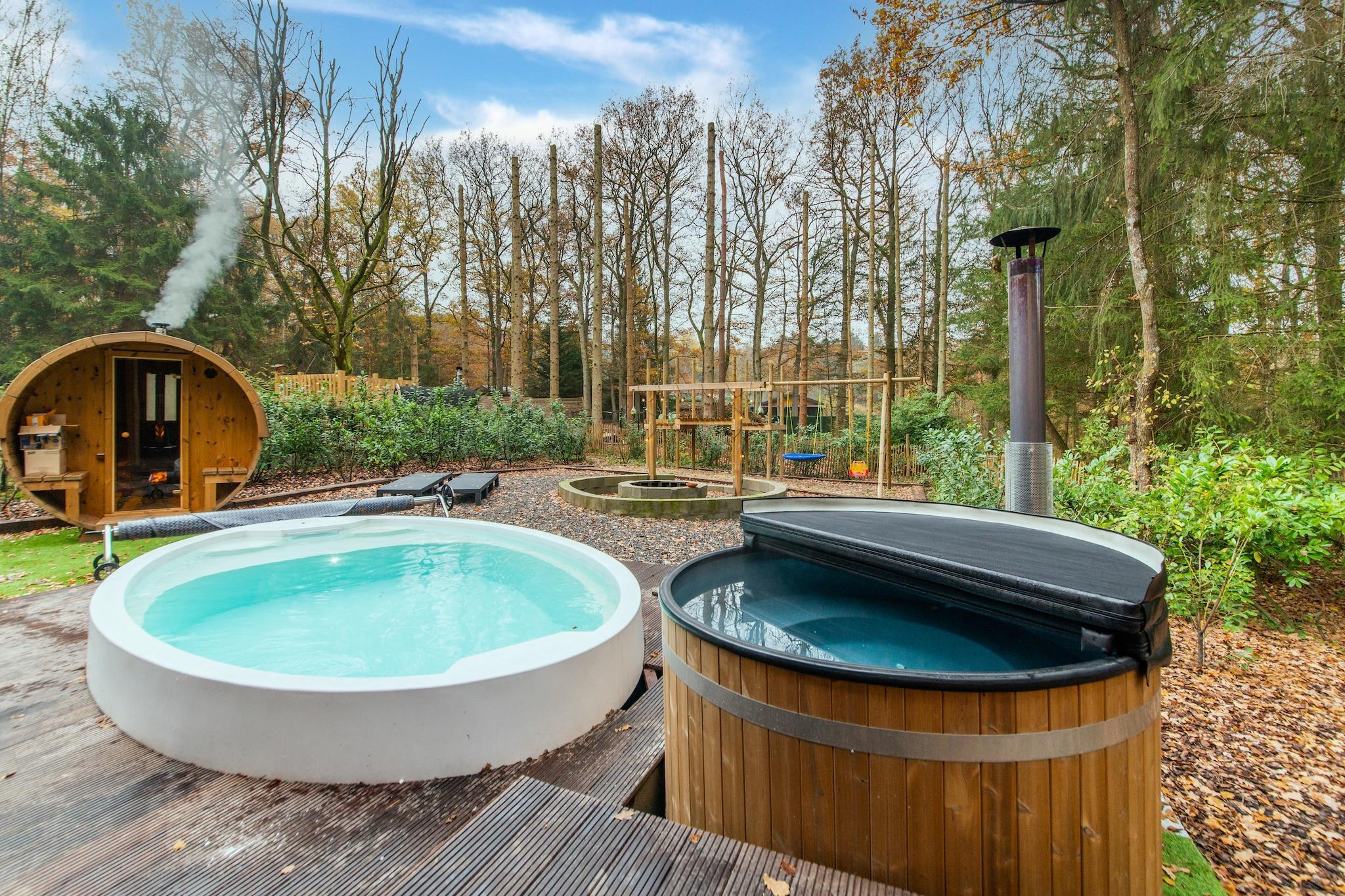 Stueetage: (åbent køkken(elkedel, kaffemaskine, ovn, mikrobølgeovn, opvaskemaskine , køle-fryseskab), stue / spisestue(Fjernsyn, spisebord, kakkelovn(træ), sofahjørne), Soveværelse med badeværelse(dobbeltseng, bruser, håndvask), Soveværelse med badeværelse(dobbeltseng, bruser, håndvask), toilet(toilet), toilet(toilet), sal, pulterkammer(tørretumbler, vaskemaskine)) hottub, sauna(privat), terrasse(overdækket), have(privat, indhegnet), havemøbler, Parasol, swimmingpool(privat, opvarmes), legeredskaber, loungemøbler, Ladestation til el-biler, baby crib(free)