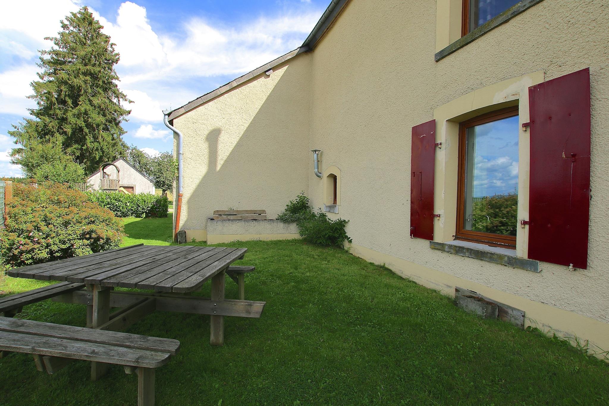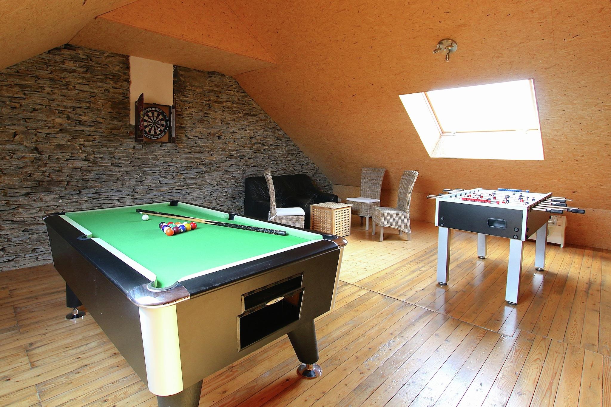 Denne indbydende villa i Harfontaine tilbyder et komfortabelt og veludstyret ophold for familier eller grupper. Fordelt på tre etager har det flere soveværelser, en hyggelig stue med pejs og stereoanlæg og et stort køkken med keramiske komfurer, ovn, mikroovn og opvaskemaskine. Gæsterne kan nyde to badeværelser, et fitnessrum med bordtennis og et afslapningsområde på øverste etage med billard og bordfodbold. Den indhegnede have omfatter en gårdhave, terrasse, udekøkken, grill og legeredskaber, perfekt til både fritid og familiehygge. Yderligere faciliteter omfatter centralvarme, brændeovn, vaskemaskine, køleskab med fryser, cykelopbevaring og privat parkering. En høj stol og strygebræt tilføjer bekvemmelighed, mens layoutet sikrer privatliv og plads til alle. Uanset om I laver mad sammen, slapper af ved bålet eller nyder spil indendørs og udendørs, er denne villa designet til mindeværdige gruppeophold. I nærheden kan du udforske de historiske skiferbrud i Warmifontaine, eller besøge Lavoir de Harfontaine, et restaureret vaskehus, der fremviser lokal arv. Naturelskere vil nyde Grande Forêt d'Anlier, mens kulturelle entusiaster kan tage til Neufchâteau for butikker og museer. Spisemulighederne omfatter La Roseraie for raffineret belgisk køkken og Le Saint-Christophe for regionale specialiteter.
