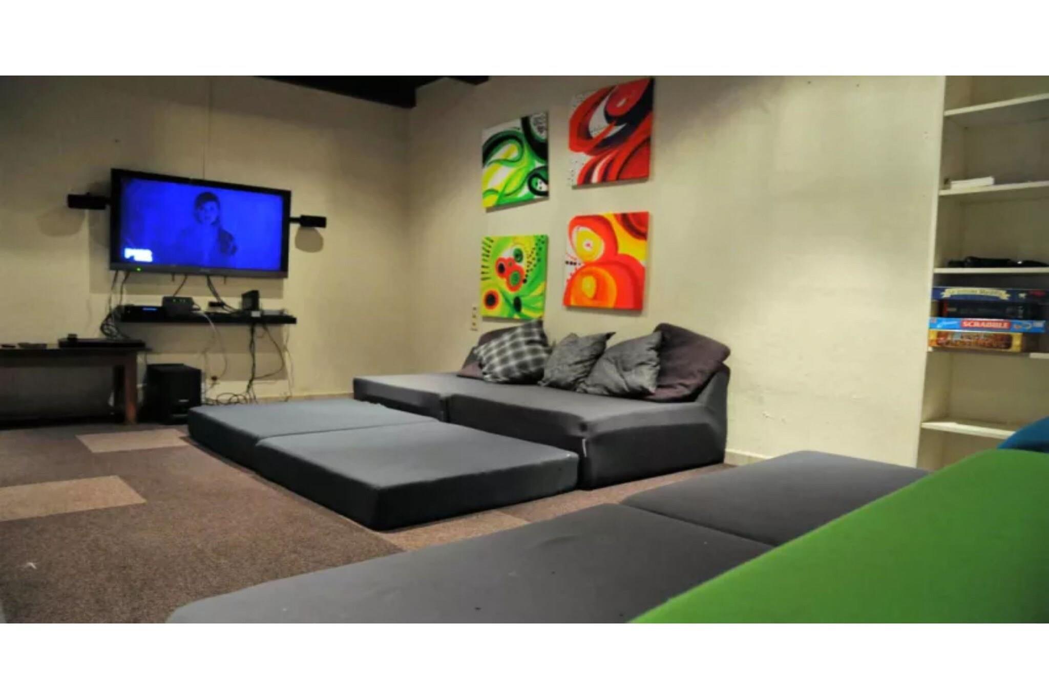 Stueetage: (Stue(Fjernsyn(fladskærm), kakkelovn(træ), 2x sofahjørne, DVD-afspiller), spisestue(spisebord, pejs, bar(spise bar)), Køkken(komfur(Komfur med otte kogeplader, elektrisk), ovn, mikrobølgeovn, 2x opvaskemaskine , 2x køle-fryseskab, tørretumbler, vaskemaskine), toilet) På 1. etage: (soveværelse(2x enkeltseng), soveværelse(2x enkeltseng), soveværelse(2x enkeltseng), soveværelse(2x enkeltseng, håndvask), soveværelse(2x enkeltseng, håndvask), soveværelse(2x enkeltseng, håndvask), soveværelse(3x køjeseng), badeværelse(bruser, håndvask, toilet), badeværelse(bruser, håndvask, toilet), badeværelse(bruser, 2x håndvask, toilet)) Loft: (soveværelse(6x enkeltseng)) hottub, sauna, varme(central), terrasse, have, havemøbler, grill, parkering, legeredskaber, bordtennisbord, barneseng
