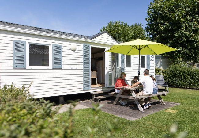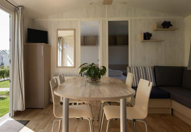 The Comfort Chalet for 4 people at Holiday Park Klein Strand offers a pleasant and practical base for a relaxing stay. The chalet has two bedrooms and is furnished with a cosy living area and an open kitchen that includes, among other things, a microwave. The bathroom is equipped with a shower, toilet and washbasin. Outside, you can enjoy a spacious terrace with garden furniture, located on a plot of at least 125 m²..