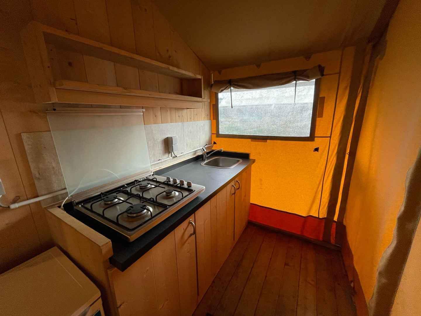 Discover our beautiful glamping for four people at Recreational Domain Klein Strand, located just 15 minutes drive from historic Bruges. The spacious tent combines the true camping feeling with luxurious comfort and offers a cosy living space with a pellet stove for snug evenings, a fully equipped kitchen including a Senseo coffee machine, a modern bathroom with rain shower and two comfortable bedrooms – one with a double bed and one with two separate beds. On the spacious, covered terrace, comfortable lounge furniture invites you to relax outdoors..