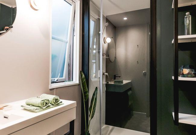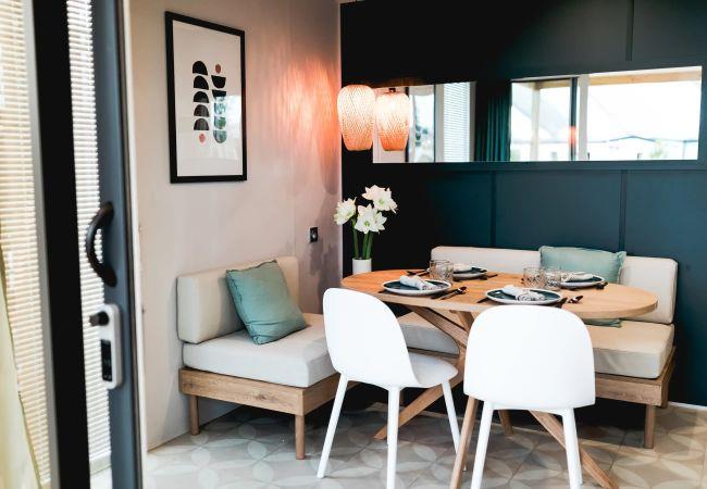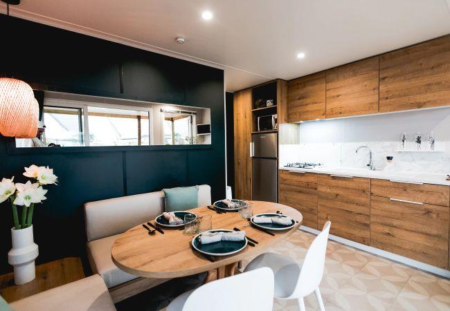 The house accommodates up to four people and features a modern interior, two bedrooms, a fully equipped kitchen, and a cosy living space. Thanks to the private terrace and quiet location, you can relax here wonderfully – whether you choose breakfast in the morning sun or a long summer evening with a view of the greenery.