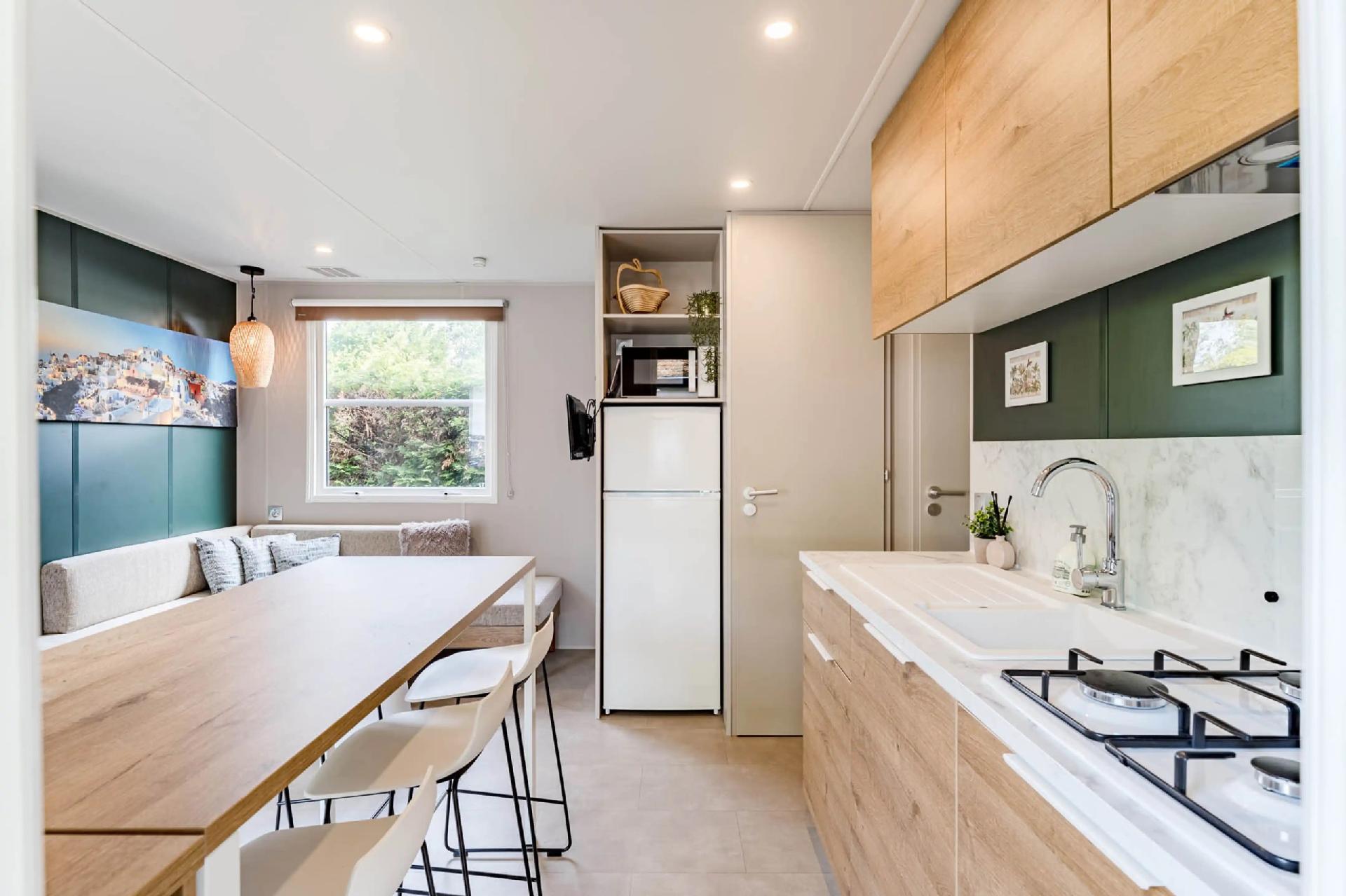 The house accommodates up to six people and features a modern interior, three bedrooms, a fully equipped kitchen, and a cosy living space. Thanks to the private terrace and quiet location, you can relax here wonderfully – whether you choose breakfast in the morning sun or a long summer evening with a view of the greenery.