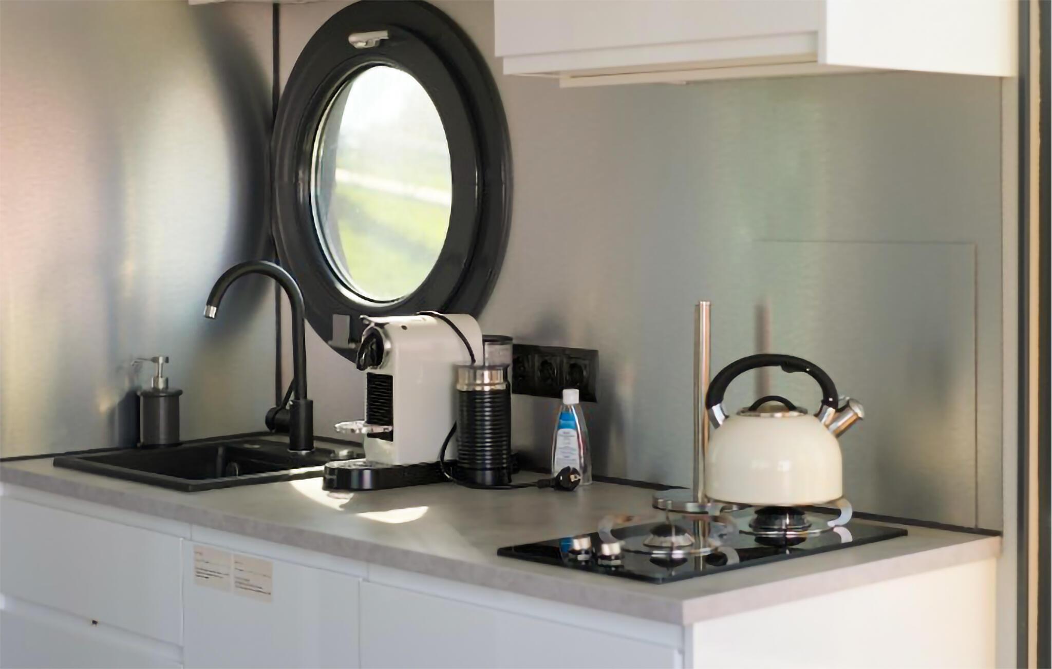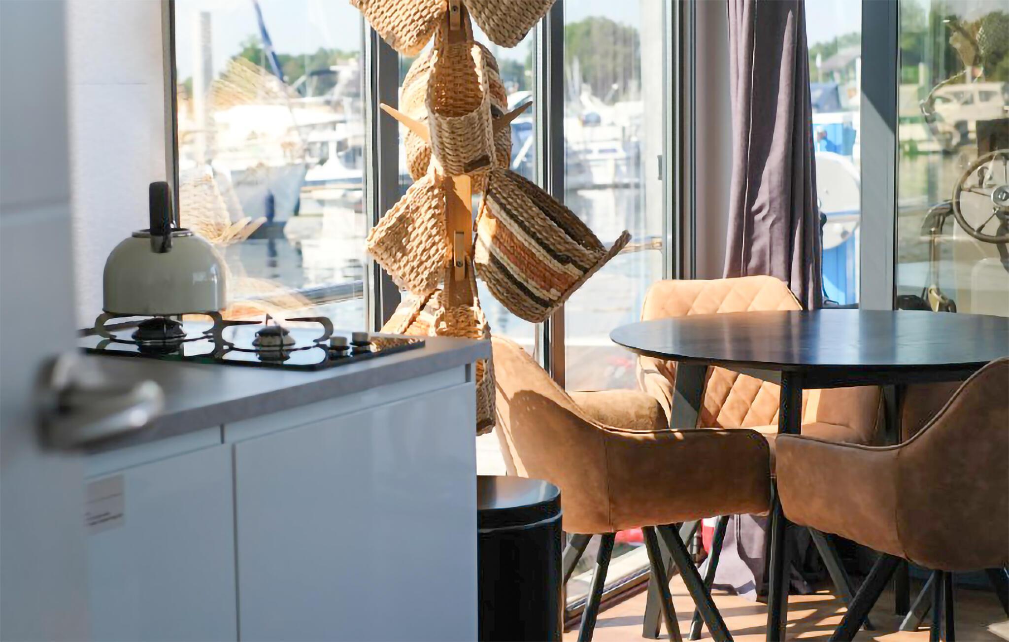Gør jer klar til en familieferie ud over det sædvanlige i denne moderne husbåd med en dejlig terrasse.