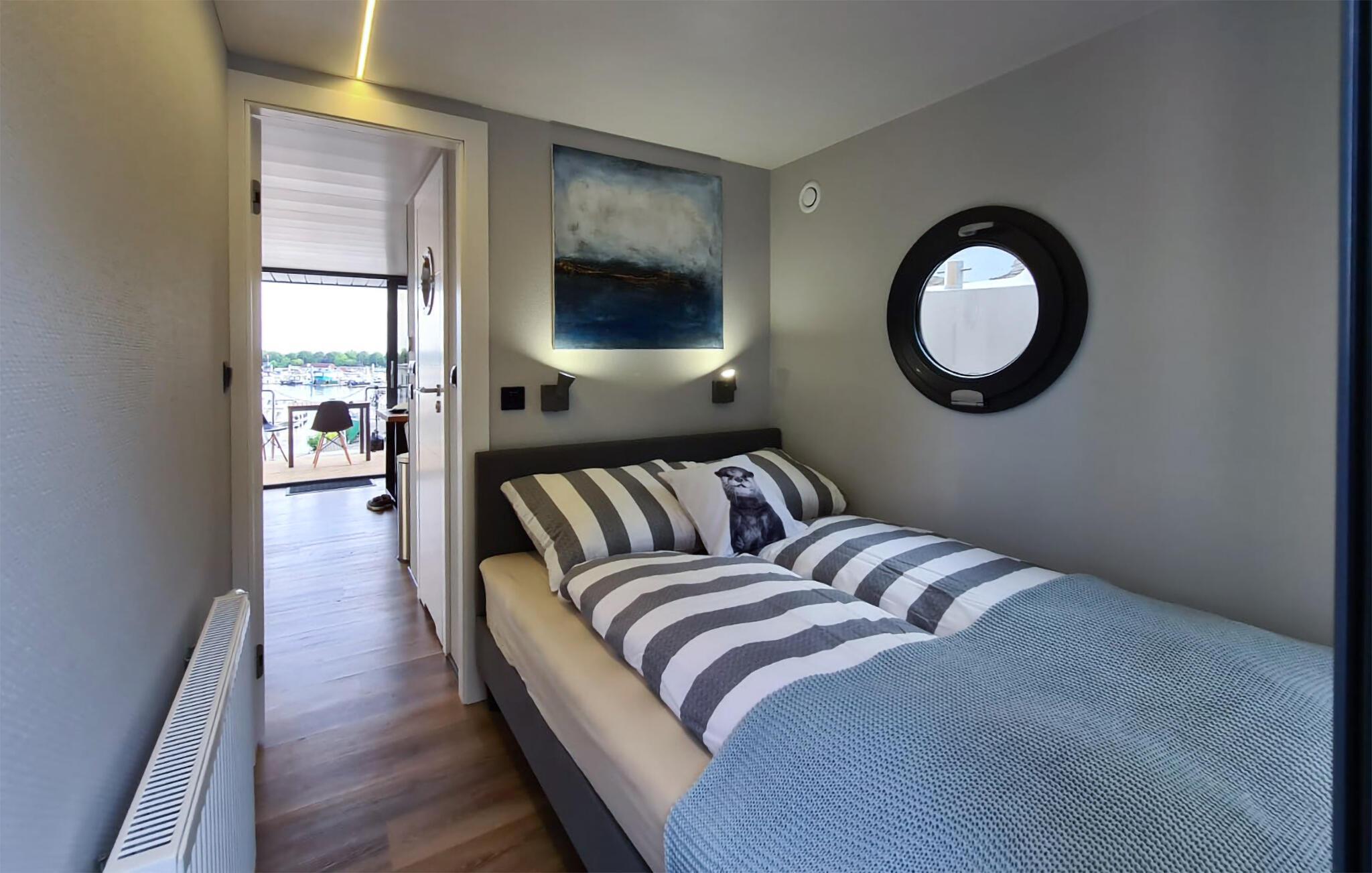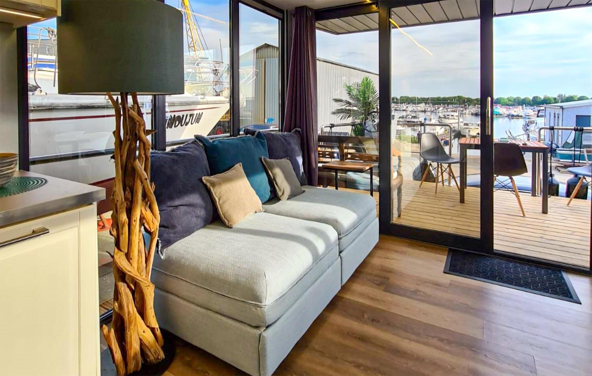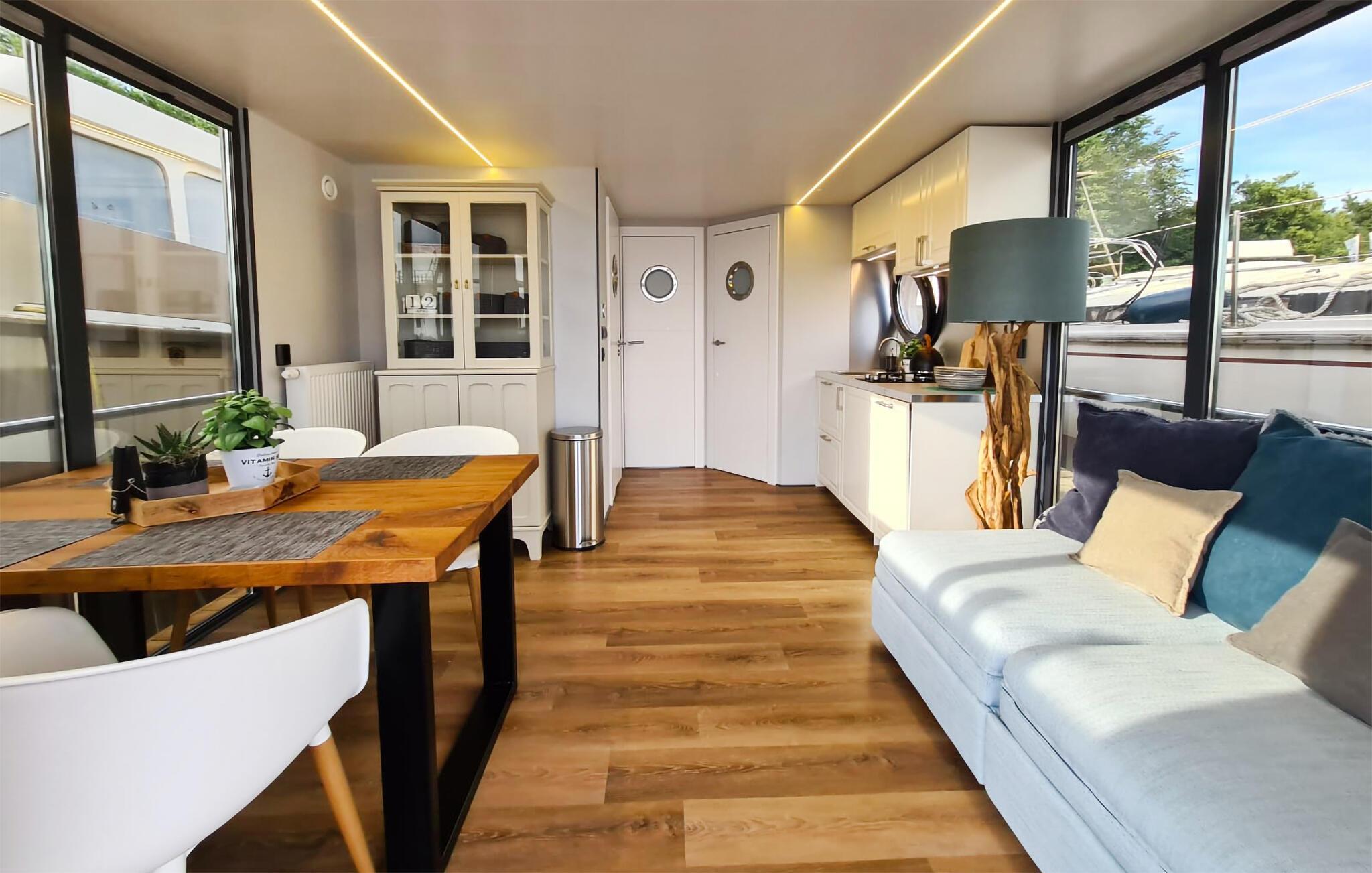 Gør jer klar til en familieferie ud over det sædvanlige i denne moderne husbåd med en dejlig terrasse.