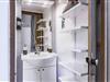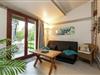 Stueetage: (sofastue(dobbeltsovesofa(140 x 200 cm), Fjernsyn, DVD-afspiller, terrasse), spisestue(kakkelovn), Køkken(mikrobølgeovn, køle-fryseskab), soveværelse(dobbeltseng(140 x 200 cm)), badeværelse(bruser, håndvask, toilet, gaspejs)) loungerum(deles med andre gæster)(infrarød sauna, fitnessapparater), loungerum(bruser, sauna), toilet, varme(gas), have(privat), havemøbler, grill, trampolin(deles med andre gæster), legeredskaber(deles med andre gæster)