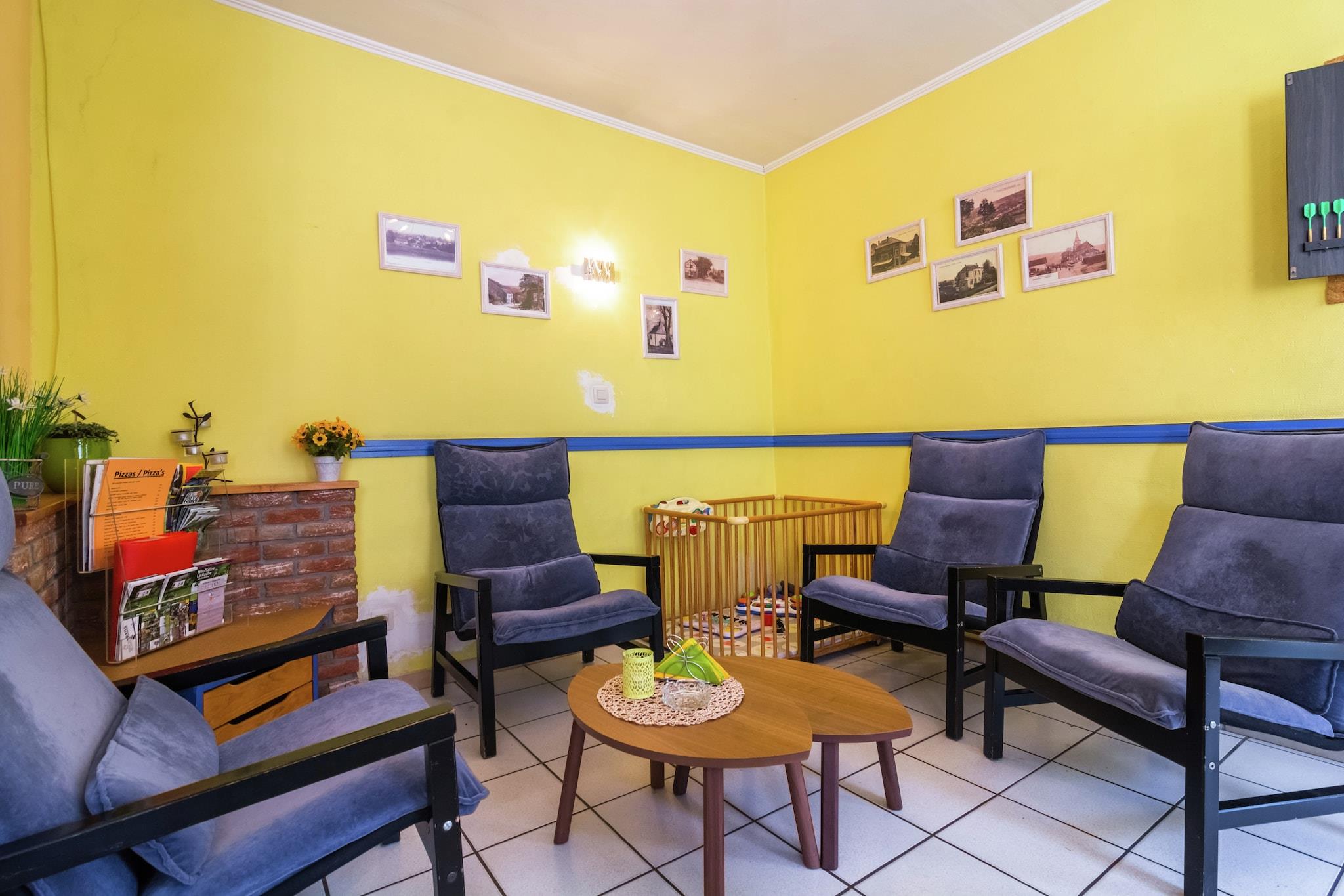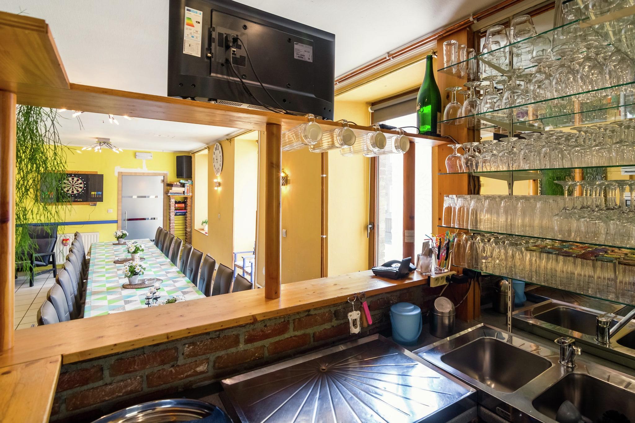Dette rummelige feriehus med 8 soveværelser har komfortabel plads til op til 20 gæster og ligger i den naturskønne Ourthe-dal i Marcourt Ardennerne. Omgivet af natur er det en ideel base for friluftsentusiaster med fremragende muligheder for mountainbiking, kajaksejlads og klatring i det nærliggende område. En sø ligger kun 15 km væk og tilbyder yderligere fritidsaktiviteter. Ejendommen er bekvemt placeret tæt på populære turistbyer som La Roche, Hotton og Durbuy, som alle er perfekte til hyggelige dagsture. Restauranter findes inden for 1 km fra huset, mens butikker og dagligvarer er tilgængelige 3 km væk. Hjemmet har en stor have med havemøbler, en terrasse og en grill, hvilket gør det perfekt til gruppesammenkomster og afslappet udendørs spisning. Det er designet med familier i tankerne, er børnevenligt og udstyret med en børneseng, høje stole, et babybadekar og en kravlegård. Til indendørs underholdning kan gæsterne nyde to barer og en dartskive. Op til tre kæledyr er velkomne gratis, hvilket gør dette til et fremragende valg for gæster, der rejser med dyr. Liège Lufthavn ligger cirka 65 km væk, hvilket sikrer nem adgang, mens du nyder et fredeligt tilflugtssted på landet.