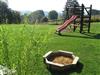 Large south-facing terrace, distant views, plenty of privacy. Lawn with play equipment including a swing, slide, sandbox, and trampoline. Large barbecue available. Ample private parking for 10+ cars.