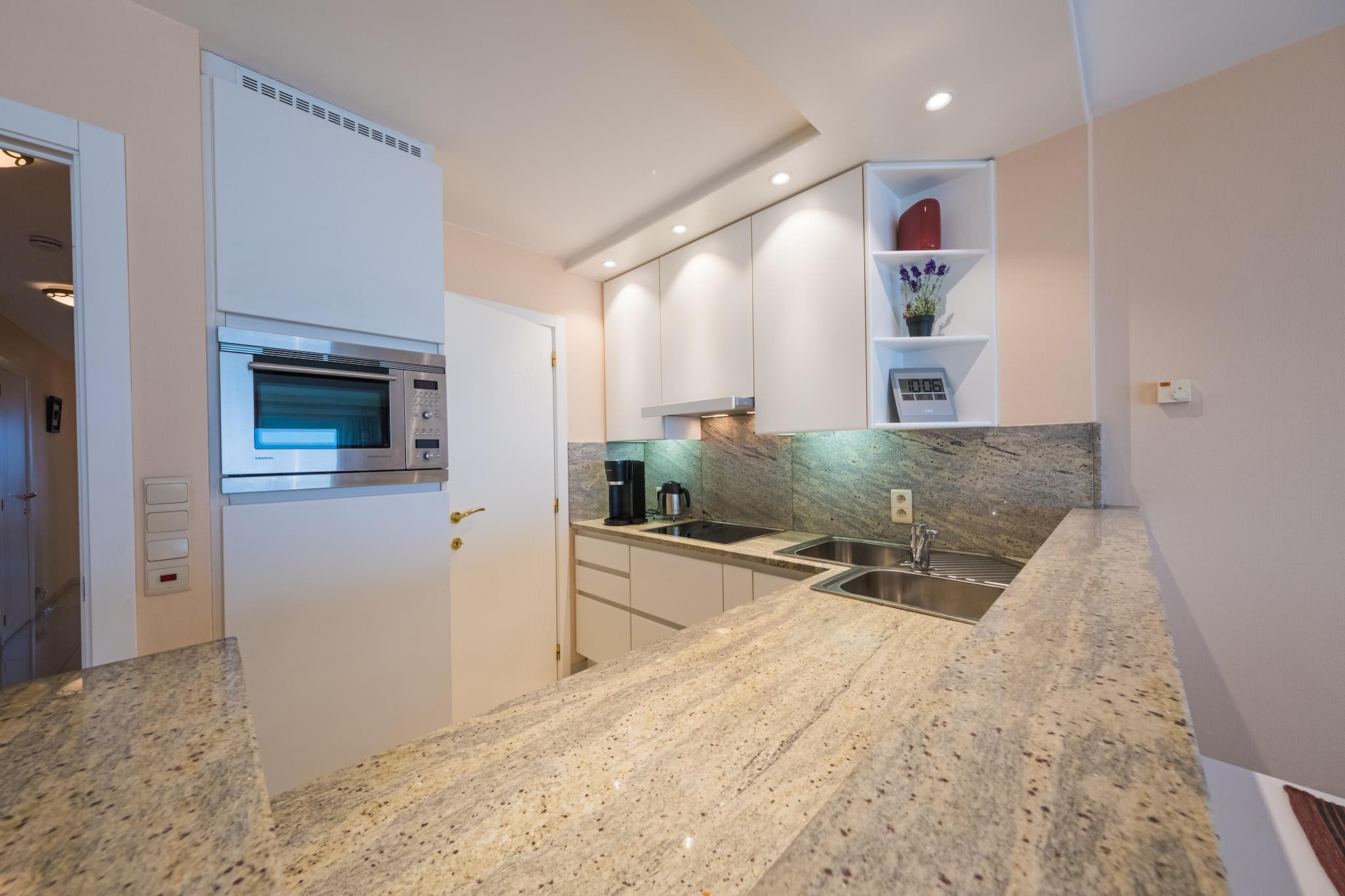 Denne rummelige lejlighed på 5. sal ligger kun få skridt fra stranden og tilbyder panoramaudsigt over havet og et hyggeligt, veludstyret interiør - ideel til familier eller grupper på op til 7 gæster. Med to soveværelser med dobbeltsenge, en sovesofa til to og en ekstra sovesofa til én, er der masser af plads til at slappe af og slappe af. Den forreste terrasse er perfekt til at nyde solnedgange over Vesterhavet. Lejligheden har et fuldt udstyret åbent køkken, to badeværelser - det ene med badekar og dobbelt håndvask, det andet med bruser - og et generøst opbevaringsrum med garderobeskabe og et ekstra køleskab med fryser. En anden terrasse på bagsiden tilbyder et roligt sted til morgenkaffe. WiFi og en inkluderet garage tilføjer til bekvemmeligheden. Bemærk venligst: facaderenovering er i gang i en nærliggende bygning (Zeedijk 190) indtil 30/06/2025, hvilket kan forårsage støj eller støv. På trods af dette forbliver lejligheden en førsteklasses beliggenhed tæt på butikker, offentlig transport og den pulserende Middelkerke-promenade - perfekt til en ferie ved havet.