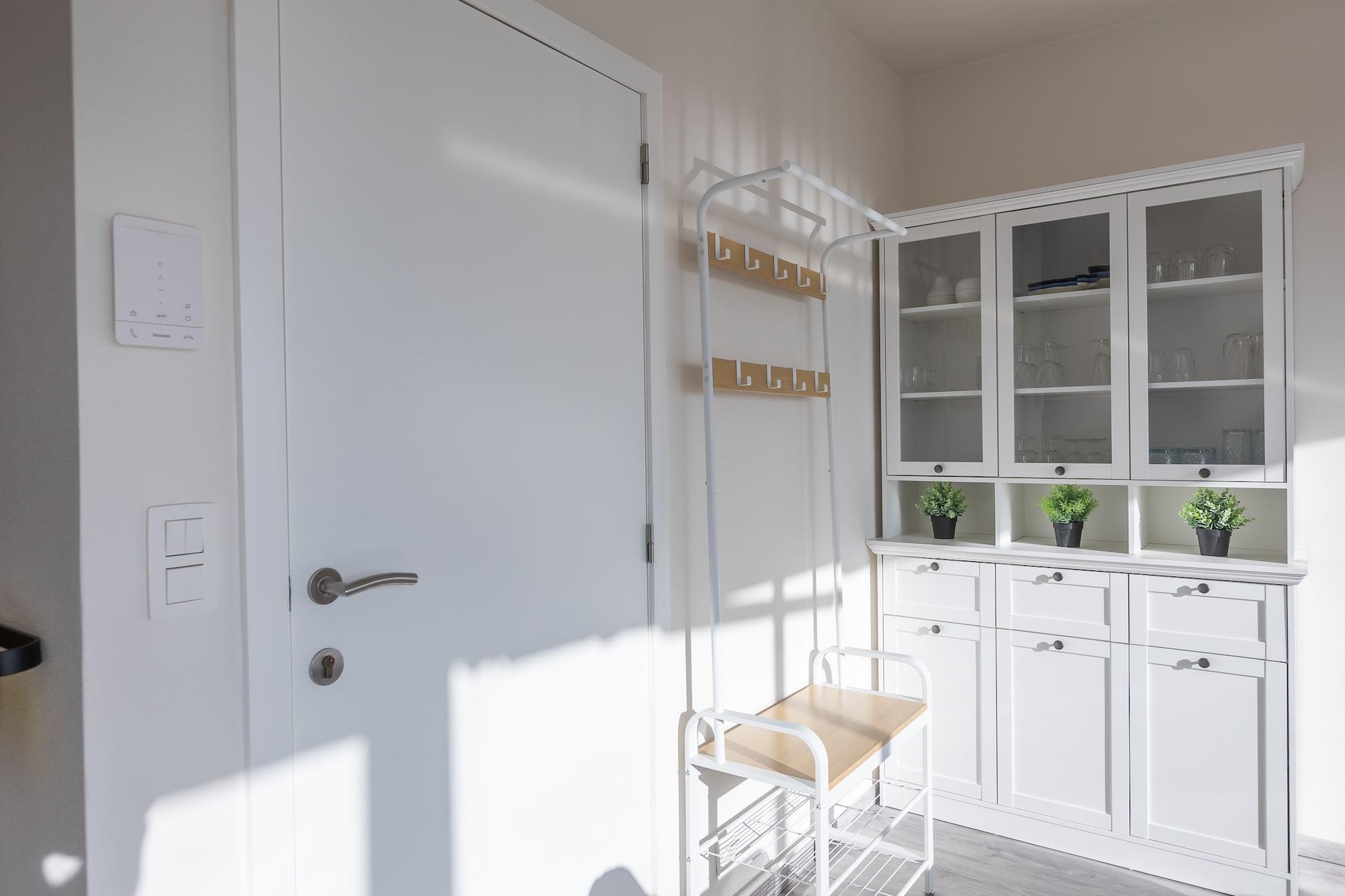 På 4. etage: (åbent køkken(elkedel, kaffemaskine, ovn, mikrobølgeovn, opvaskemaskine , køle-fryseskab, Blender, , ), stue / spisestue(dobbeltsovesofa(160 x 200 cm), Fjernsyn(digital), spisebord, radio), soveniche(dobbelt-foldeseng(dobbelt dynebetræk, 130 x 190 cm)), badeværelse(bruser, håndvask, toilet), toilet(toilet), pulterkammer) Internetadgang, varme(elektrisk), terrasse, elevator