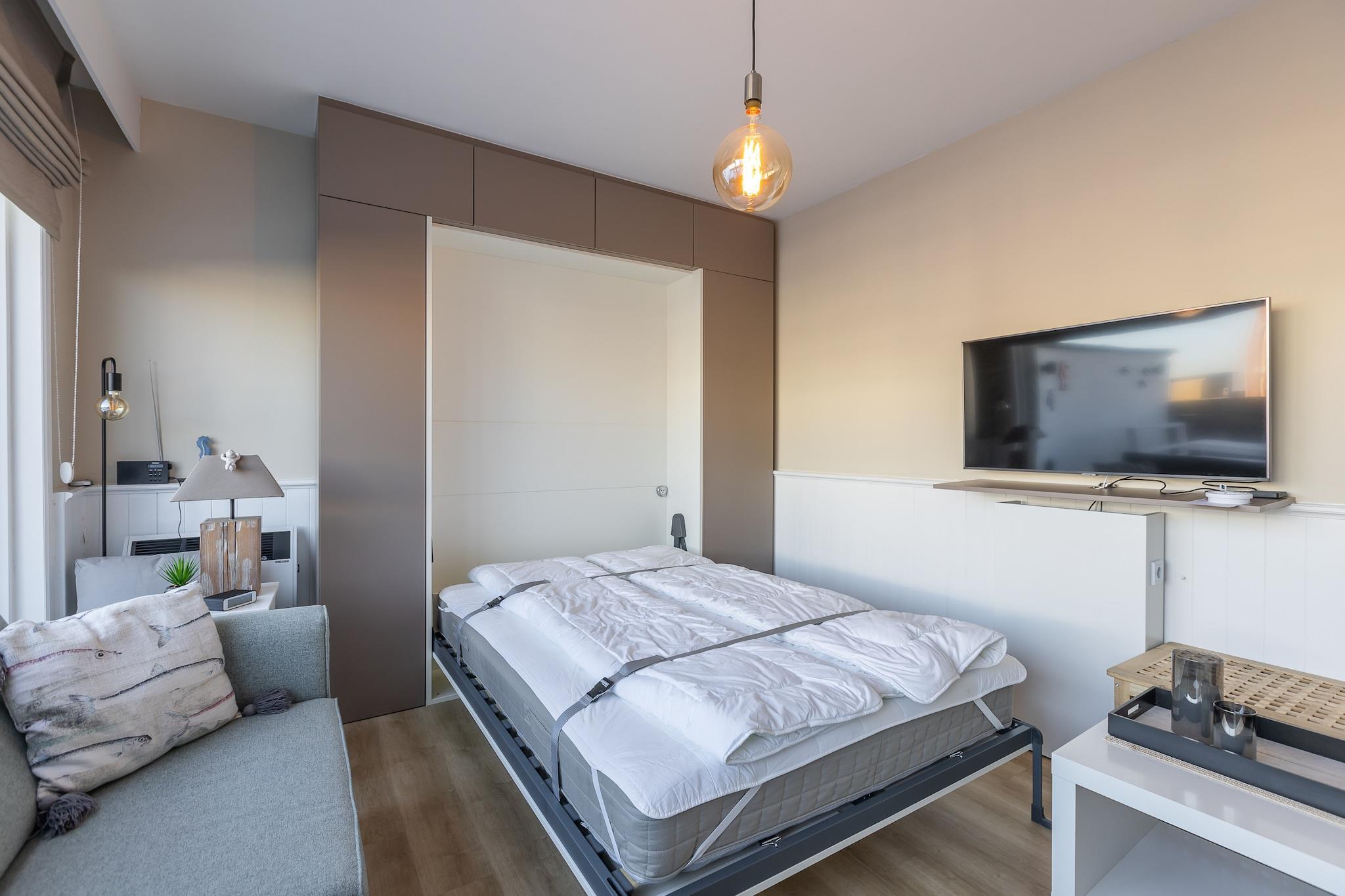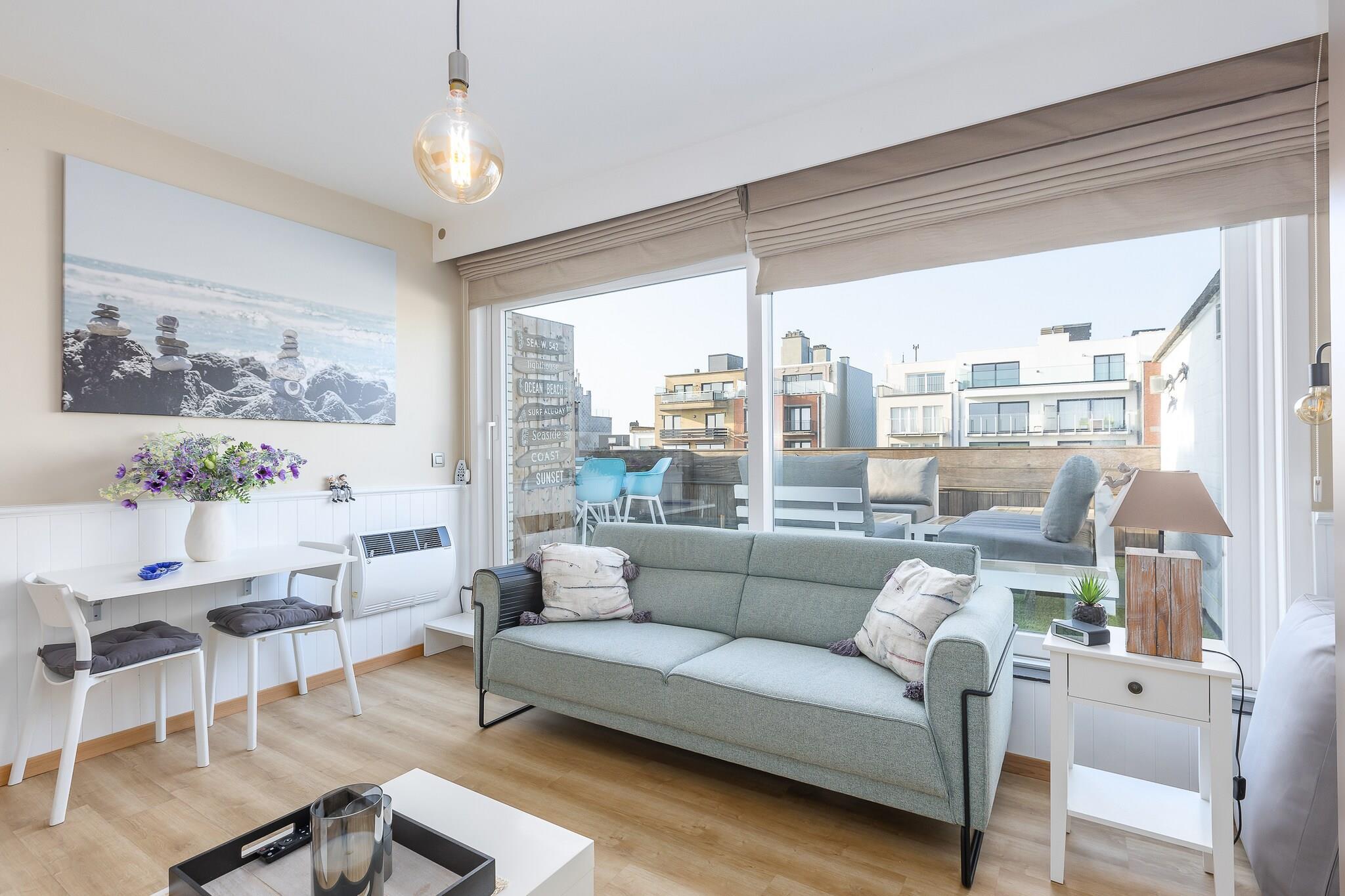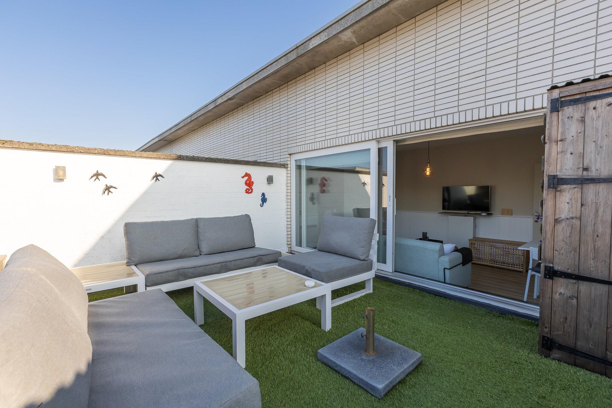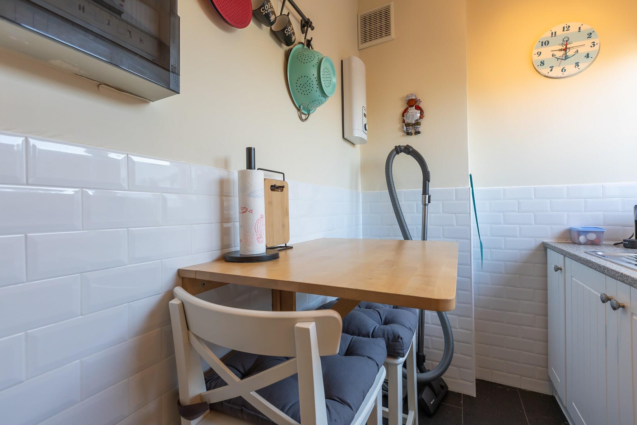 Beliggende på 8. sal i en velbeliggende bolig på Leopoldlaan 137, 8430 Middelkerke, tilbyder denne hyggelige taglejlighed en lys og indbydende plads til 2 gæster. Gulv-til-loft-vinduerne i stuen åbner direkte ud til en rummelig 34 m² solvendt terrasse, komplet med spisestue og loungemøbler, perfekt til at nyde solen eller nyde måltider under åben himmel. Lejligheden har en klapseng til to, et fuldt udstyret køkken og et badeværelse med bruser, toilet og vaskemaskine. Mens elevatoren når 7. etage, fører en kort trappe dig til dette fredelige oase på taget. Kombinationen af komfort og privatliv gør det til et ideelt sted for en afslappende ferie ved havet. Kun få skridt fra stranden og i gåafstand fra butikker, restauranter og sporvognsstoppestedet er denne lejlighed perfekt placeret til at udforske Middelkerke. Wi-Fi er inkluderet, men parkering er ikke, og gæster bedes venligst medbringe deres egne lagner og håndklæder. Uanset om du solbader eller slentrer langs promenaden, tilbyder denne tagperle en mindeværdig kystoplevelse.