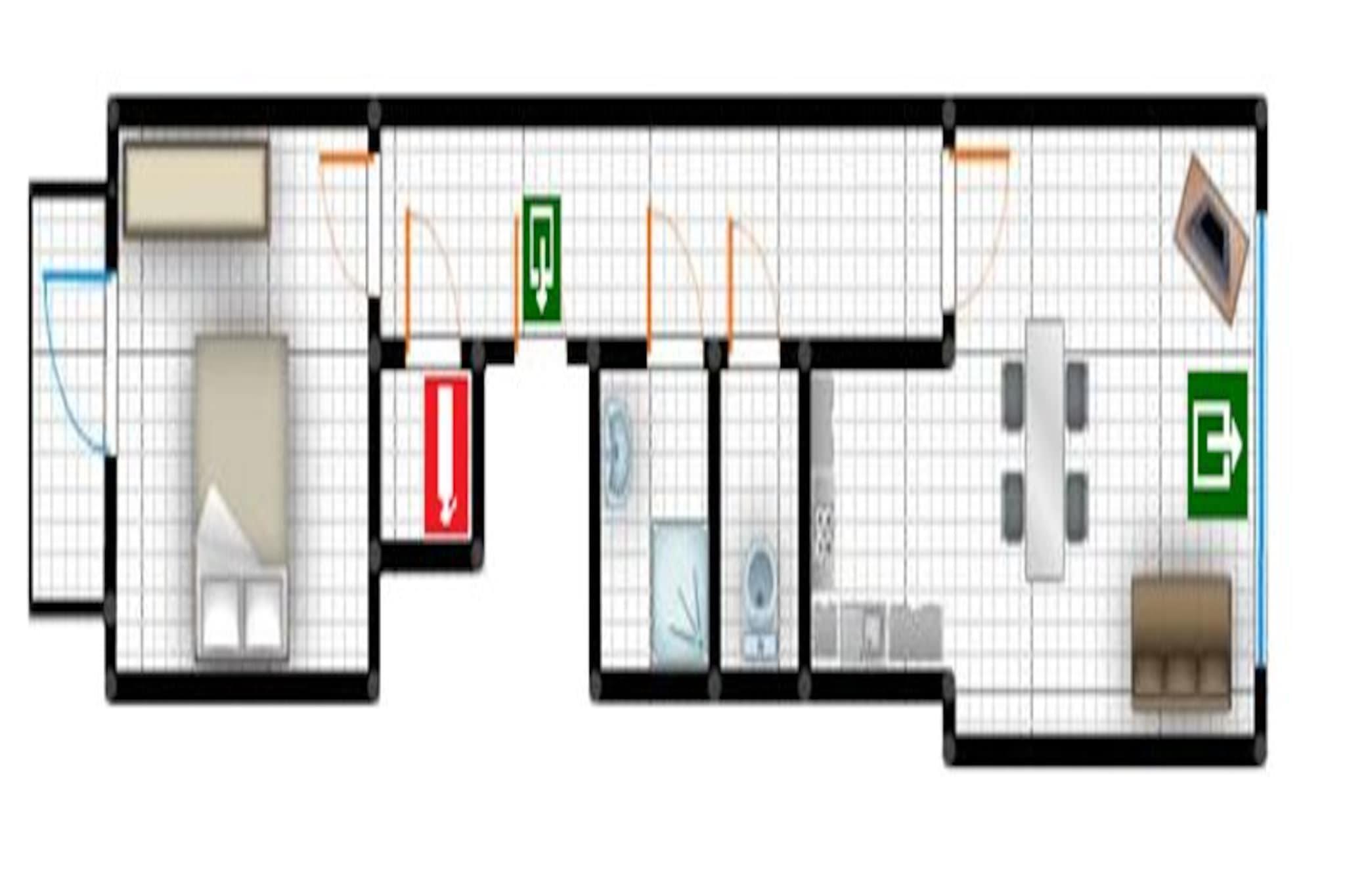 På 6. etage: (åbent køkken(kaffemaskine(kaffepude), ovn, mikrobølgeovn, køleskab), stue / spisestue(dobbeltsovesofa, Fjernsyn(digital), spisebord, sofahjørne, DVD-afspiller), soveværelse(dobbeltseng(dobbelt dynebetræk, 180 x 200 cm)), badeværelse(bruser, håndvask), toilet(toilet)) varme(gas), terrasse