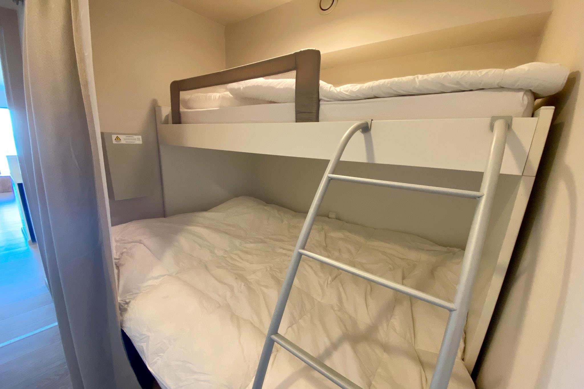 På 6. etage: (åbent køkken(kogeplade(elektrisk), emhætte, kaffemaskine, ovn, mikrobølgeovn, opvaskemaskine , køleskab(+ fryser)), stue / spisestue(dobbeltsovesofa(dobbelt dynebetræk, 140 x 200 cm), Fjernsyn(digital), sofahjørne, balkon eller terrasse), soveniche(3-etage-køjeseng(dynebetræk)), badeværelse(bruser, håndvask, toilet)) cykelopbevaring(deles med andre gæster), havemøbler, elevator