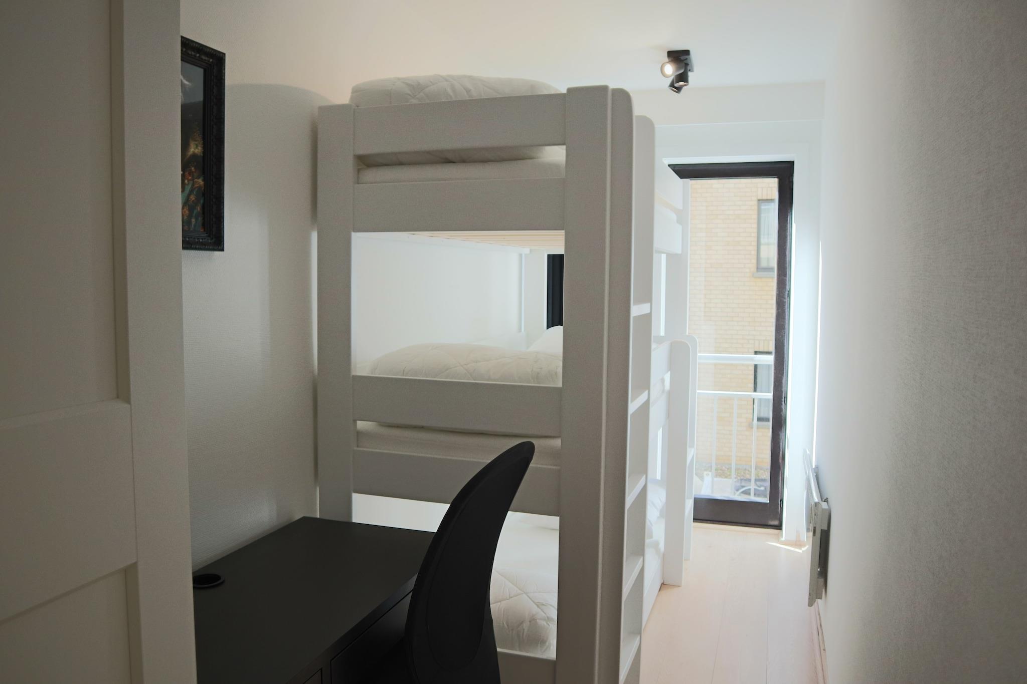 På 2. etage: (åbent køkken(komfur(elektrisk), kaffemaskine, combi-mikroovn, opvaskemaskine , køleskab(+ fryser)), stue / spisestue(Fjernsyn(digital), spisebord, sofahjørne), soveværelse(dobbeltseng(dobbeltdyne, dun, 160 x 200 cm)), soveværelse(3-etage-køjeseng(dyne, dun)), badeværelse(bruser, håndvask), toilet(toilet), pulterkammer) garage, vaskemaskine, terrasse, cykelopbevaring, havemøbler, parkering, elevator, strygebræt, strygejern, tørreskab