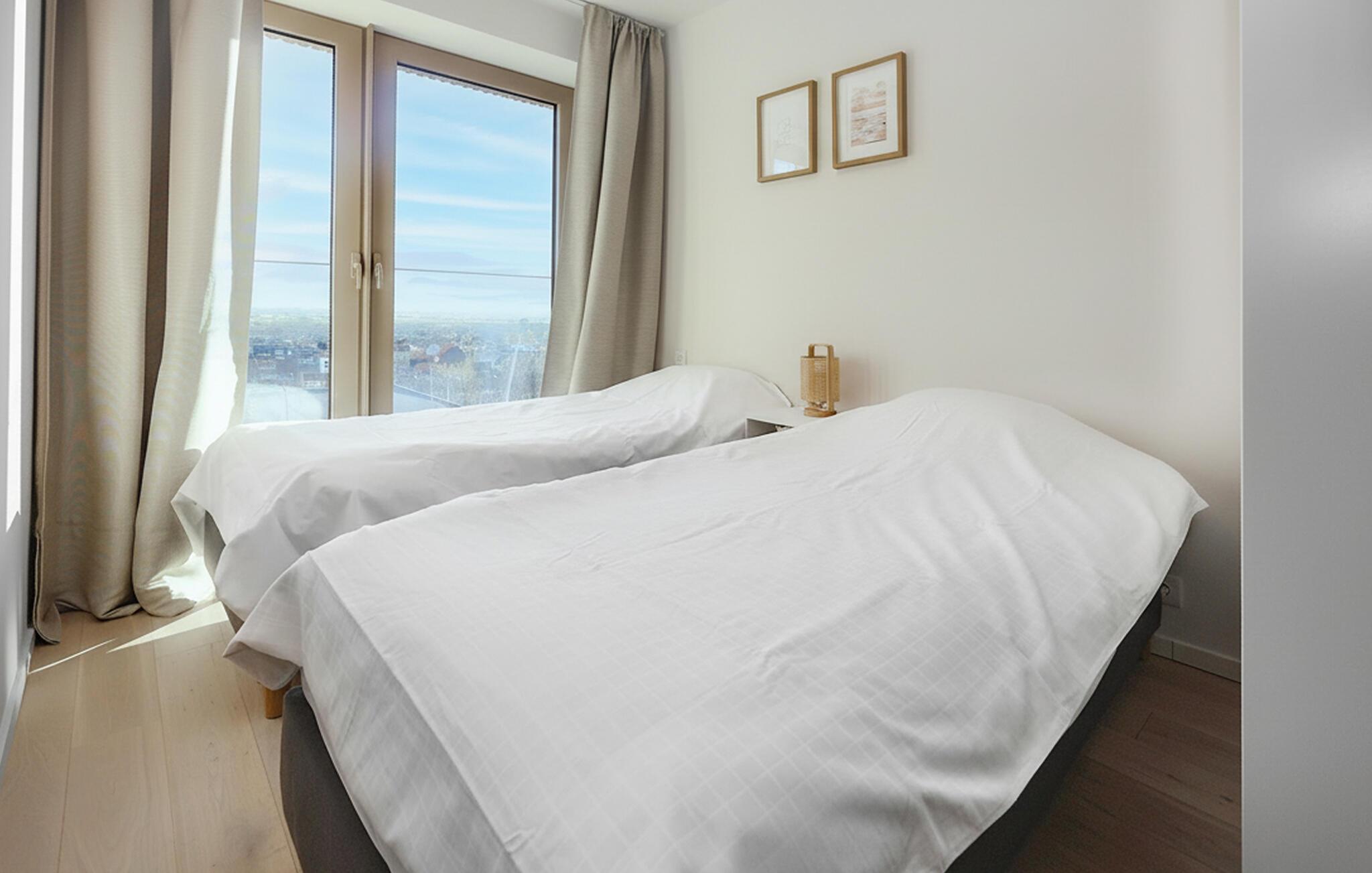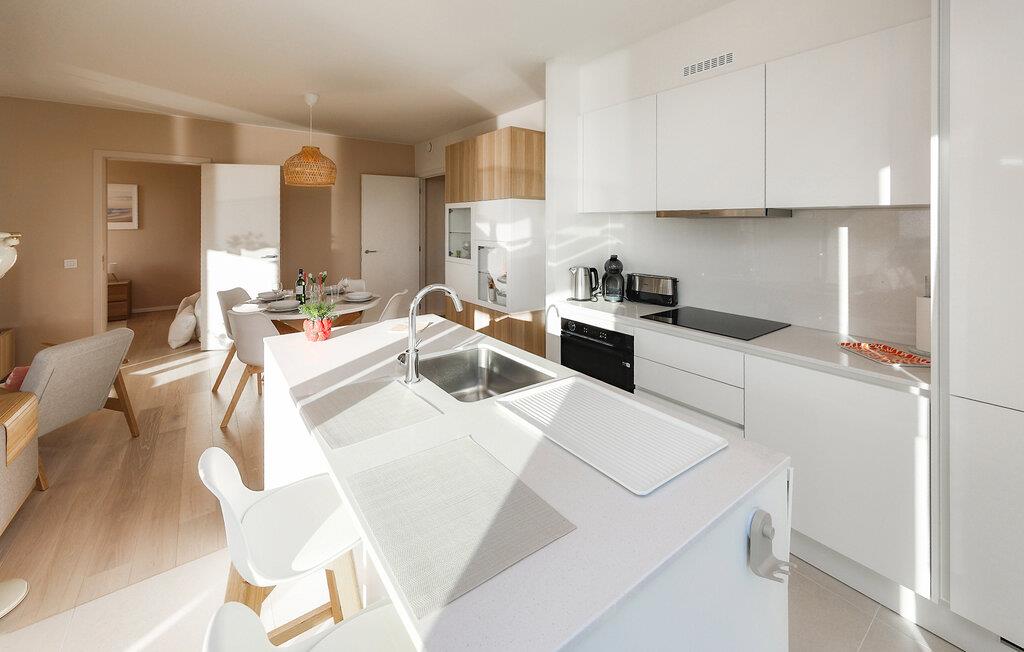 Denne lyse og smagfuldt møblerede lejlighed på 10. sal tilbyder et komfortabelt tilflugtssted for en afslappende pause ved havet. Skab lækre retter og nyd hyggelige måltider i den lyse opholdsstue. Om aftenen kan I slappe af i den indbydende stue, streame en film eller fordybe jer i en god bog.