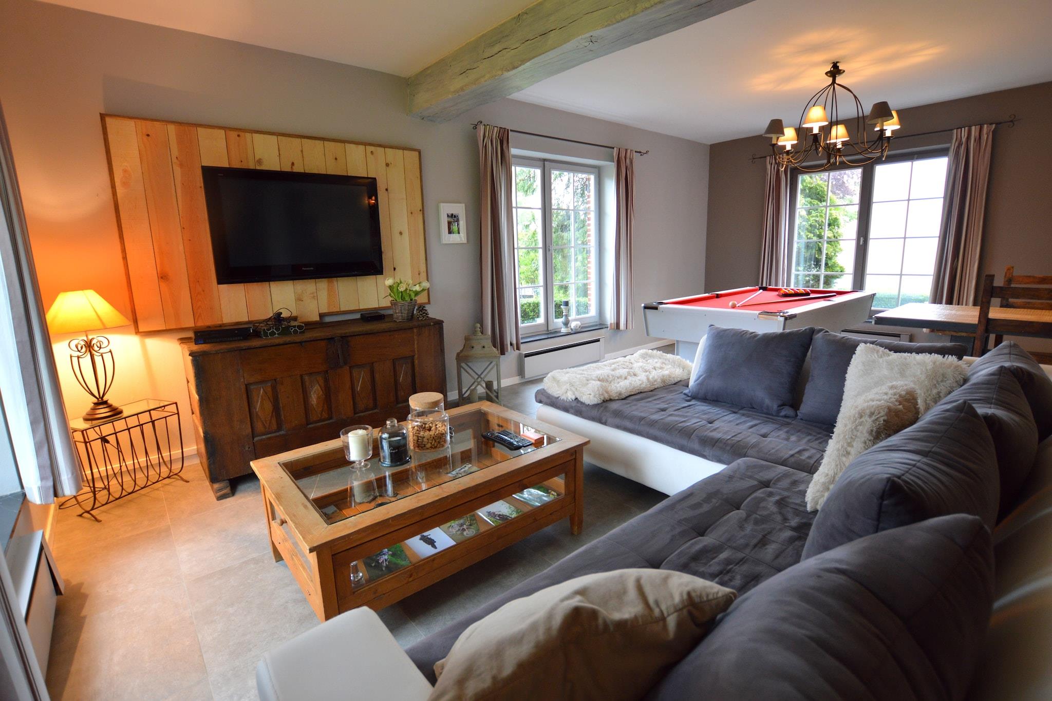 Meget smuk familiehus nær Herve Plateau. Der er en sauna på terrassen, hvor du kan nyde en smuk udsigt over det omkringliggende landskab eller en velsmagende grill! Interiøret er også fantastisk med et billardbord i stueetagen, en smuk tv-skærm, et meget stort spisebord og endda et gammelt roulette spil! På første sal tilbyder huset 4 smukke soveværelser og 2 badeværelser. På anden sal er et stort soveværelse perfekt til børn med tilstødende badeværelse. I området er der flere gåture, eller du kan besøge Liège, Verviers, Malmédy eller Herve i nærheden. Kort sagt, en perfekt familieferie!