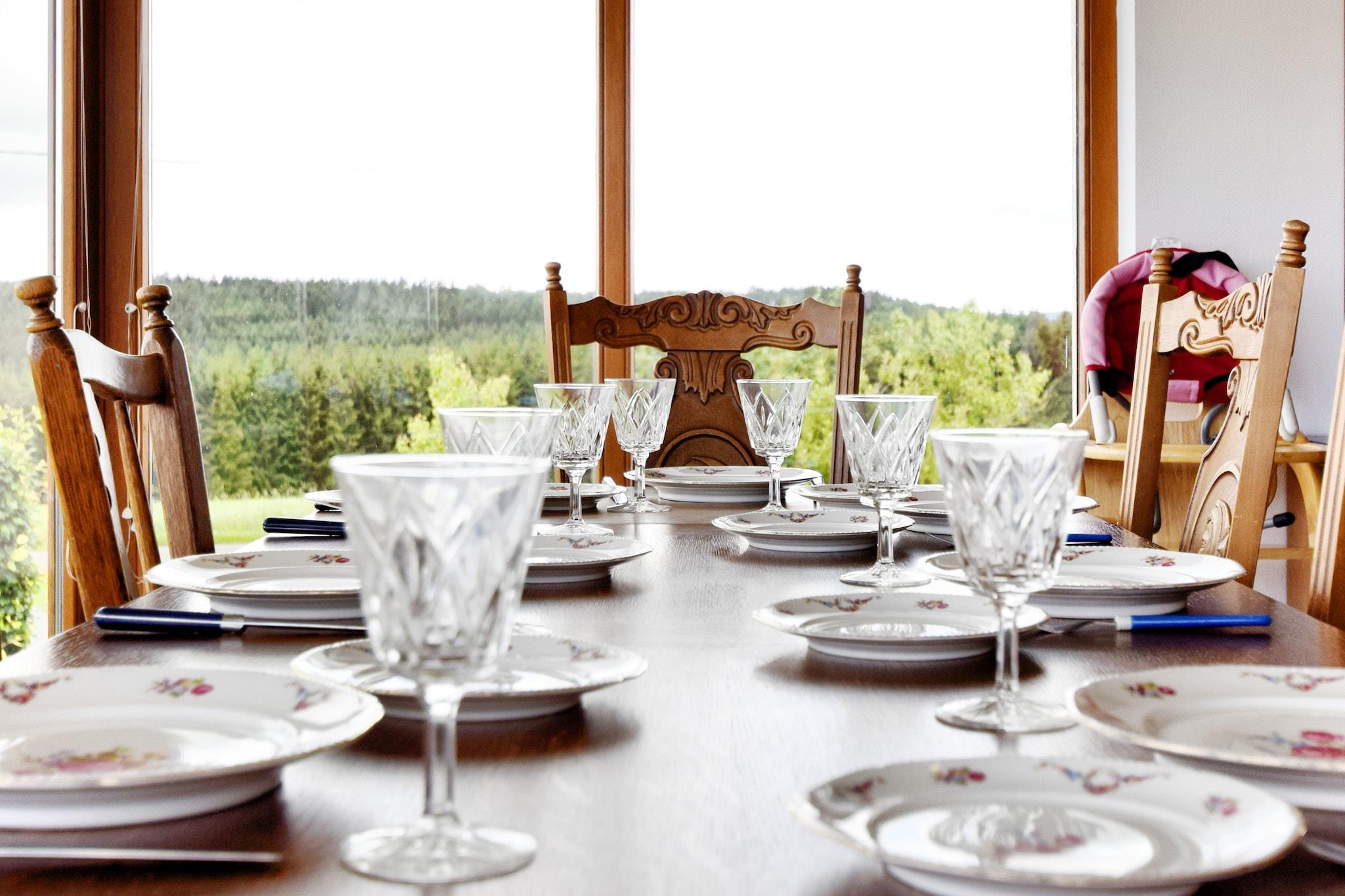Stueetage: (entre, Køkken(komfur(Komfur med fem kogeplader, gas), kaffemaskine, ovn, mikrobølgeovn, køle-fryseskab), stue / spisestue(Fjernsyn, kakkelovn), badeværelse(badekar, bruser, håndvask), toilet, havestue) På 1. etage: (soveværelse(dobbeltseng), soveværelse(dobbeltseng), soveværelse(2x enkeltseng), soveværelse(3x enkeltseng), toilet(håndvask)) opvaskemaskine , varme(central), terrasse, have(deles med ejer og andre gæster), grill, parkering, trampolin, legeredskaber, rutsjebane