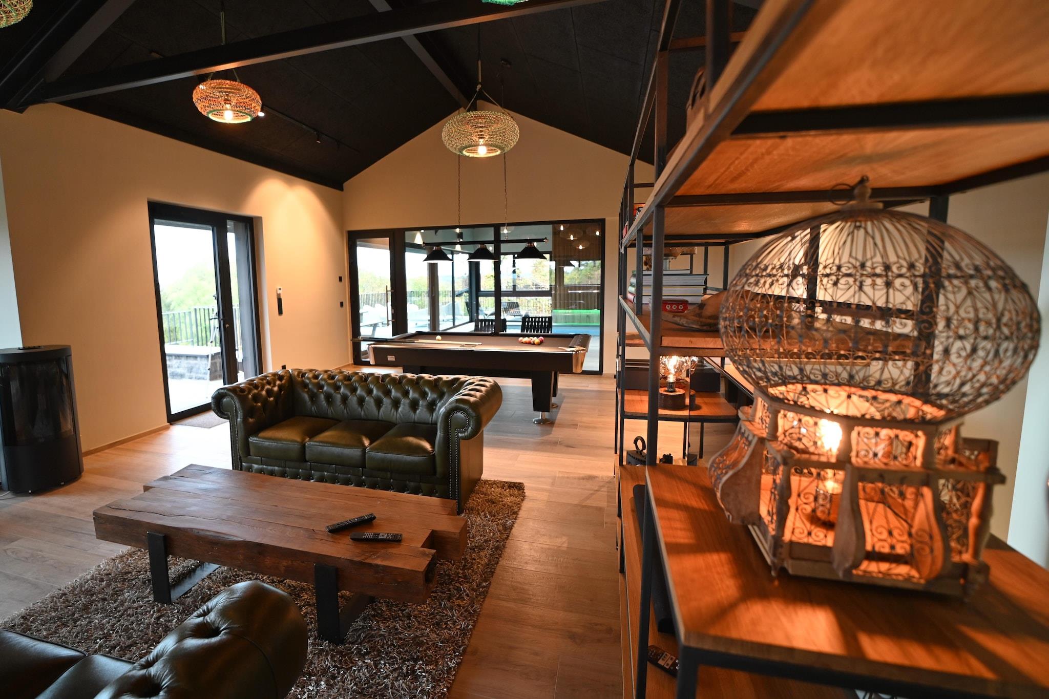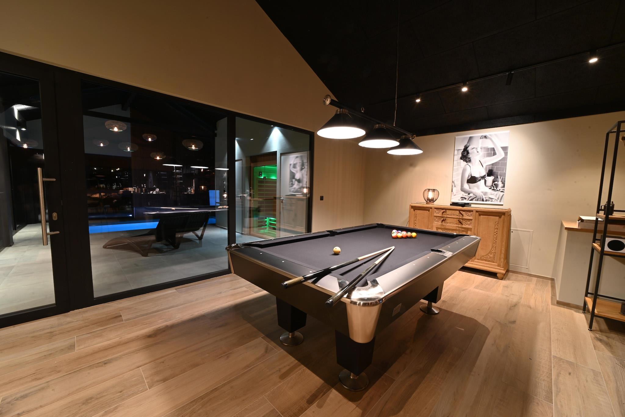 Stueetage: (åbent køkken(komfur(induktion), kaffemaskine(kopper), ovn, mikrobølgeovn, opvaskemaskine , køleskab, fryser), stue / spisestue(Fjernsyn(digital), spisebord, kakkelovn(gas), sofahjørne), soveværelse(dobbeltseng), soveværelse(dobbeltseng), Soveværelse med badeværelse(dobbeltseng, bruser), Soveværelse med badeværelse(dobbeltseng, bruser), badeværelse(bruser), toilet) På 1. etage: (toilet, sauna(infrarød sauna), swimmingpool(privat, indendørs)) varme(central), terrasse, have, havemøbler, grill, parkering, Parasol, biljard, barneseng