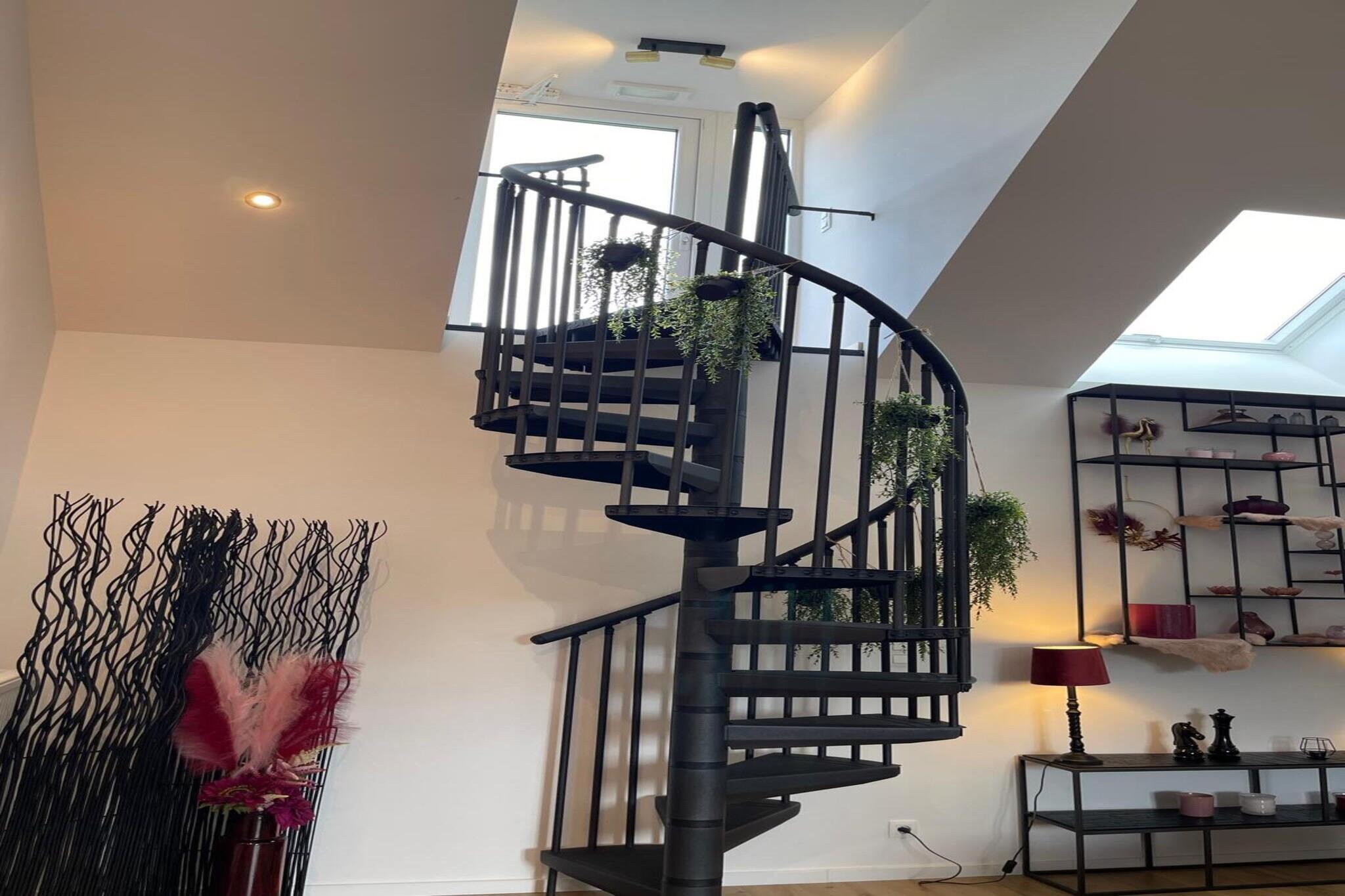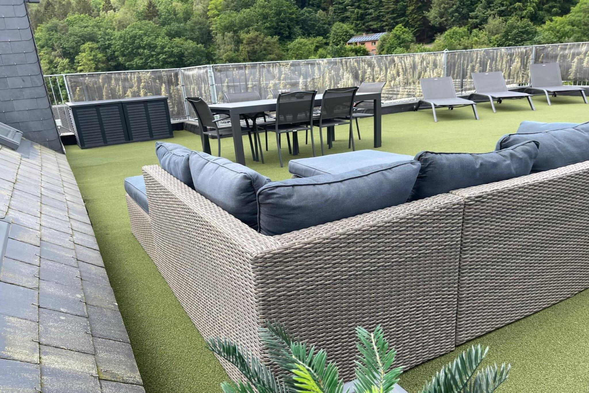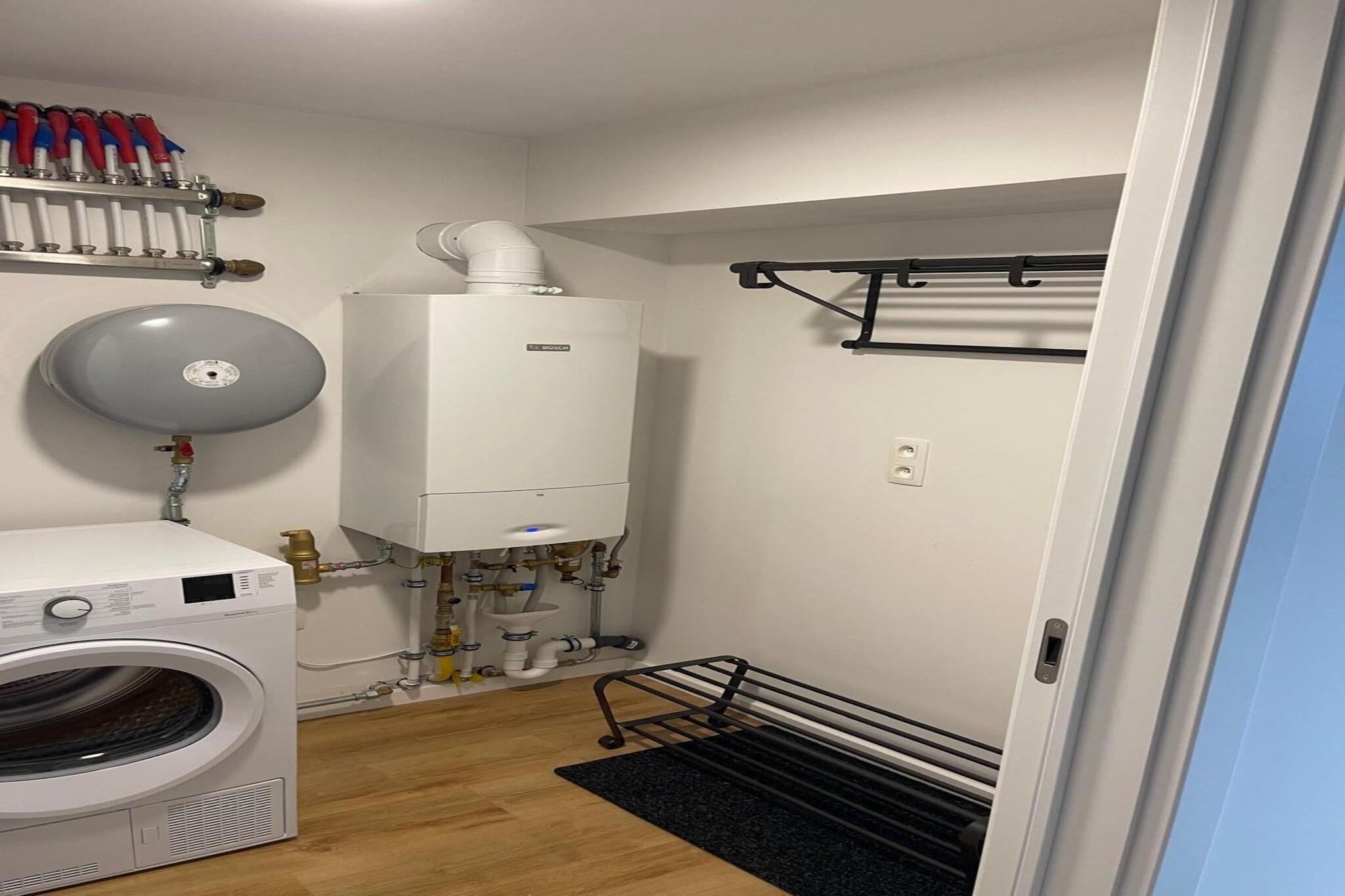 På 3. etage: (gang, Stue(dobbeltsovesofa, Fjernsyn(fladskærm)), køkken-alrum(kogeplade, elkedel, brødrister, kaffemaskine, ovn, mikrobølgeovn, opvaskemaskine , køle-fryseskab), Soveværelse med badeværelse(dobbeltseng, bruser, håndvask, toilet), Soveværelse med badeværelse(enkeltseng, dobbeltseng, bruser, håndvask, toilet), vaskerum (tørretumbler, vaskemaskine)) På 4. etage: (tagterrasse, have, havemøbler) varme(central), strygebræt, strygejern