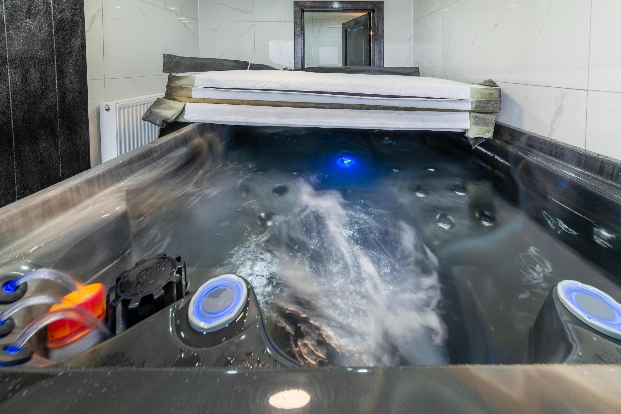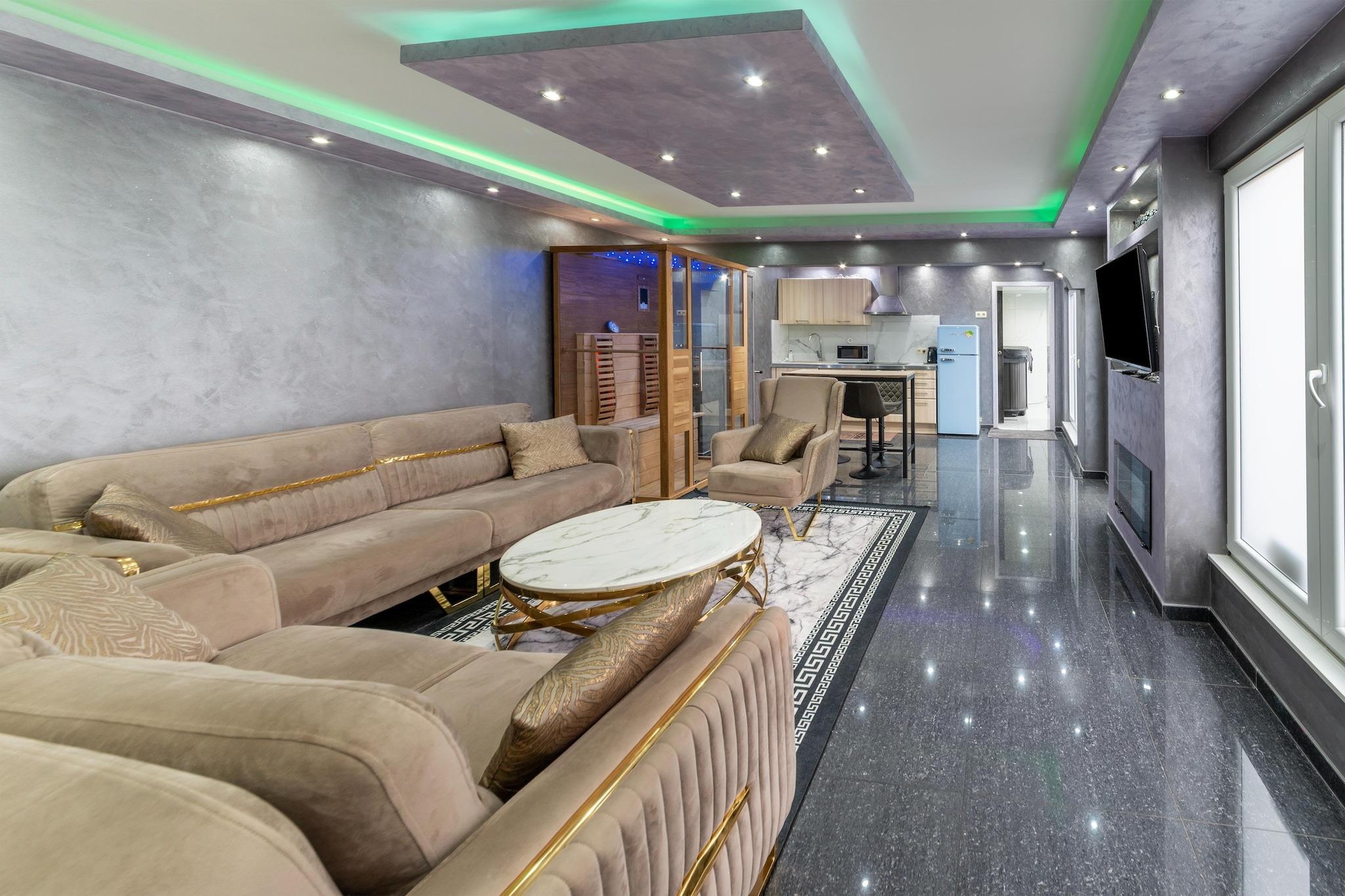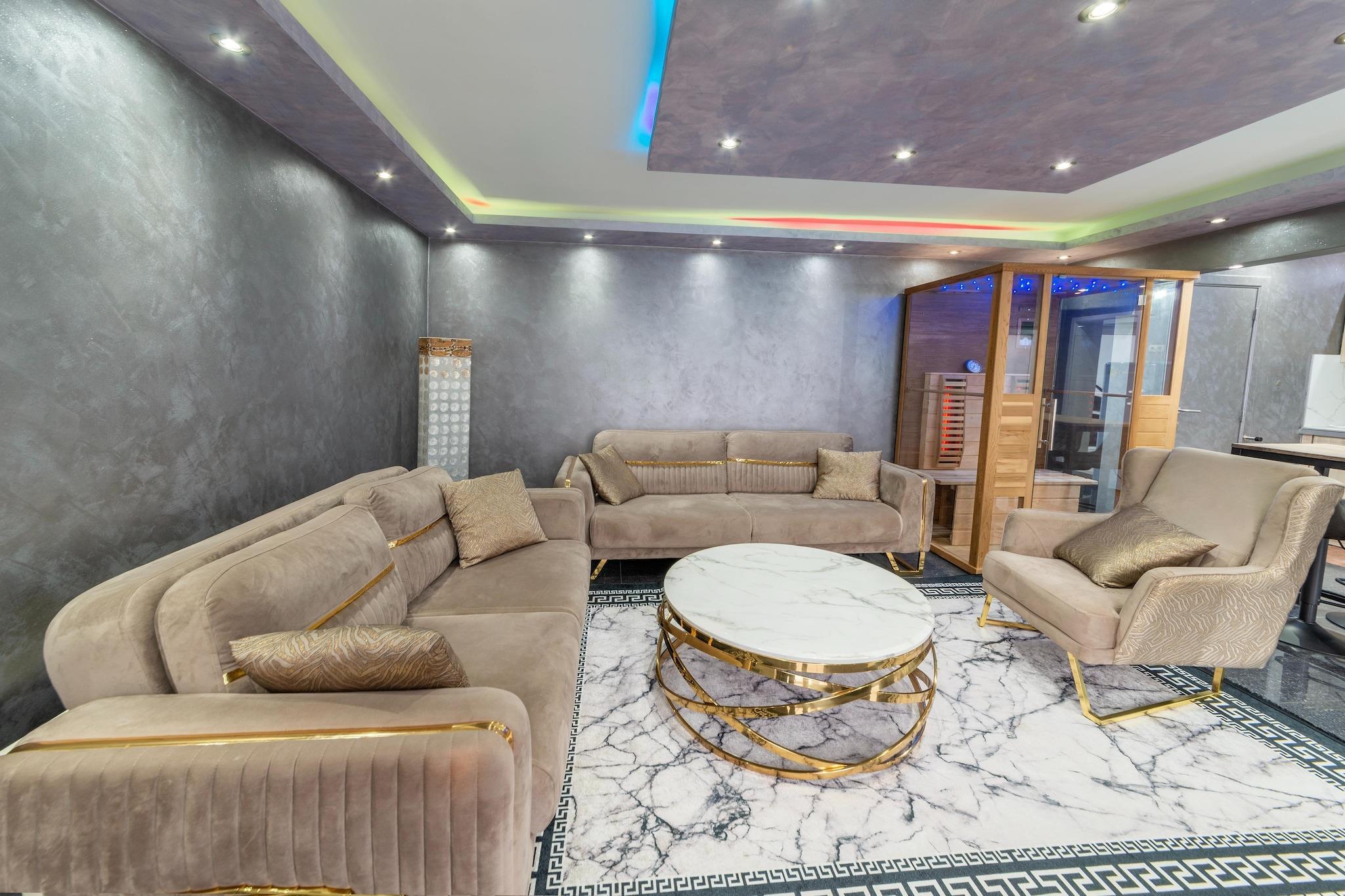 Stueetage: (entre, Stue(dobbeltsovesofa, pejs, hyggepejs), spisestue(spisebord), Køkken(elkedel, komfur, espressomaskine, ovn, mikrobølgeovn, køle-fryseskab), badeværelse(bruser, håndvask), fitnessrum(fitnessapparater), Bubble bath) På 1. etage: (soveværelse(dobbeltseng), soveværelse(dobbeltseng), soveværelse(dobbeltseng), badeværelse(massagebruser, håndvask), Tyrkisk bad) infrarød sauna, klimaanlæg, terrasse, grill, grill, private indoor pool
