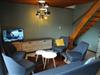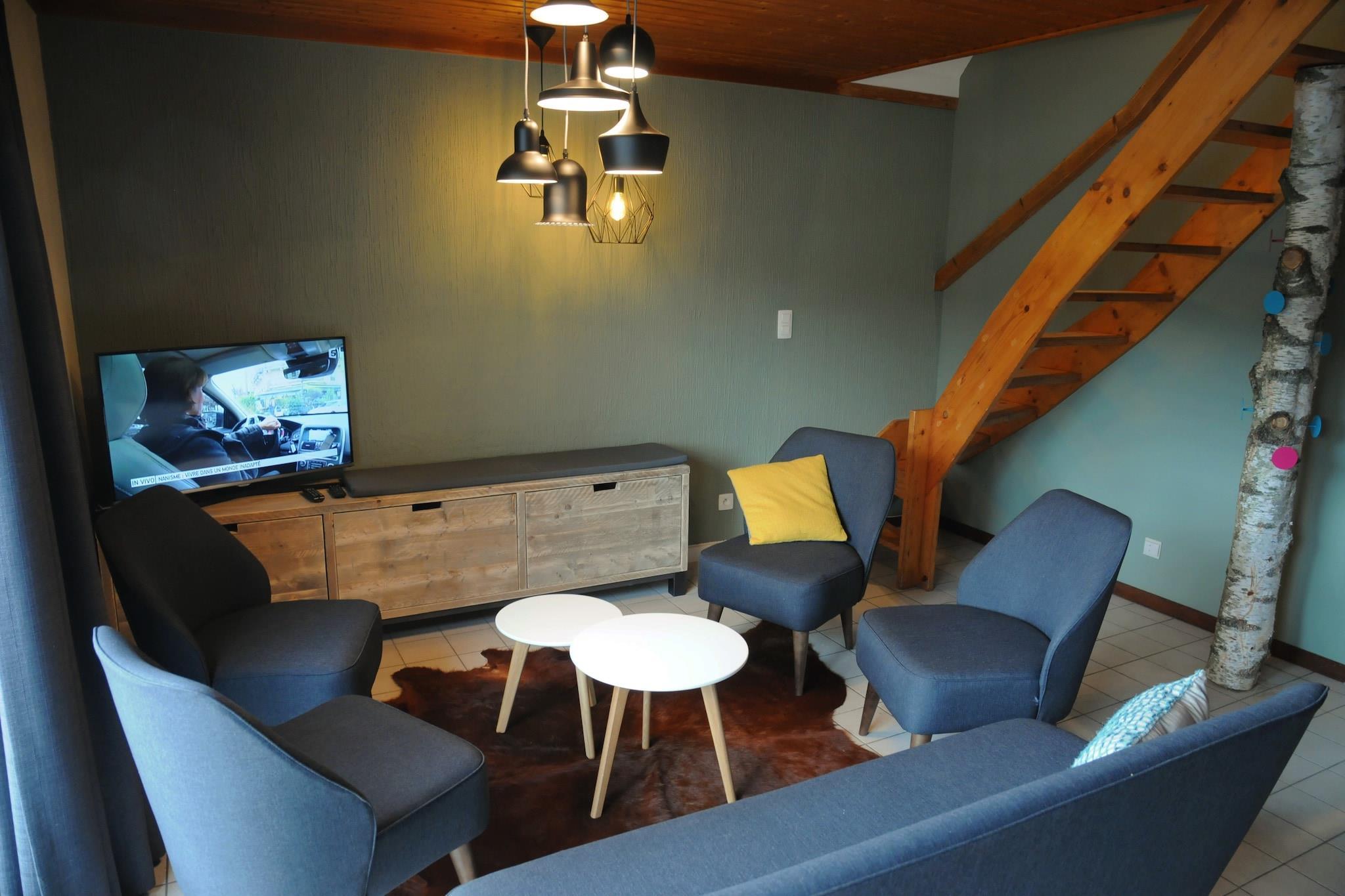 Stueetage: (Stue(Fjernsyn), åbent køkken(mikrobølgeovn), badeværelse(bruser, sauna, håndvask), toilet) På 1. etage: (soveværelse(2x enkeltseng), soveværelse med gennemgang(4x enkeltseng)) kaffemaskine(kaffetragt), varme(elektrisk), terrasse, havemøbler