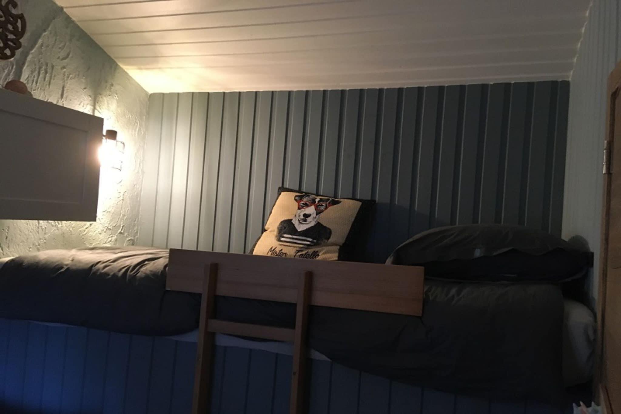 Stueetage: (åbent køkken(komfur(induktion), kaffemaskine(kaffepude), combi-mikroovn, opvaskemaskine , køleskab, fryser), stue / spisestue(dobbeltsovesofa, Fjernsyn(kabel), spisebord, kakkelovn(pille), sofahjørne), soveværelse(2x enkeltseng), soveværelse(køjeseng), badeværelse(bruser, toilet)) varme(elektrisk), terrasse, havemøbler, barnestol
