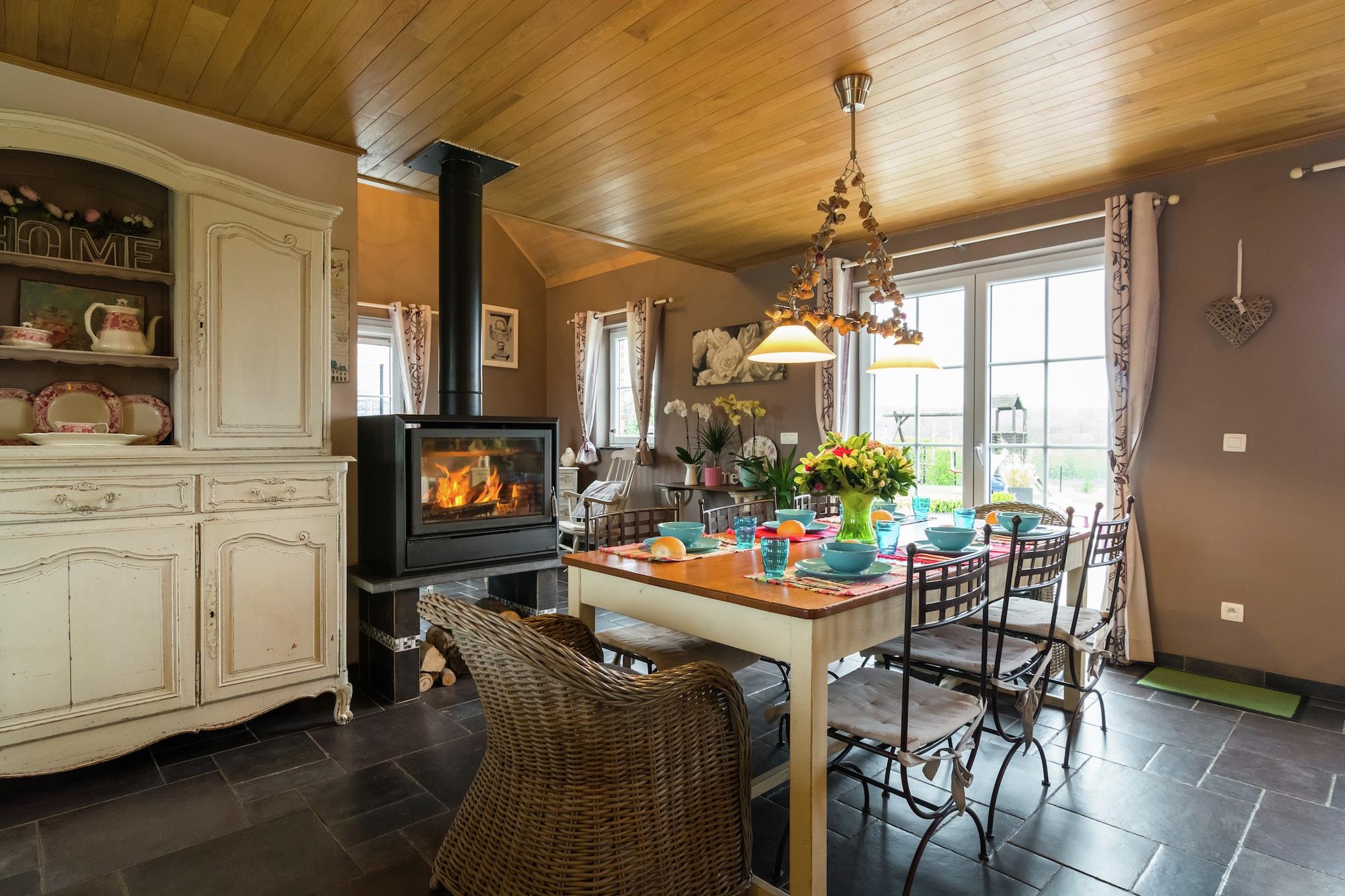 Nyt, moderne, varmt hus dekoreret med en masse smag. Beliggende langs vejen fra de vigtigste baner, mellem søerne "Lacs de l" Eau d "Heure" og Dinant, regionen er smuk og meget stille, det er det værd! Huset er rummeligt, har en flot trækassette til dine kølige aftener samt en stor lukket lukket have, hvor dine børn kan gå sikkert. Terrassen byder på smuk udsigt og du kan nyde en god grill i fred. Køkkenet er fuldt udstyret og der er en sauna. Et spor, damme og individuelle kasser står til din rådighed for dine heste i ejerens gård ved siden af. Mange vandreture, på heste, på cykel eller til fods, skal laves i regionen. Eventyrparker ligger et par kilometer væk. Du er i slutningen af en lille landsby kun for en smuk skov. Ud over de smukke vandreture kan du sejle på Meuse eller kajak på Lesse eller lave en lille tur i Frankrig i nabolaget. En god adresse!