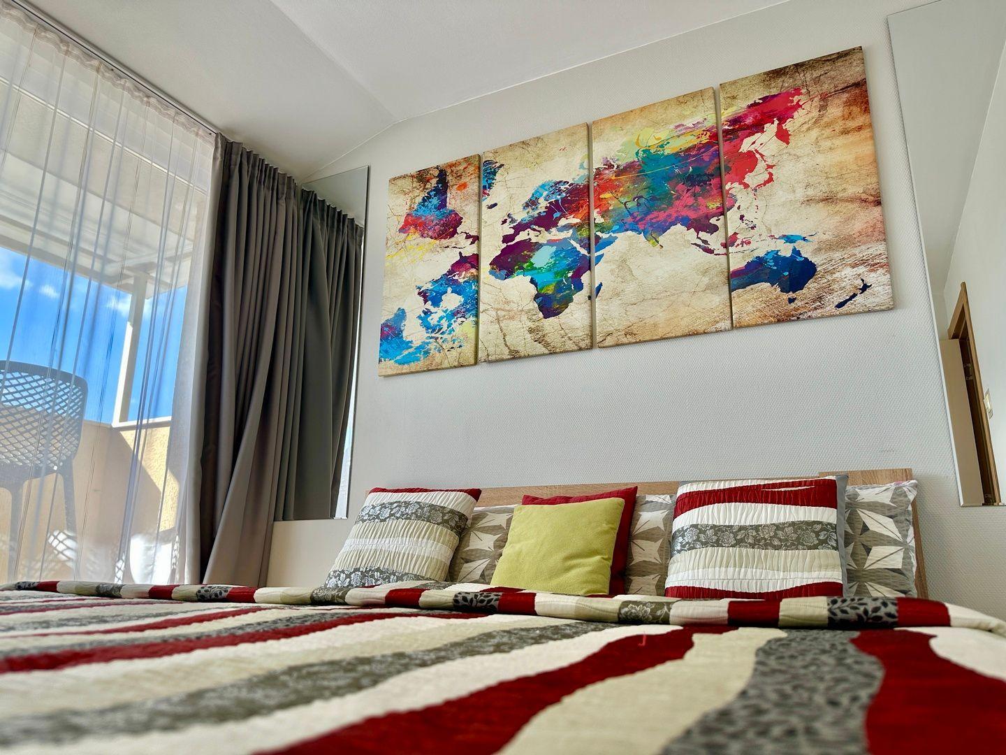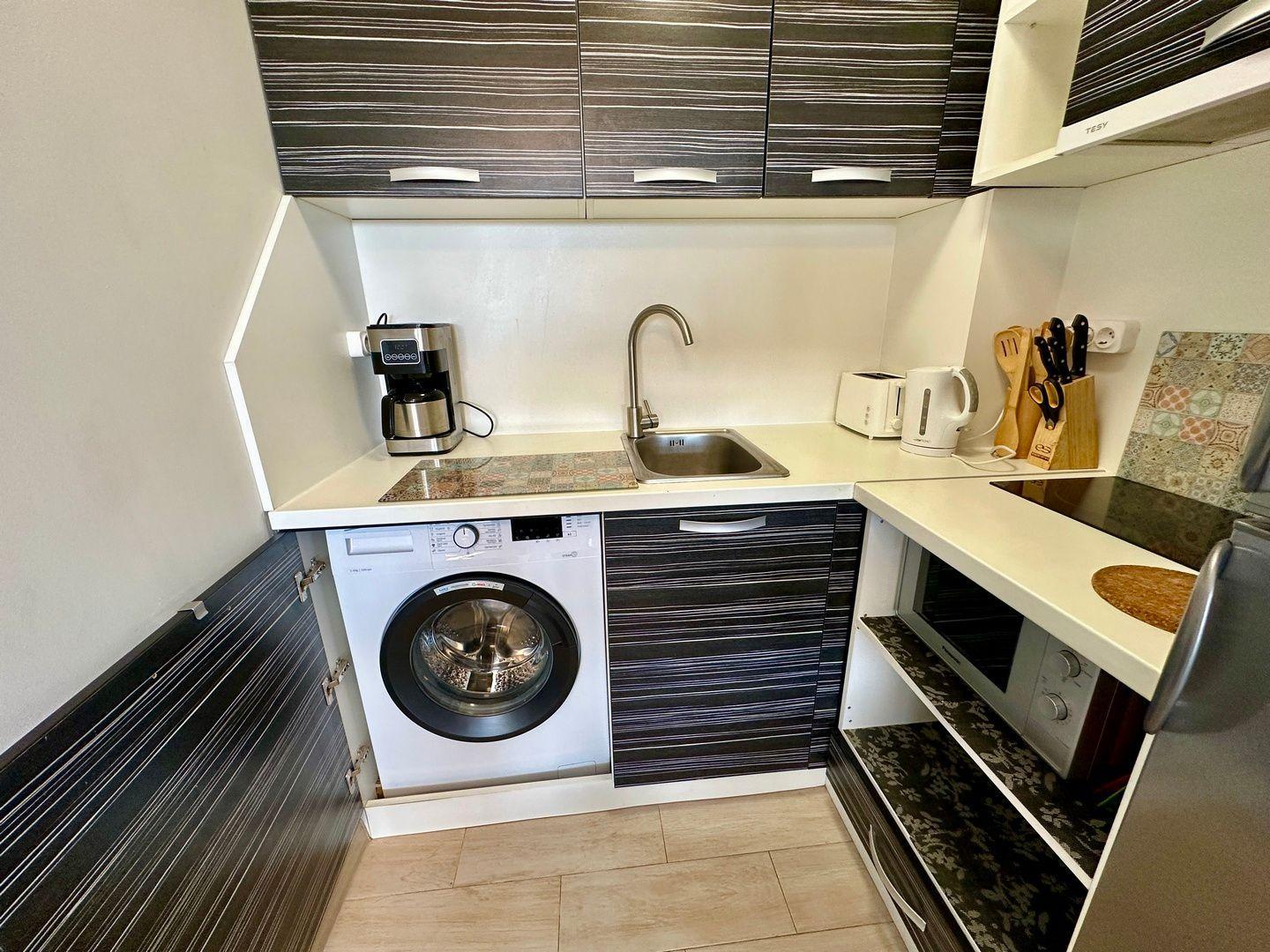 The interior of the flat is all about comfort and functionality. The bedroom provides an intimate atmosphere for two, while the living room with open kitchen is spacious and equipped with all modern conveniences, including a comfortable sofa bed, 2-burner cooker, coffee maker, kettle and washing machine and dryer for your own use - everything you need for a hassle-free holiday.