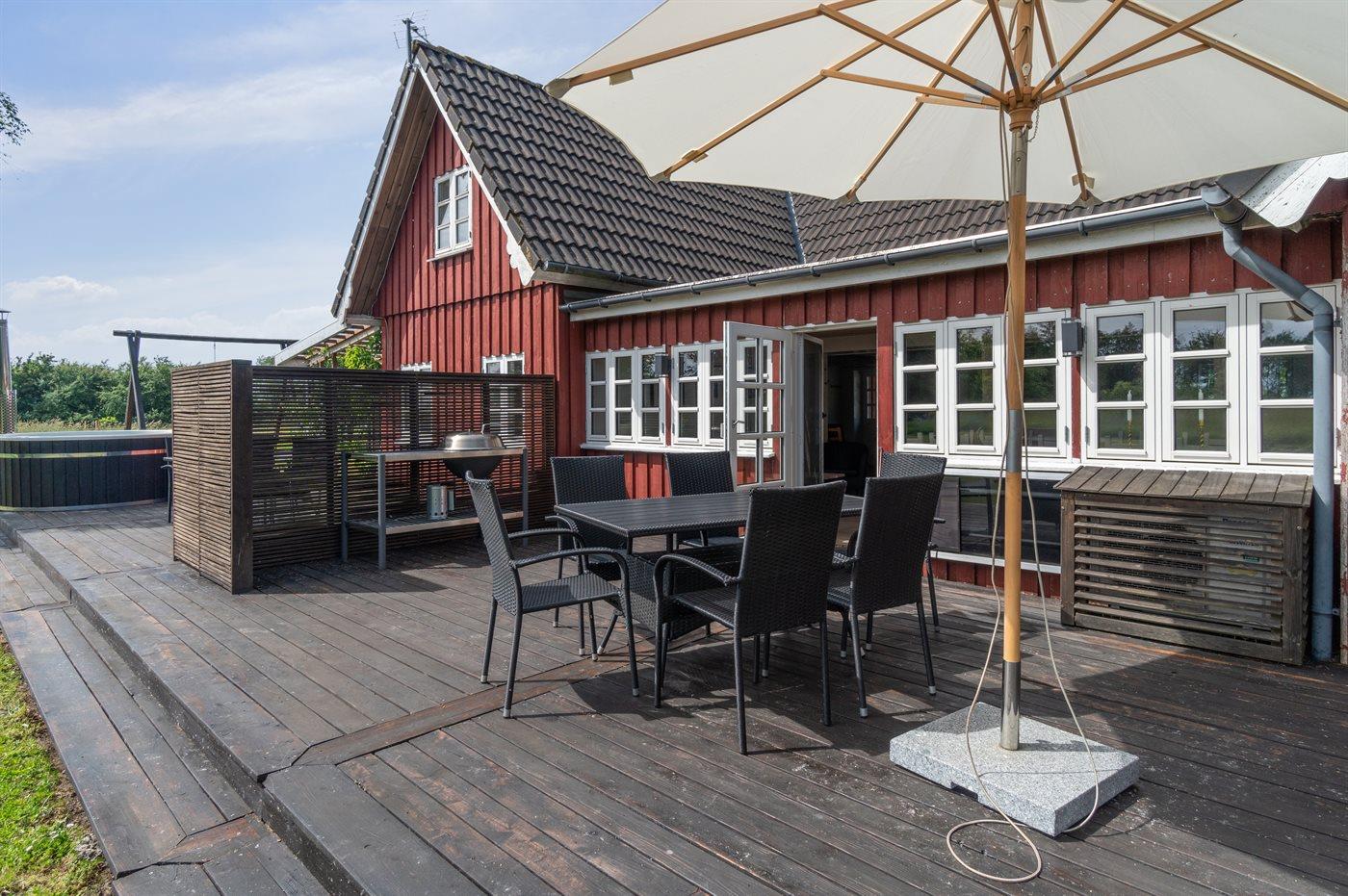 Veludstyret sommerhus nær Aakirkeby med spabad, vildmarksbad, store terrasser og aktivitetsrum for en aktiv ferie.