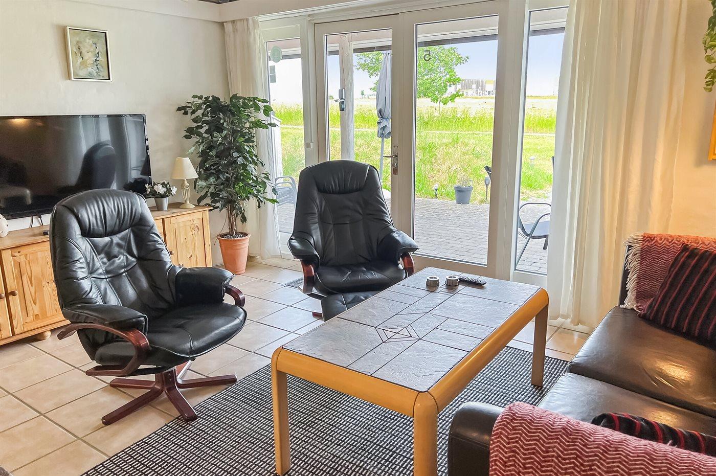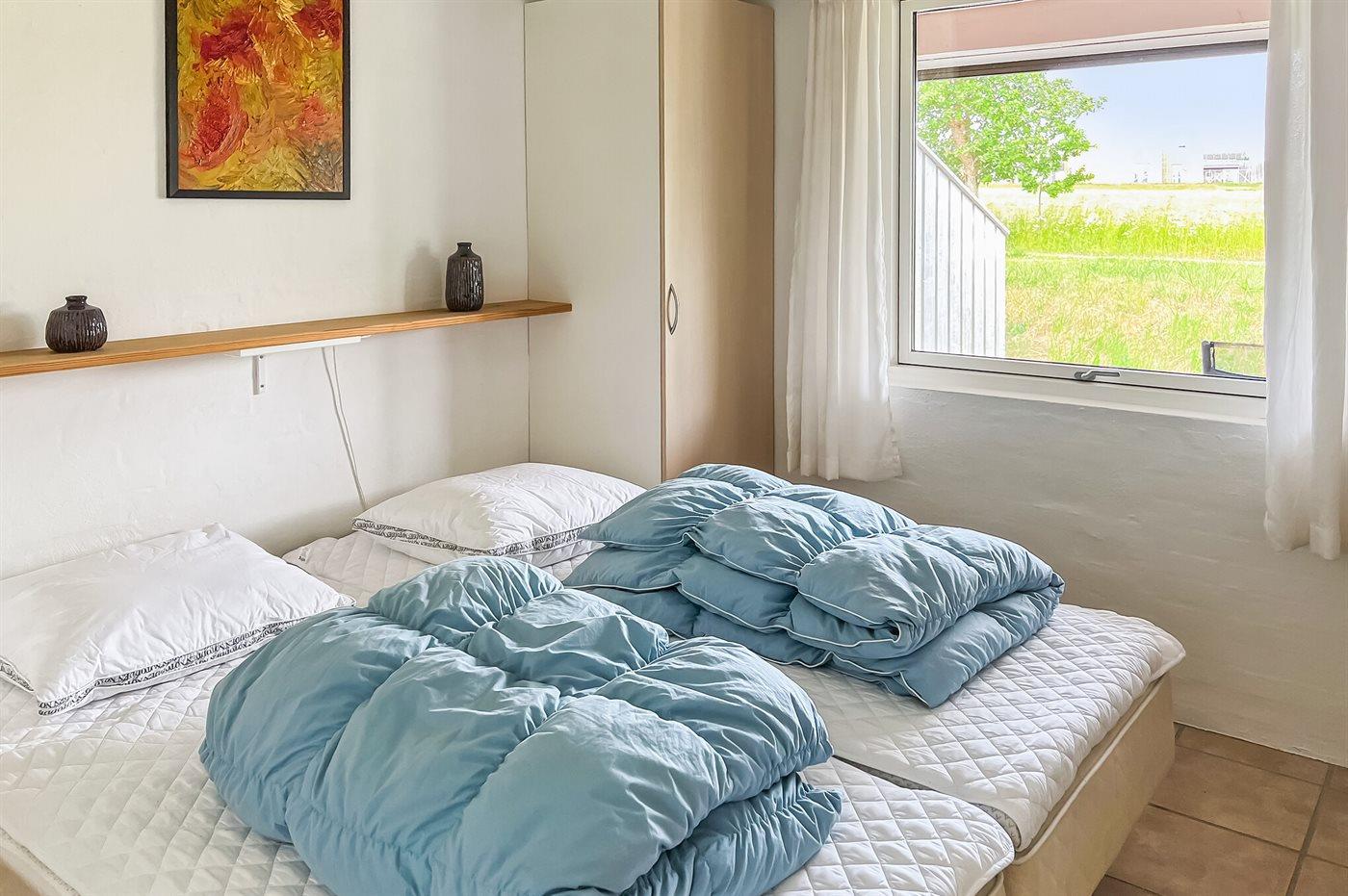 Indvendigt er der hvidmalede stenvægge, hvidmalede lofter samt flotte klinkegulve. Badeværelse med bruser og badekar. Køkkenafdelingen er indrettet med bl.a. opvaskemaskine, mikrobølgeovn, varmluftovn og komfur med keramiske kogeplader. Opholdsstuen er bl.a. indrettet med TV tilsluttet fællesantenne, DVD-afspiller og stereoanlæg med CD-afspiller. Sovepladserne fordeler sig på 2 værelser; 1 med dobbeltseng og 1 med dobbeltseng samt 1 enkeltseng (alle med boksmadrasser). Høj barnestol til rådighed.