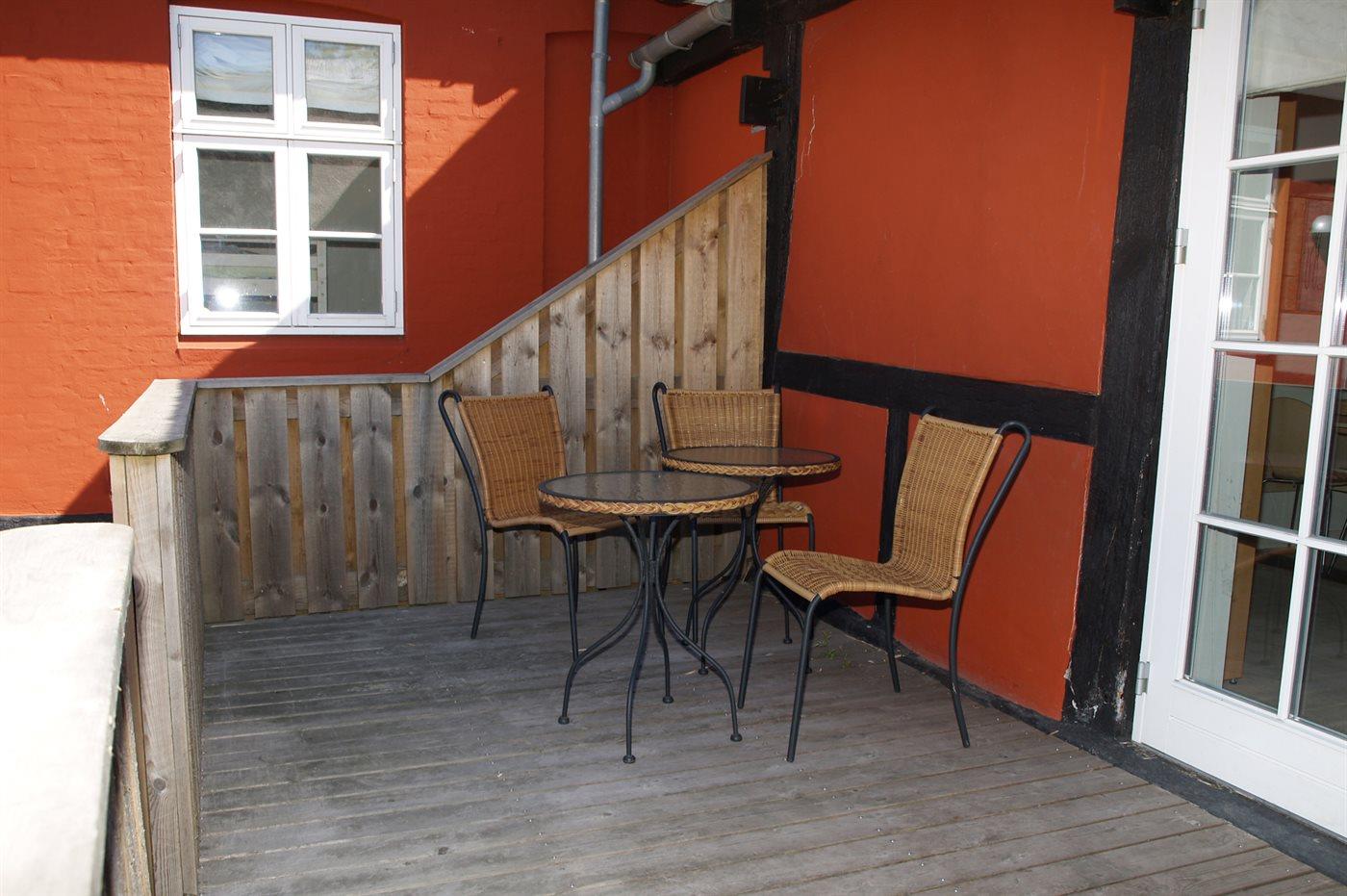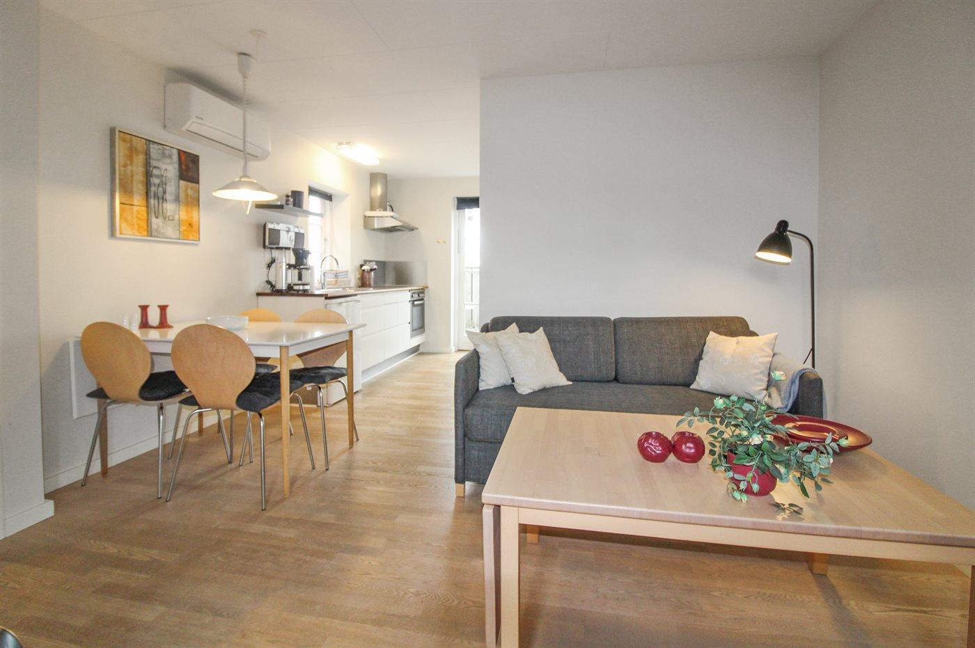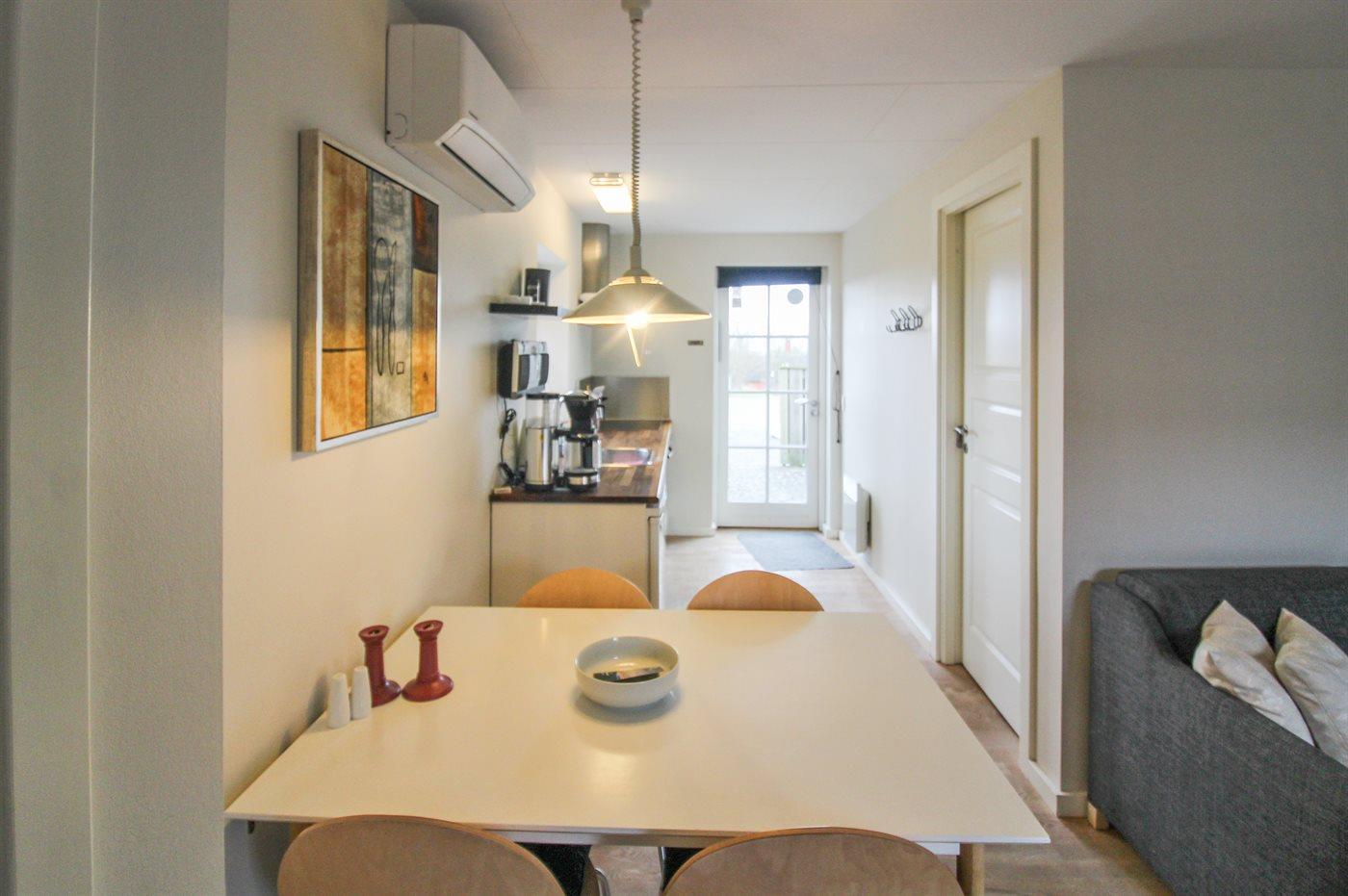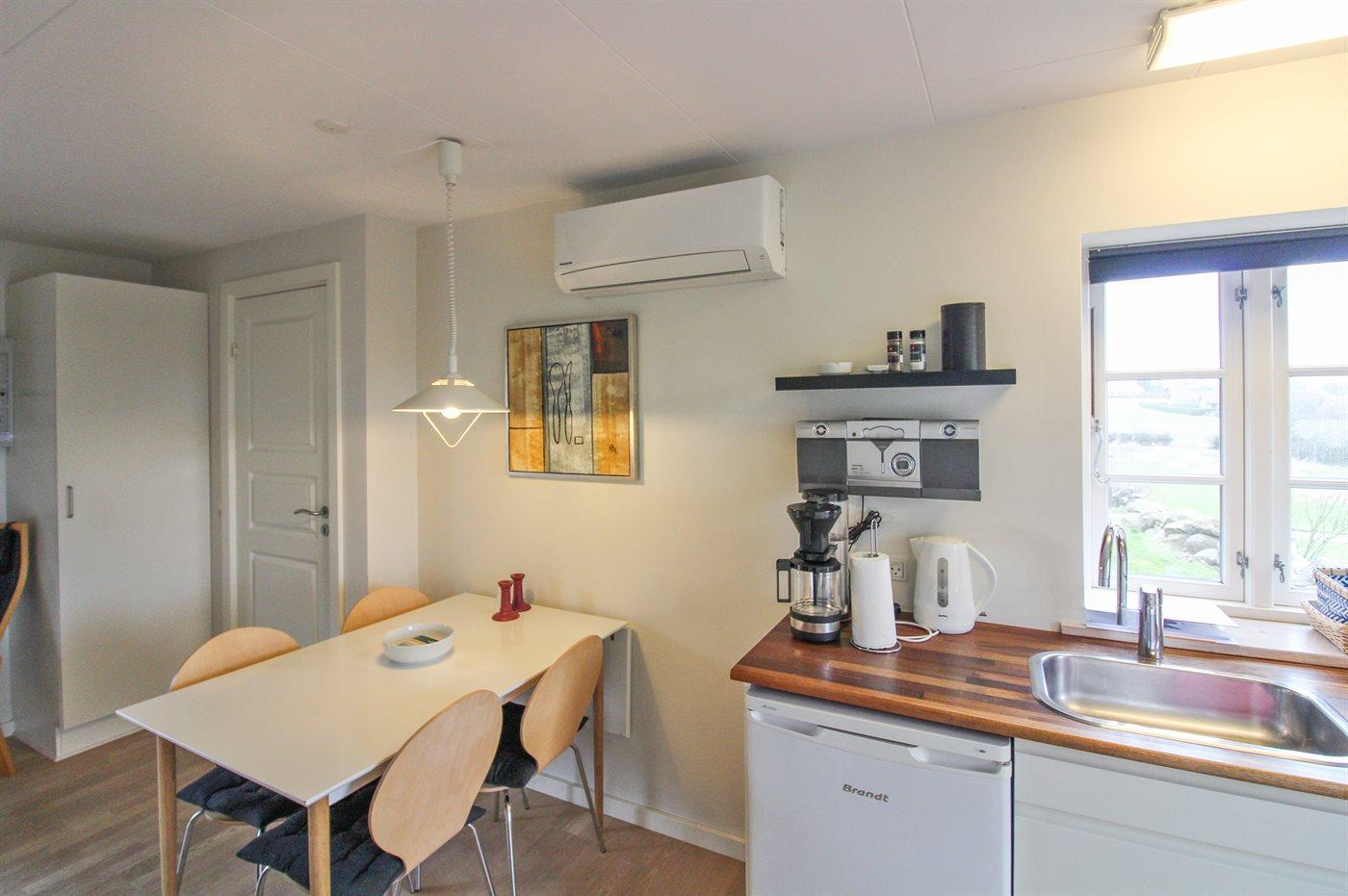 Hyggelig ferielejlighed, renoveret i 2006, beliggende på en naturgrund i en firlænget gård i udkanten af Aakirkeby - nær skov og oplevelsescenteret ”Natur Bornholm”, som illustrerer Bornholms oprindelse for millioner af år siden. Lejligheden ligger på et fællesareal med bl.a. udendørs swimmingpool (16 x 10 x 0,7-1,8 m) samt legeplads med gynge. I perioden fra den 15/6 til 15/9 (fra kl. 8:00 til kl. 20:00) opvarmes swimmingpoolen vha. varmepumpe. Til lejligheden hører 2 åbne træterrasser med gode solmuligheder hele dagen. Det pæne køkken er kombineret med opholdsstuen og bl.a. udstyret med komfur med keramiske kogeplader. Opholdsstuen er indrettet med TV tilsluttet fællesantenne, stereoanlæg med CD-afspiller samt udgang til terrassen. Sovepladserne fordeler sig på 1 soveværelse med dobbeltseng samt dobbelt sovesofa i opholdsstuen. Der er trådløst internet (50/50 Mbit) til rådighed. Lejligheden er velegnet til den lille familie eller par, som ønsker at bo i pæne omgivelser og nyde Bornholms skønne natur og gode aktivitetsmuligheder. De hvide sandstrande på Sydbornholm ligger blot 4,5 km fra dette lejlighedskompleks, og der er ikke langt til supermarked, bager, restauranter og den hyggelige købstad Aakirkeby, som har øens største kirke med en helt speciel døbefont. Lejligheden er et godt udgangspunkt for en aktiv og afslappende ferie på Bornholm.