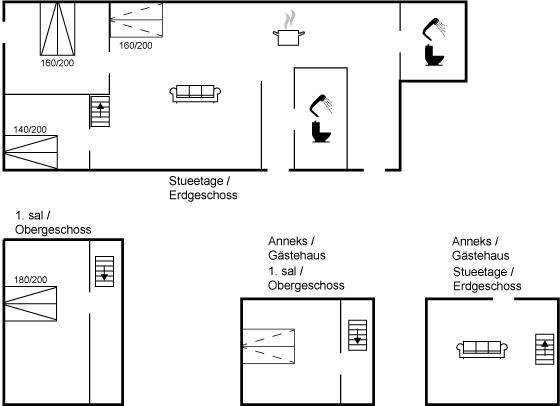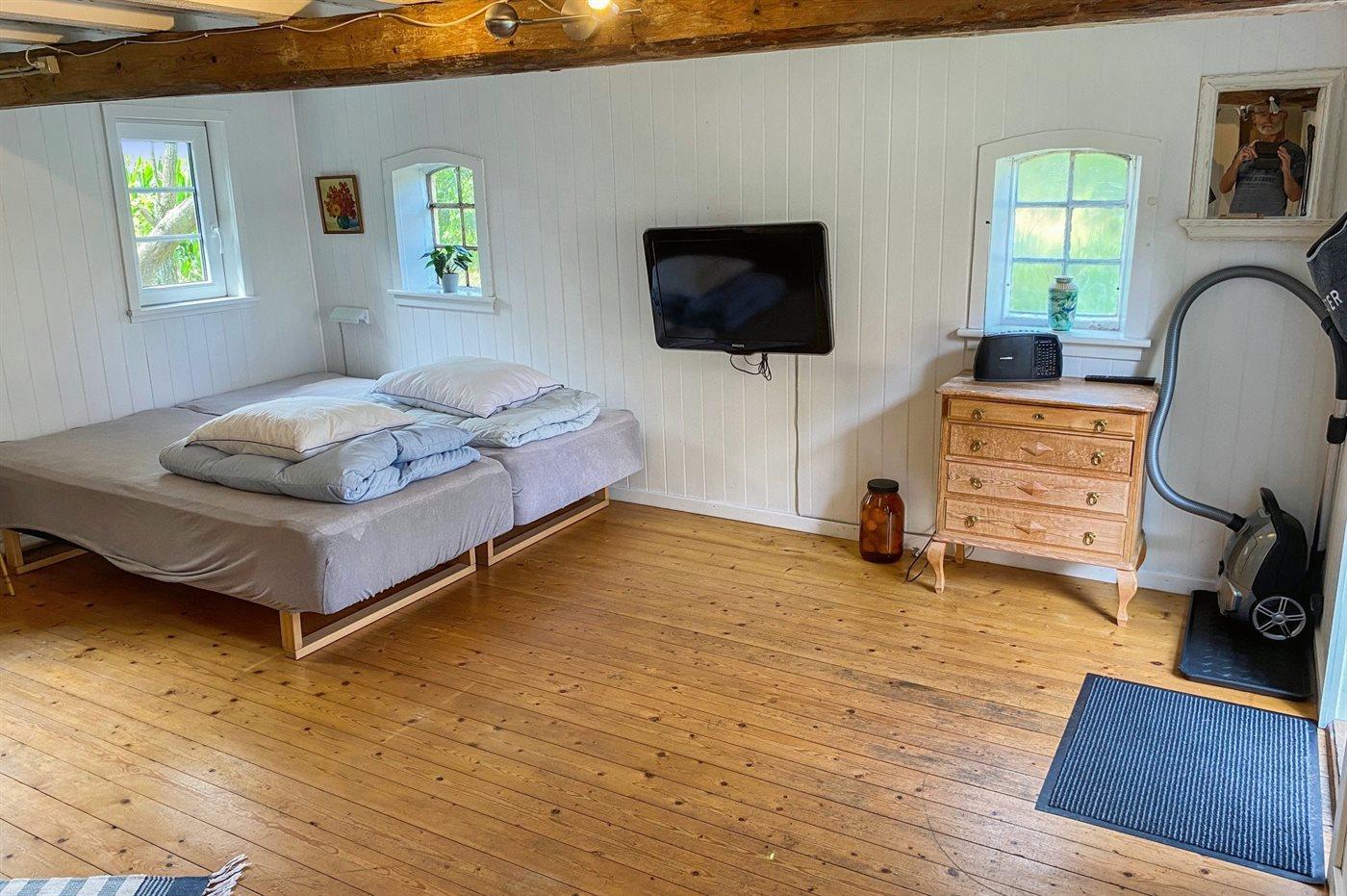 Der er i alt 4 soveværelser. Sovepladserne fordeler sig på: 6 sovepladser i dobbeltsenge. 4 sovepladser i sovesofa (dobbelt). 2 af disse sovepladser befinder sig i stuen, og 2 sovepladser befinder sig i anneks.