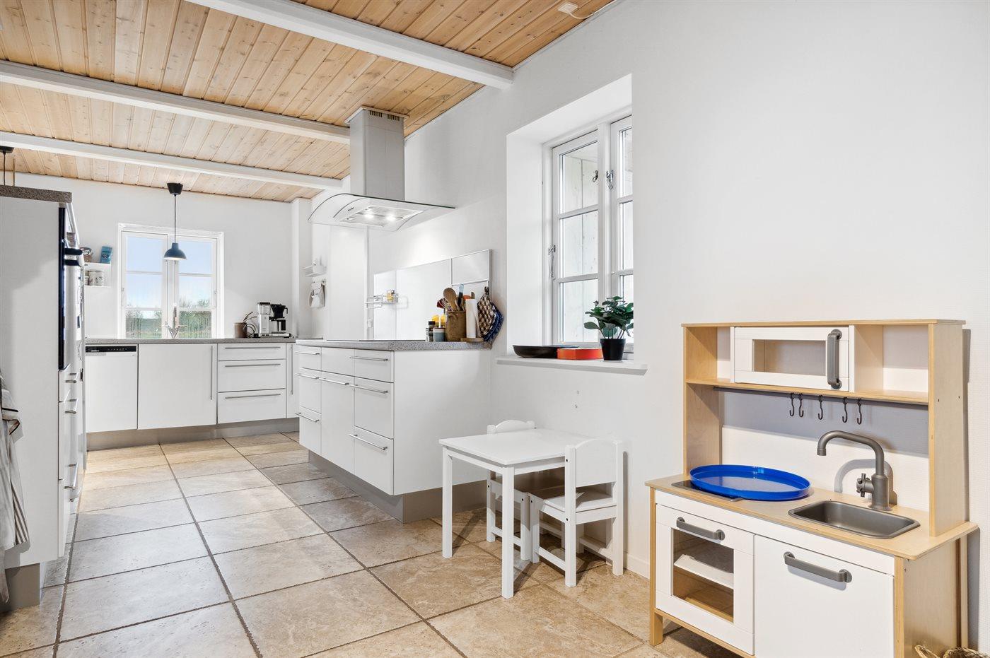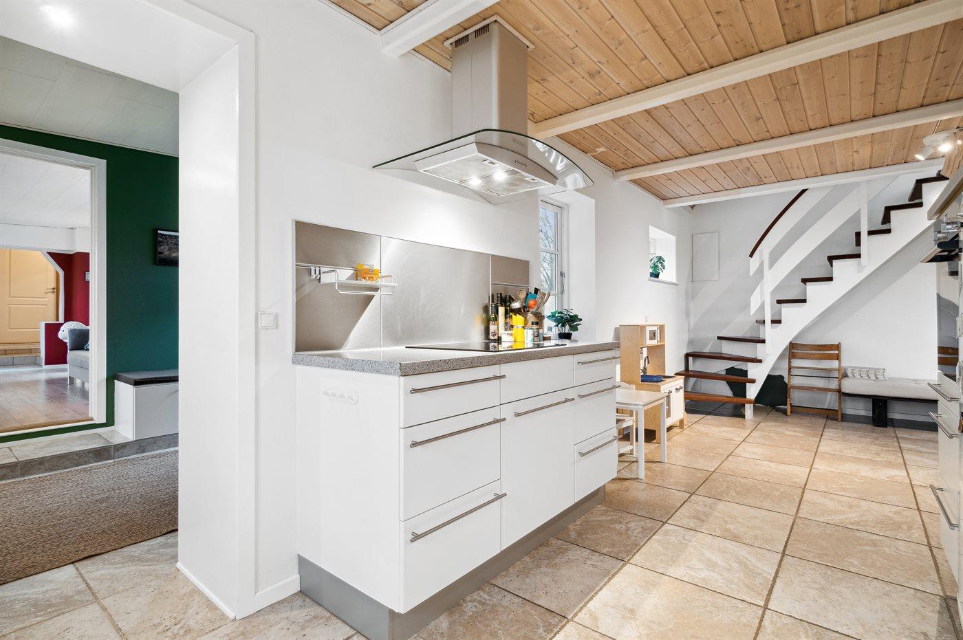 Køkkenet er udstyret med 2 køleskabe. Der er 4 induktionskogeplader, varmluftovn samt opvaskemaskine Der er gulvvarme i køkkenet.