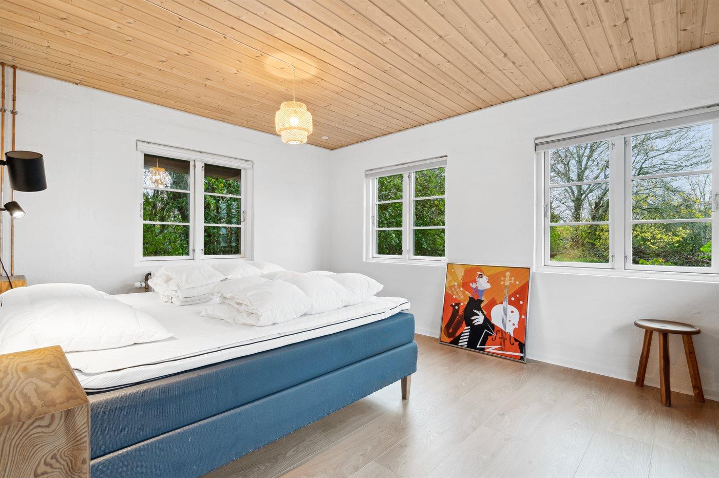 Der er i alt 3 soveværelser. Sovepladserne fordeler sig på: 4 sovepladser i dobbeltsenge. 2 sovepladser i køjeseng. 2 sovepladser i sovesofa (dobbelt). 2 af disse sovepladser befinder sig i en mellemgang. Derudover er der 1 stk. barneseng.