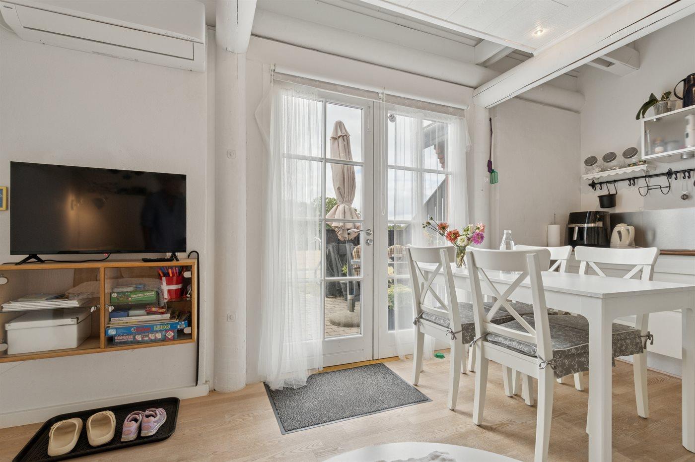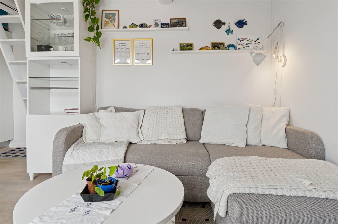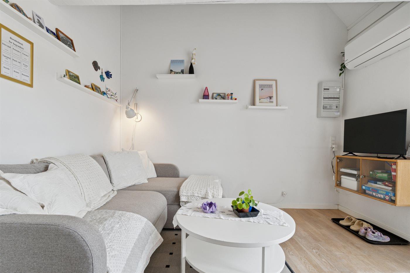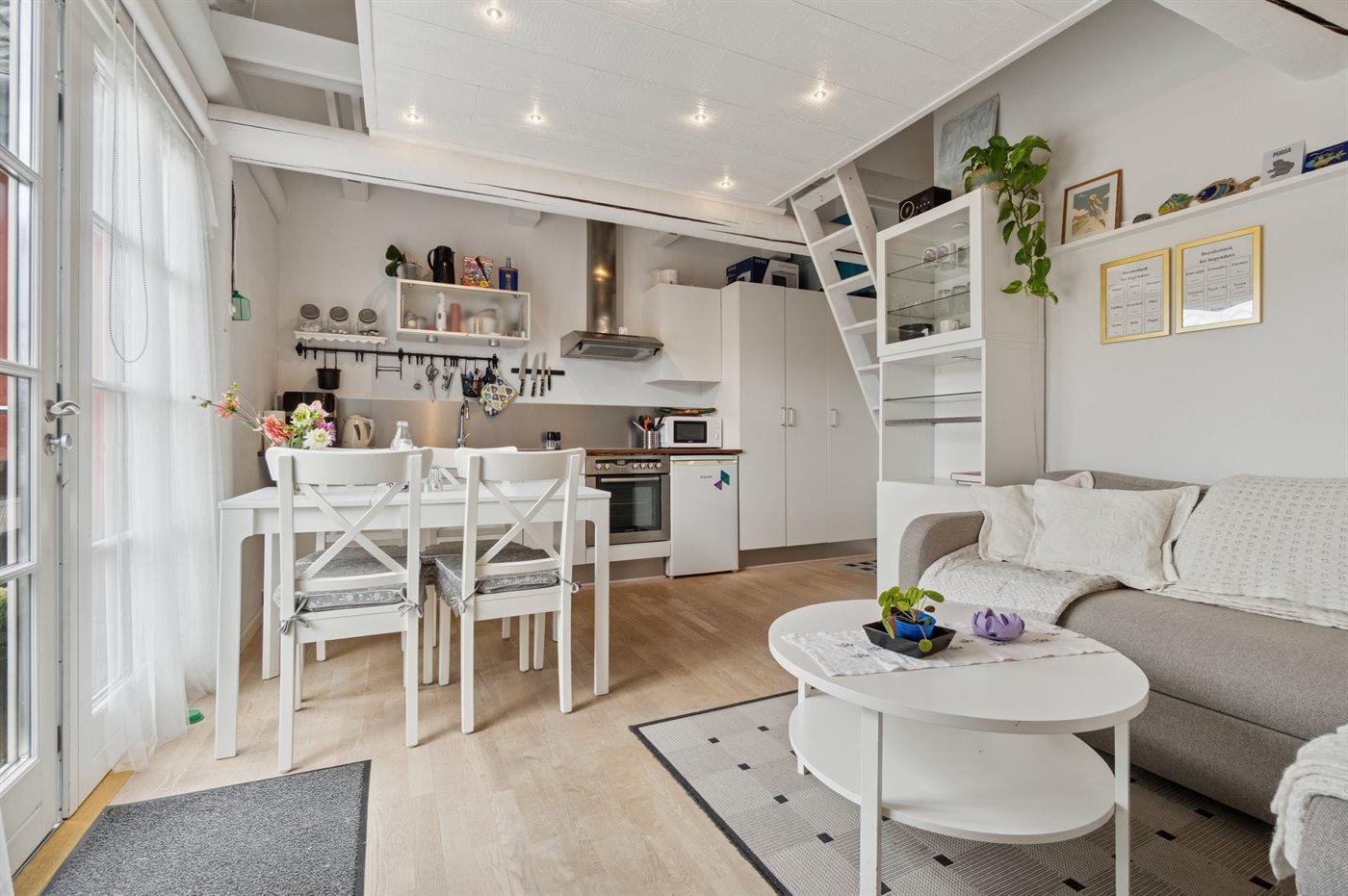 Lejligheden fremstår med et lyst interiør. hvor pladsen er veludnyttet, så der endda er blevet plads til en hems med stejl trappe. Foruden soveværelset er der også en god sofakrog i stuen, som kan benyttes som dobbeltsoveplads, hvis men ikke vil sove hemsen. Velassorteret køkkenafdeling og stue med direkte udgang til terrassen, der er godt afskærmet.