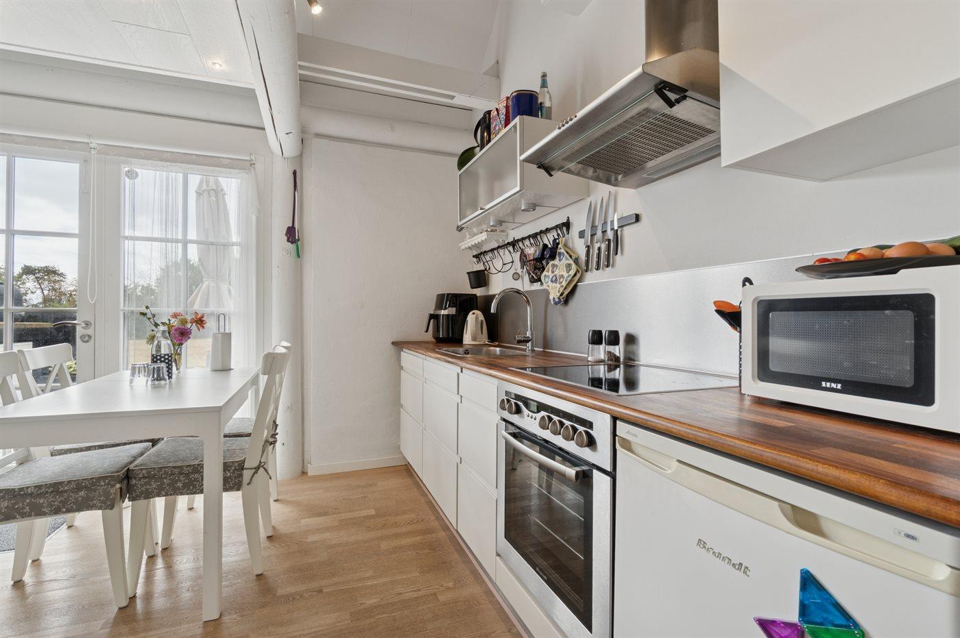 Køkkenet er udstyret med 1 køleskab. Der er 4 keramiske kogeplader, varmluftovn, mikrobølgeovn, Airfryer samt opvaskemaskine.