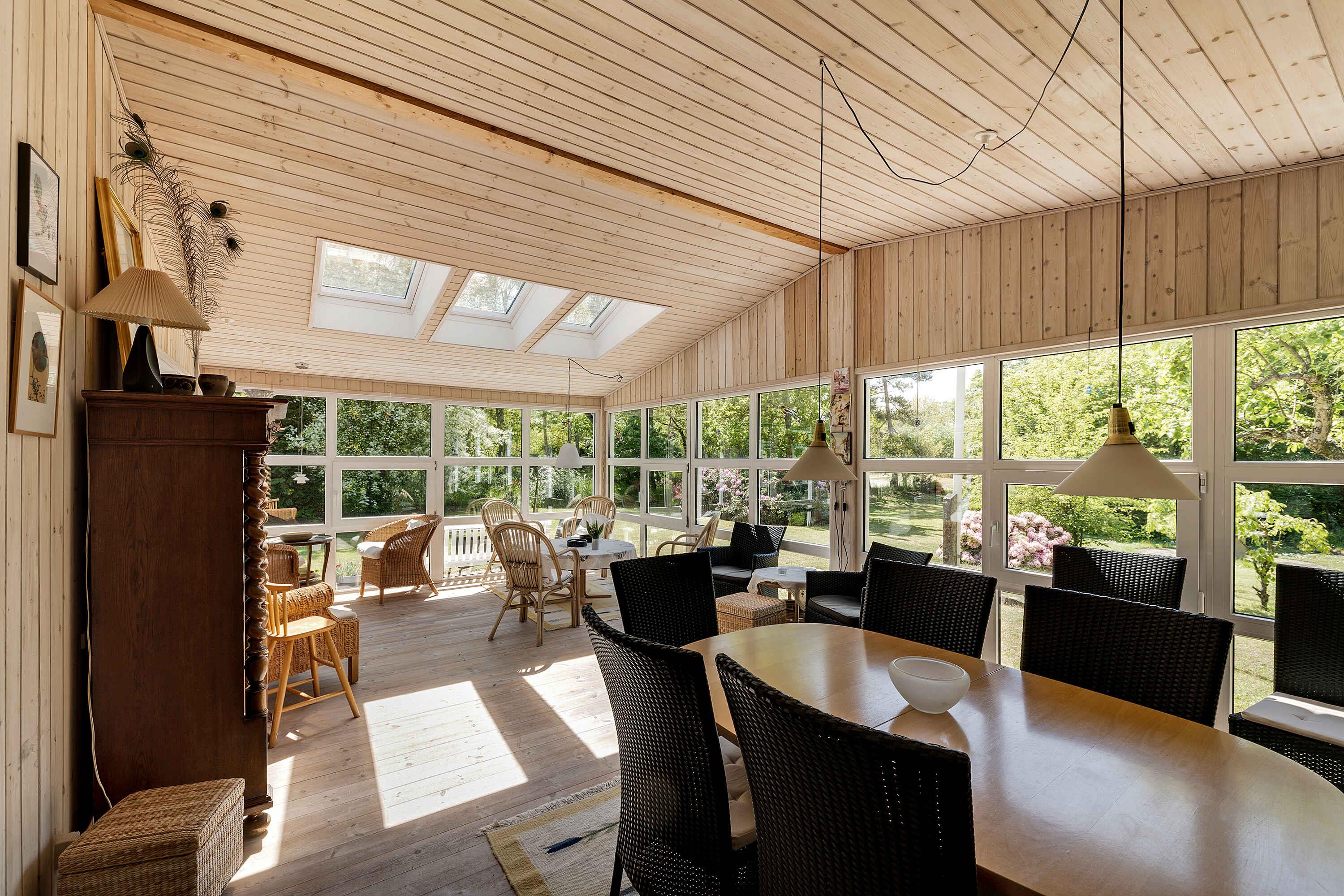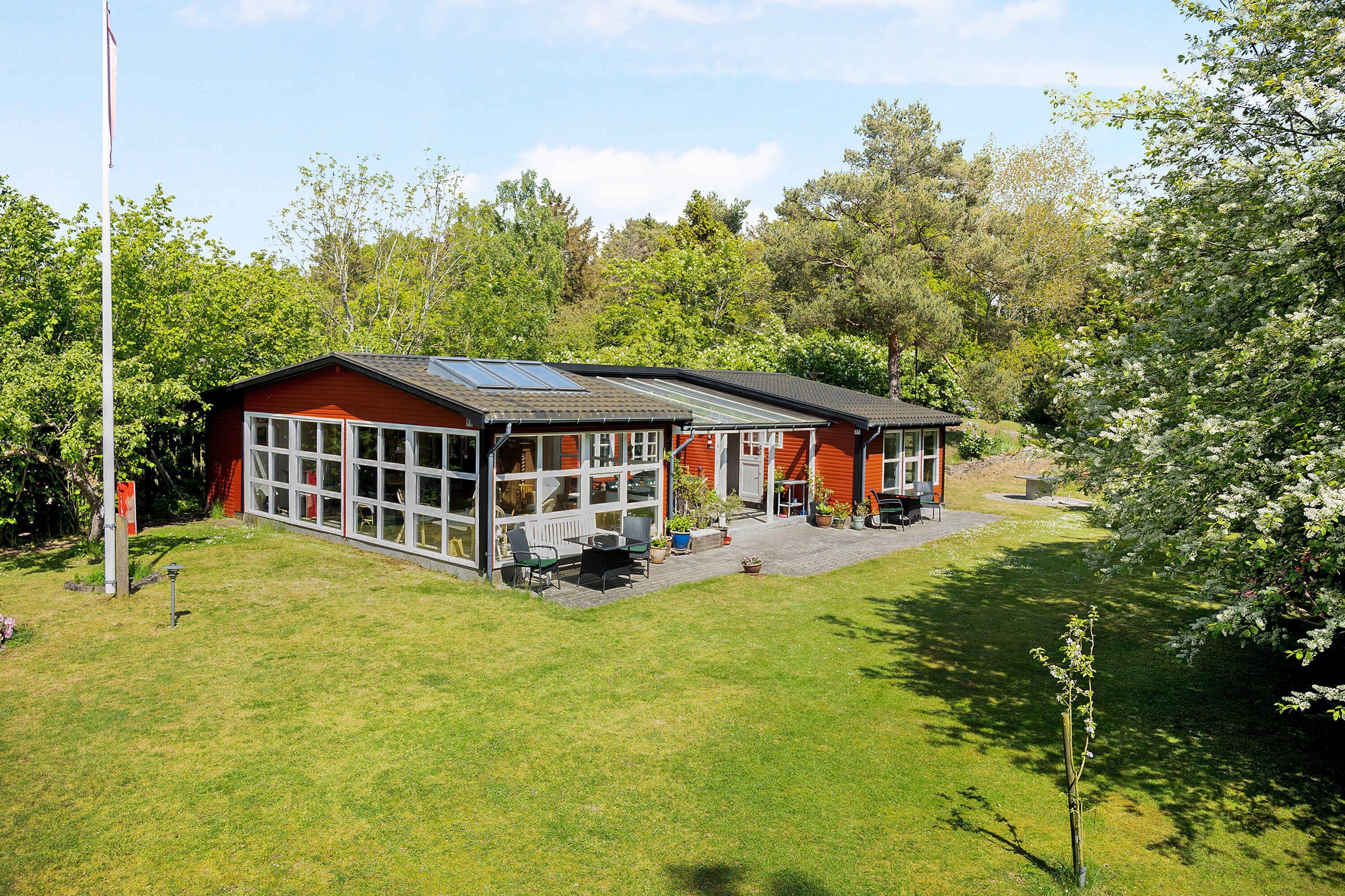 Charmerende rødmalet sommerhus nær Boderne Strand med store terrasser og privat grund.