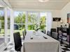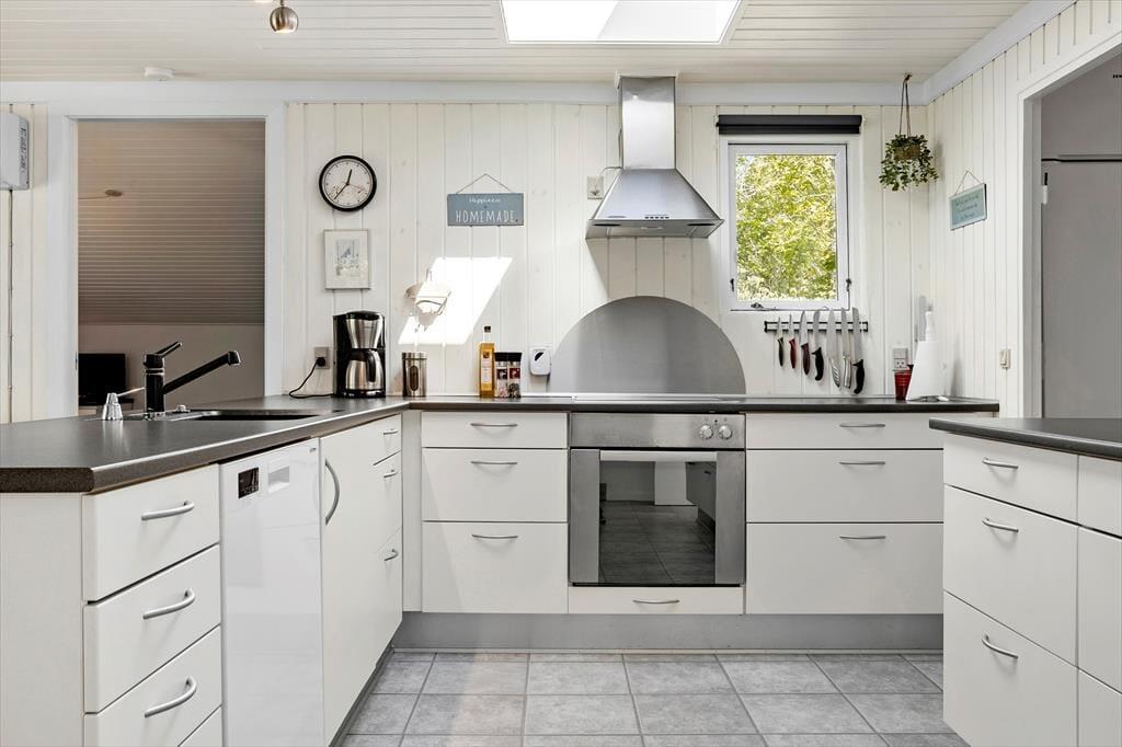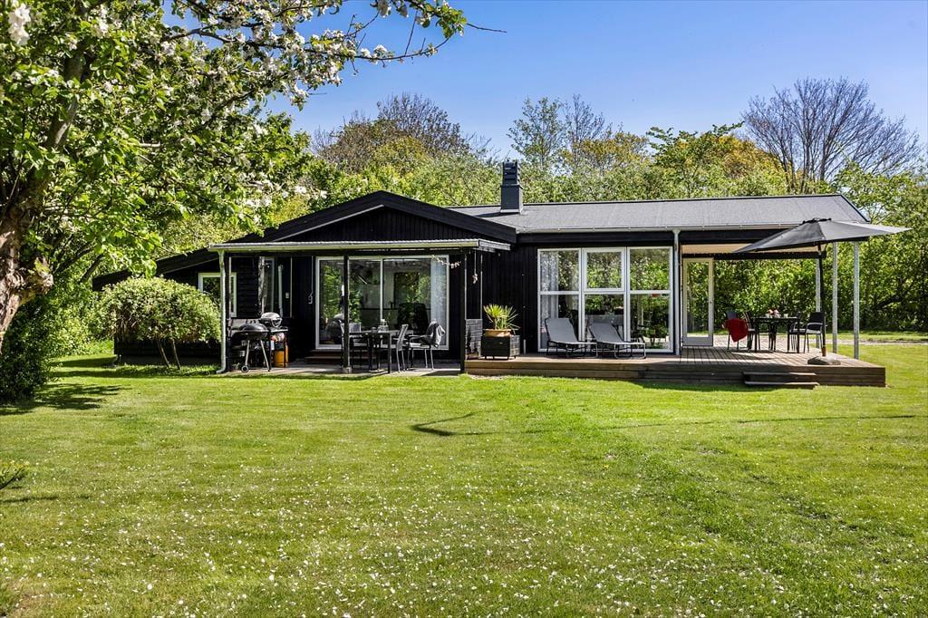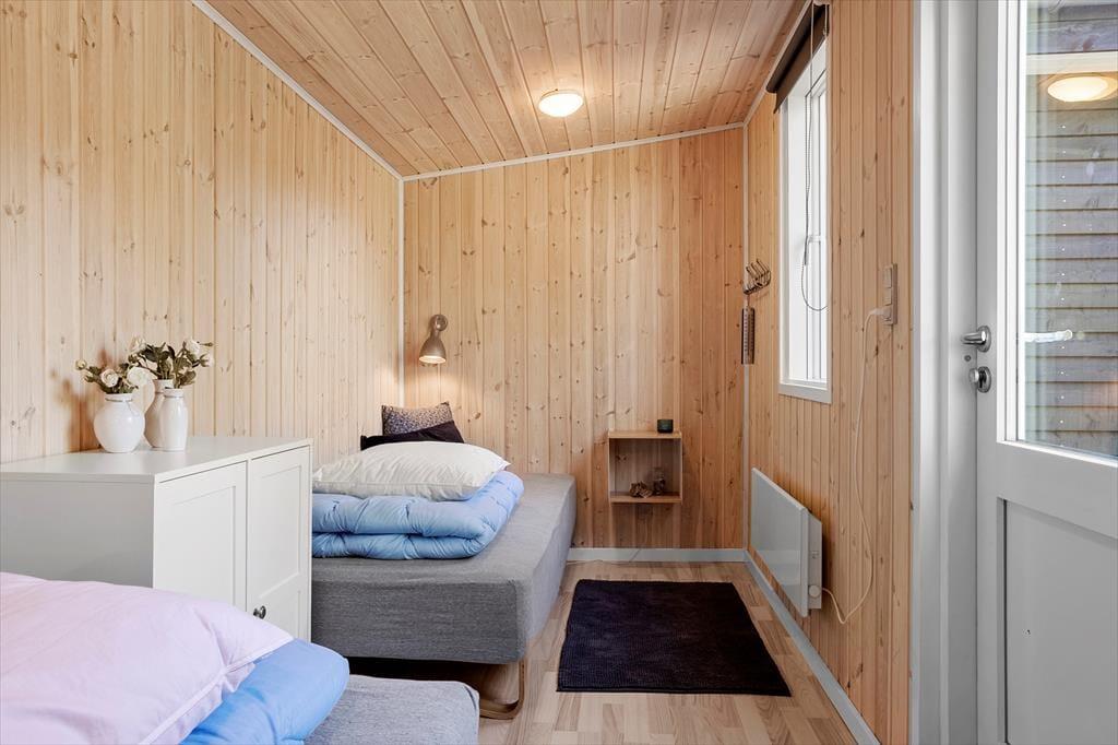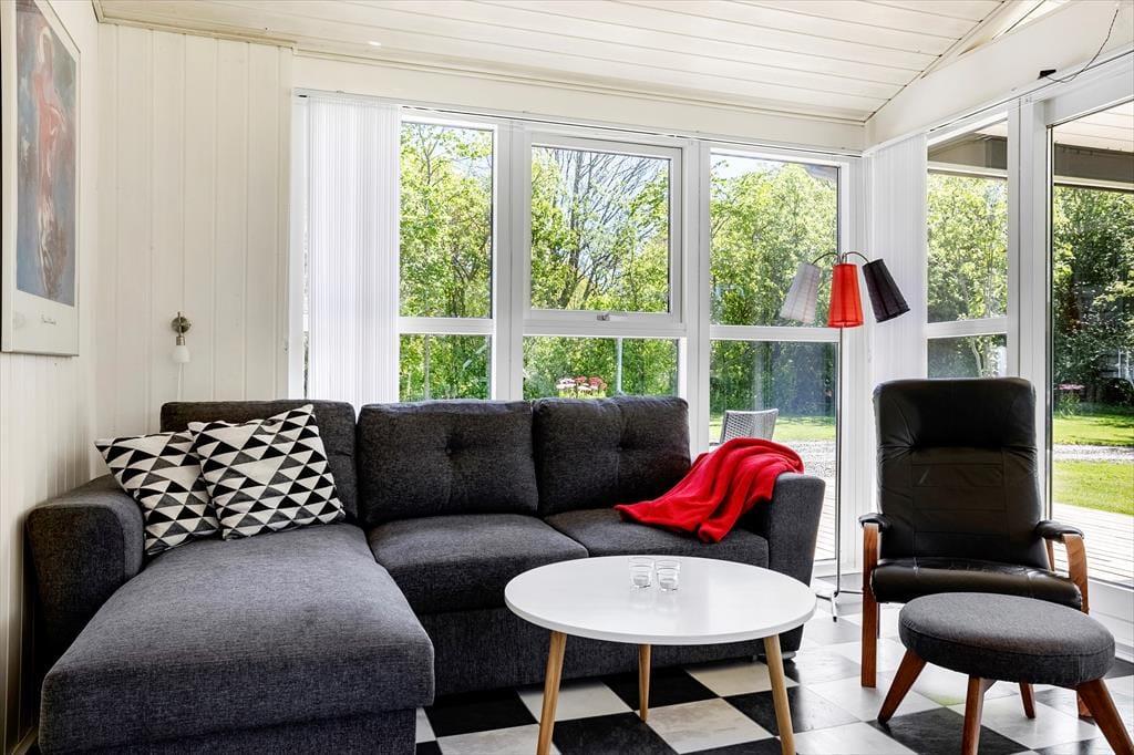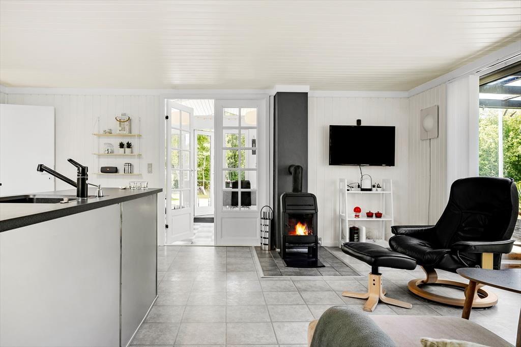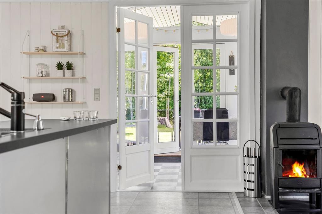 Sommerhuset er opført i 1995, og er blevet grundigt renoveret i 2021, så det fremstår som næsten nyt. Rummene er lyse og indbydende indrettet, og inden døre finder I alt, hvad I skal bruge for at holde en hyggelig og komfortabel ferie. I opholdsrummet, hvor stue og køkken er forenet, er der både brændeovn og varmepumpe med køl, så I kan få en passende temperatur uanset vejret. Der er desuden tv med Chromecast, hvis I trænger til lidt underholdning, og når der skal kokkereres, har I gode arbejdsforhold i det veludstyrede køkken. I forlængelse af opholdsrummet ligger en dejlig udestue med skønt lysindfald og fri udsigt til den grønne have. Udestuen byder blandt andet på en dobbelt sovesofa, hvilket er et godt supplement til soveværelsets dobbeltseng og til anneksets to enkeltsenge.