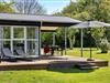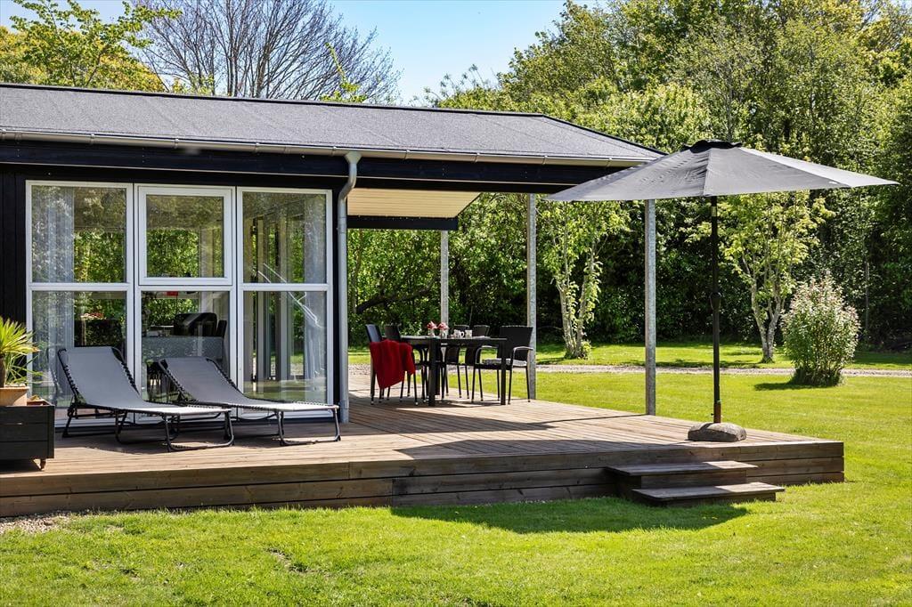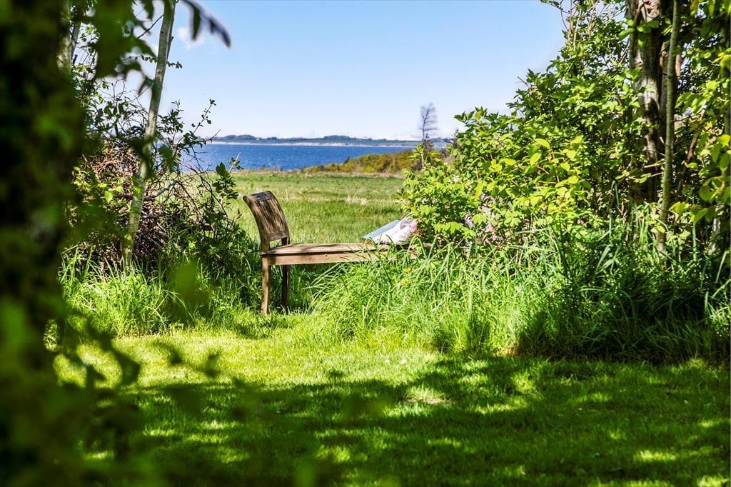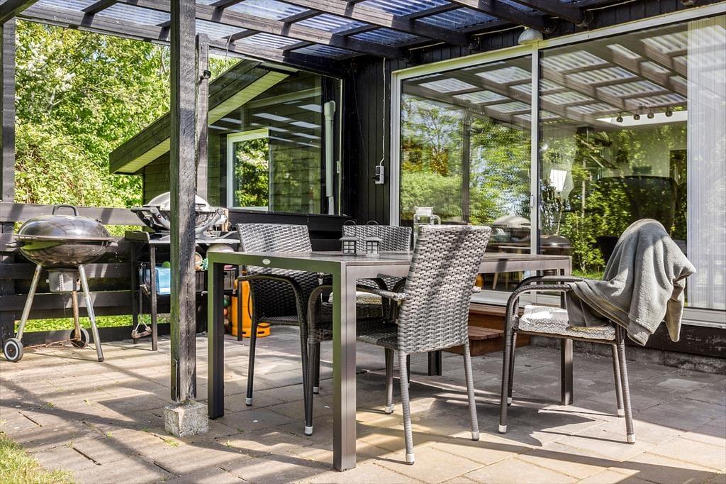 Fra både stuen og udestuen har I direkte adgang til et stort og delvist overdækket terrassemiljø, der breder sig øst, syd og vest for sommerhuset. Mod nord er der også en mindre terrasse, så det er nemt at finde den helt rette opholdsplads, uanset om I er til sol eller skygge. Grunden er på 2608 m2 og altså dejligt stor, så der er masser af plads til at spille havespil og lege.