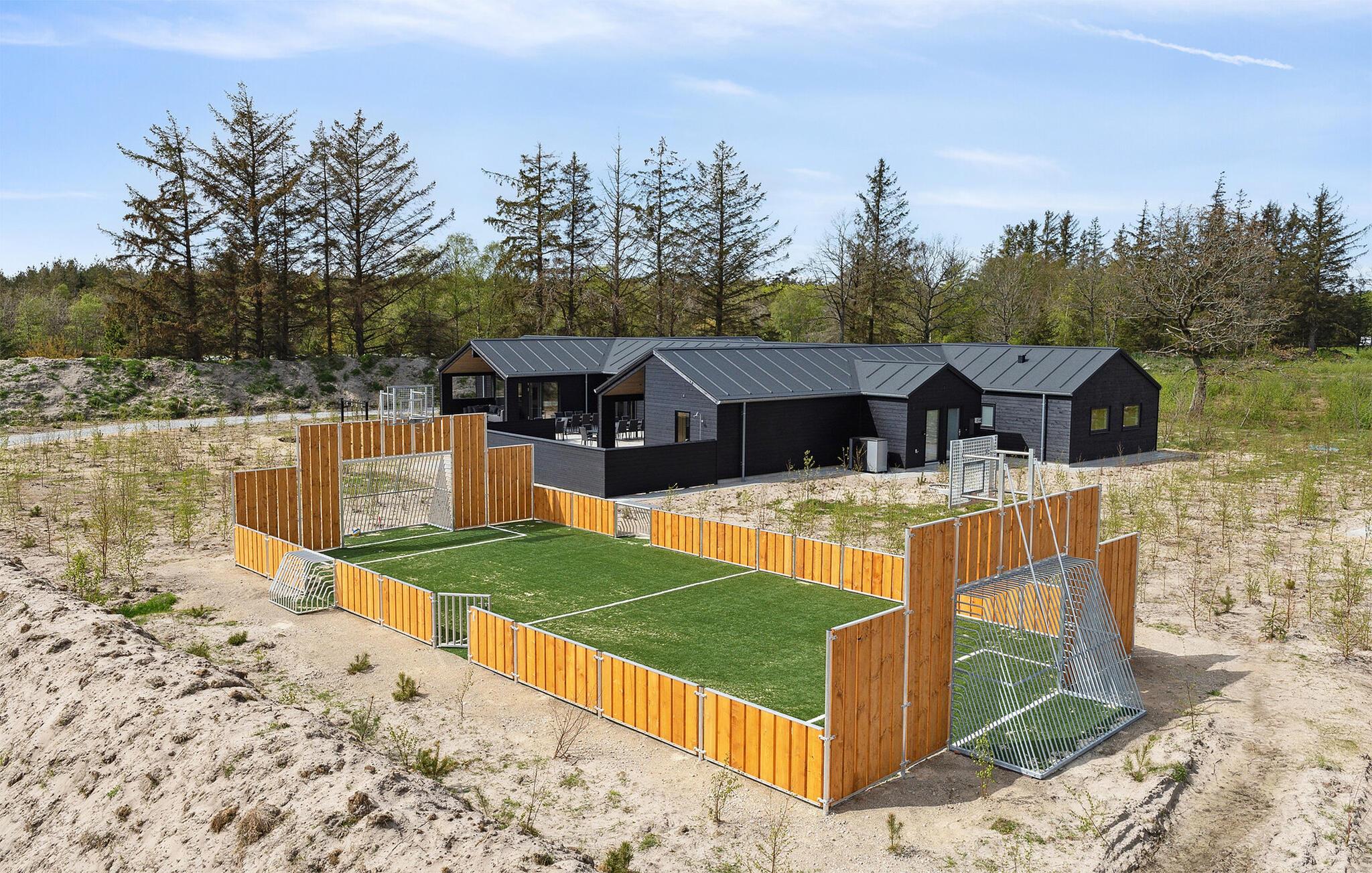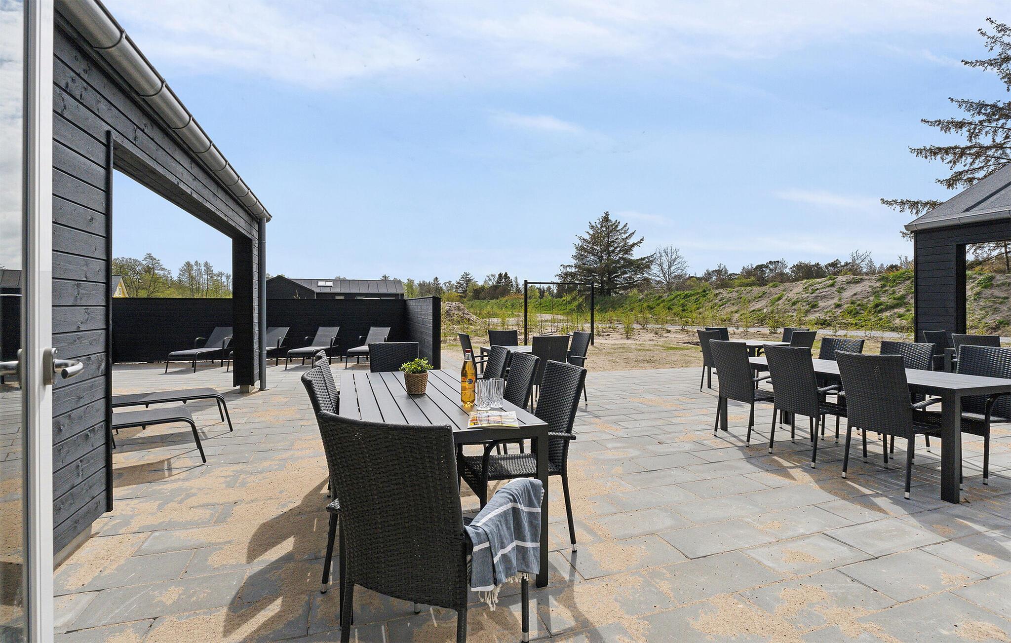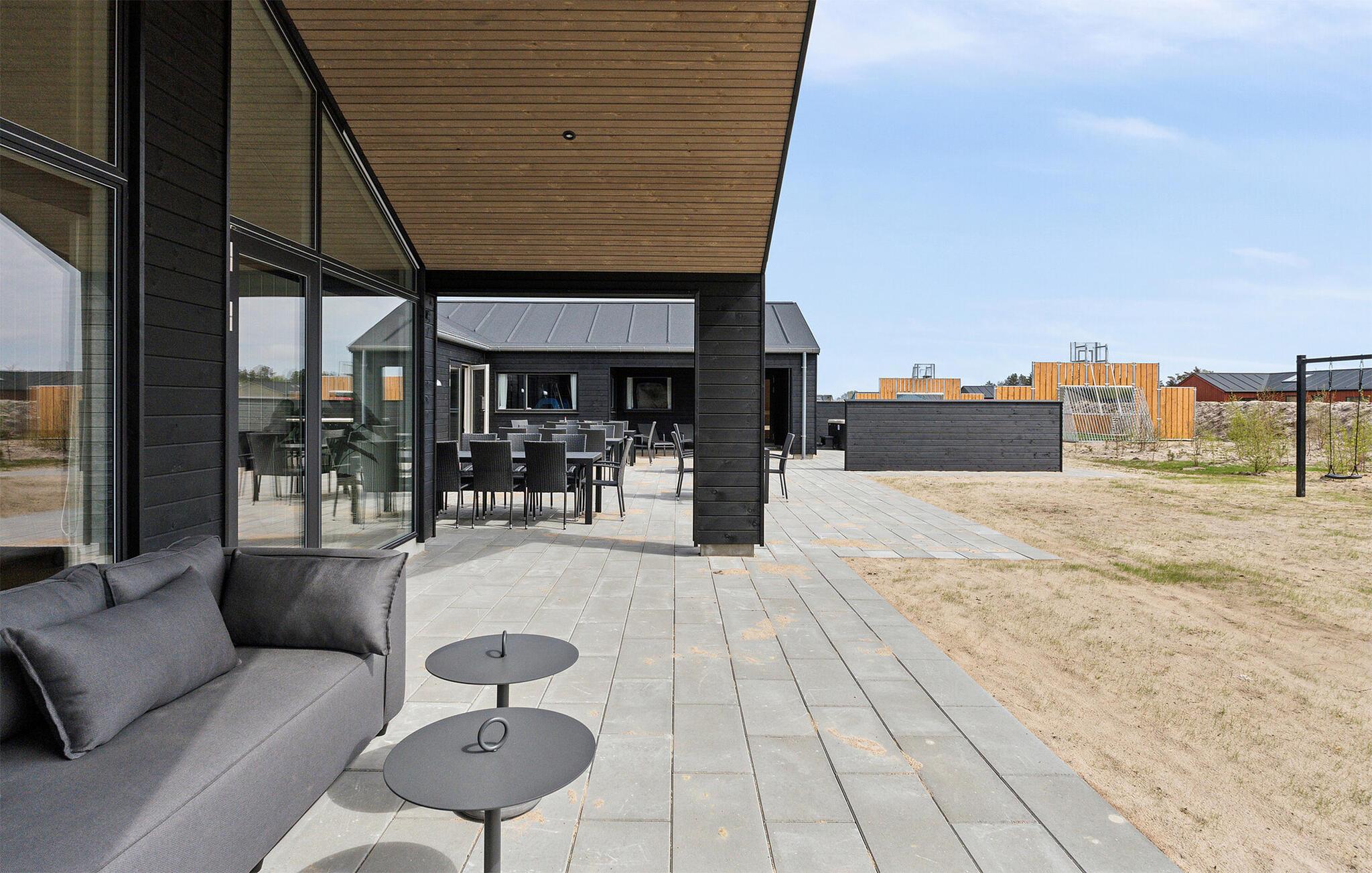 Udeområdet er tilsvarende dejligt og indbyder til sjov, leg og afslapning, når vejret er godt. Børnene får masser af plads, en trampolin og deres helt egen legeplads at boltre sig på, og måske I skal vælge hold til årets store brag på fodboldbanen? På den store terrasse er der masser af siddepladser, hvor I kan nyde måltiderne i det fri, hvis I føler for det, og her kan I også runde en smuk sommerdag af med et godt glas vin under aftensolen og nyde, at I ikke skal tidligt op.