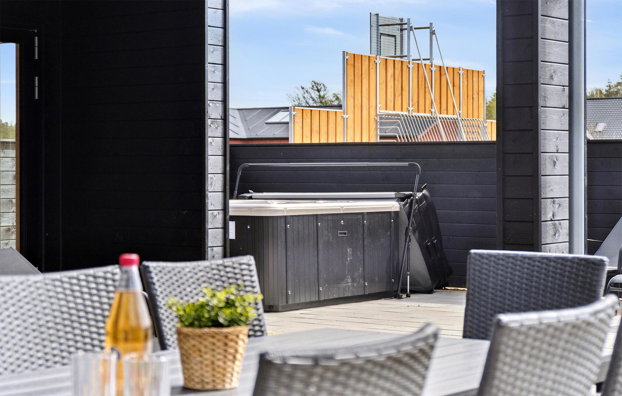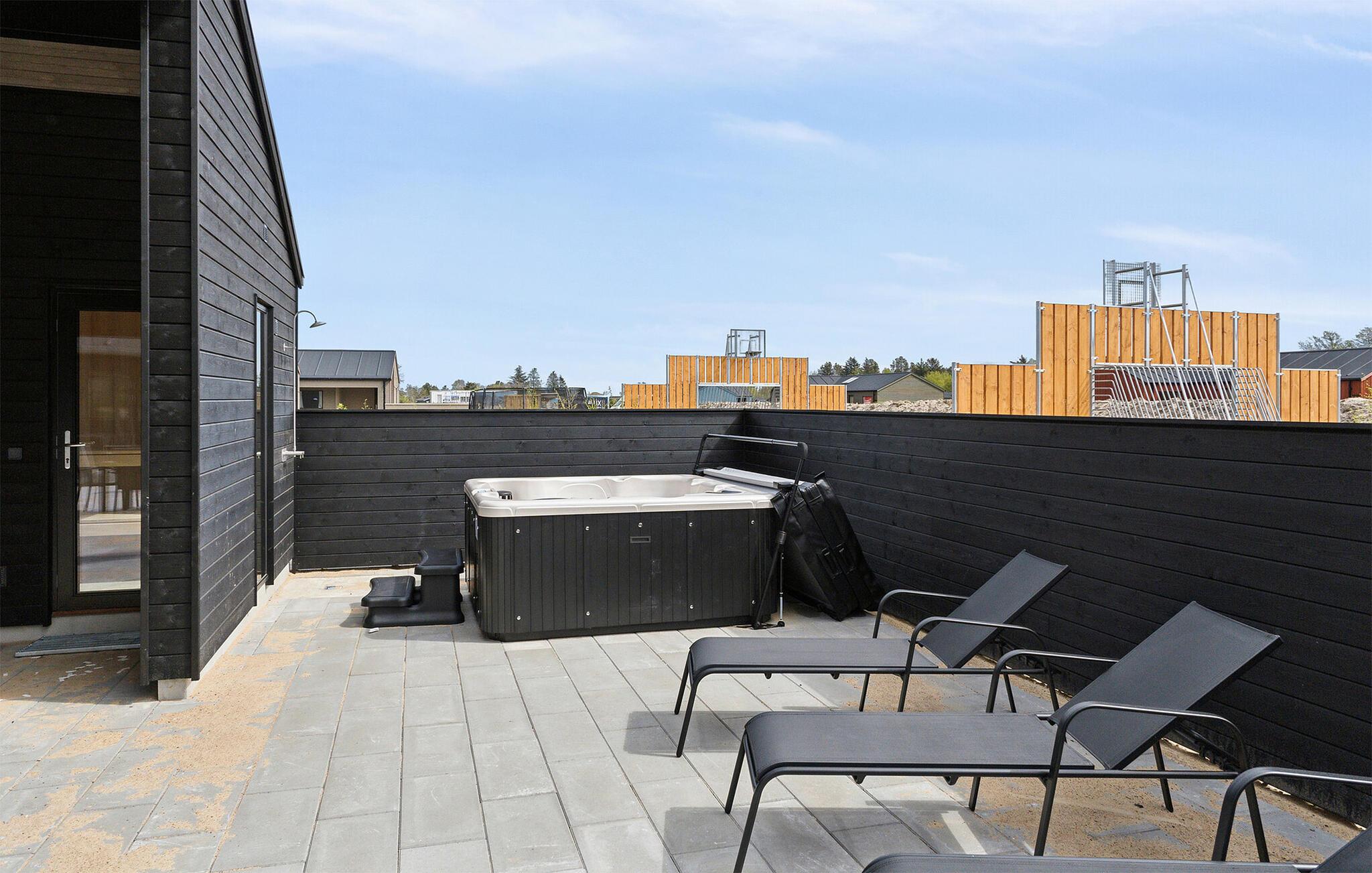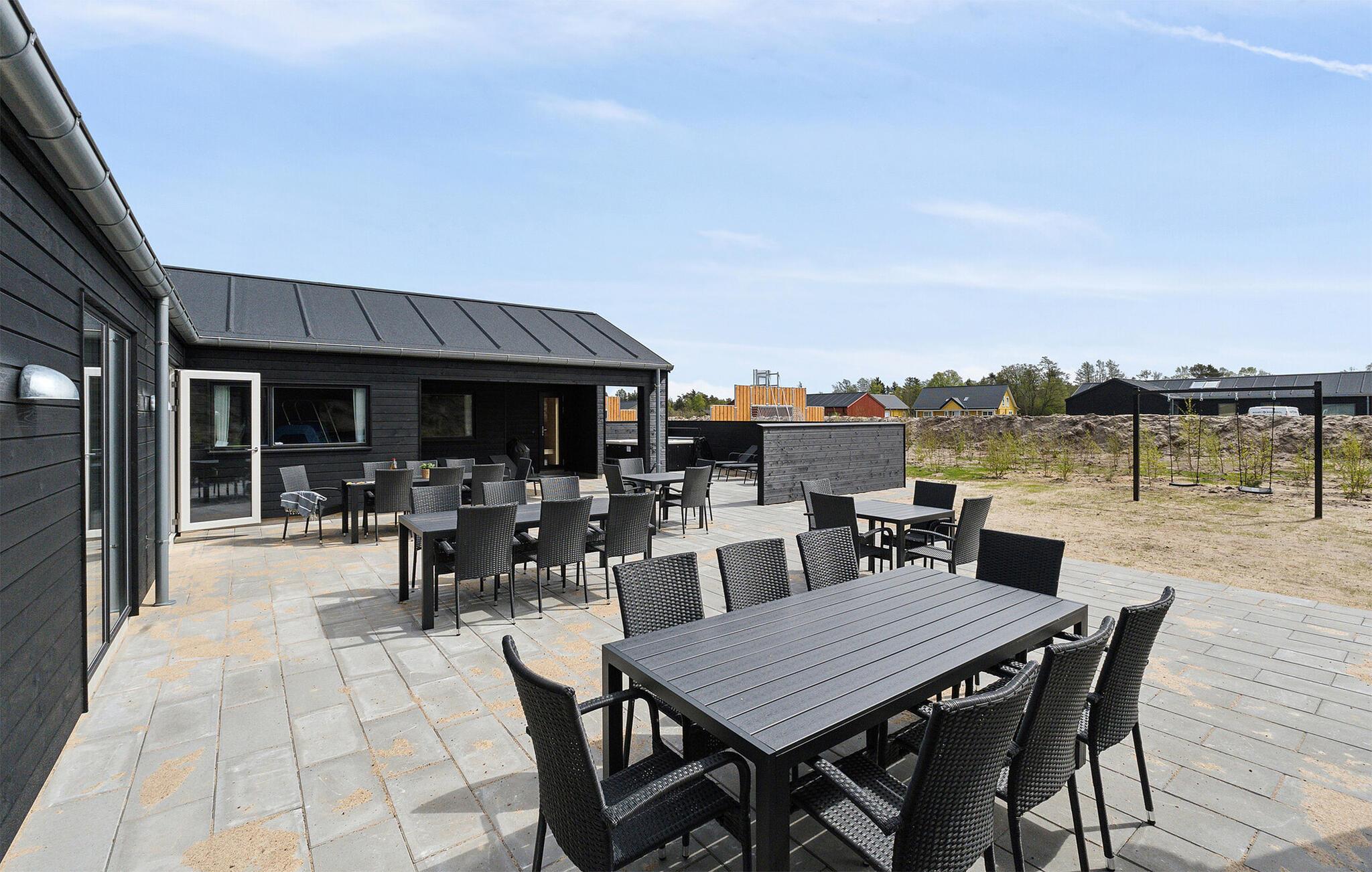 Udeområdet er tilsvarende dejligt og indbyder til sjov, leg og afslapning, når vejret er godt. Børnene får masser af plads, en trampolin og deres helt egen legeplads at boltre sig på, og måske I skal vælge hold til årets store brag på fodboldbanen? På den store terrasse er der masser af siddepladser, hvor I kan nyde måltiderne i det fri, hvis I føler for det, og her kan I også runde en smuk sommerdag af med et godt glas vin under aftensolen og nyde, at I ikke skal tidligt op.