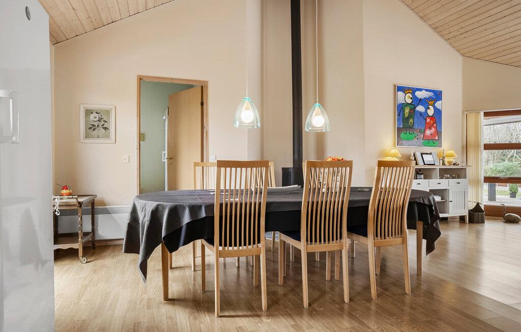 Tilbring jeres næste ferie i dette førsteklasses sommerhus, som kombinerer fred, ro og komfort i naturskønne omgivelser. De rummelige fællesarealer har en behagelig atmosfære, når I skal slappe af sammen. Tilbered nemt lækre måltider i det fine, åbne køkken. Den tilstødende spiseplads ved den varme brændeovn er en god ramme om de fælles måltider. Skulle vejret vise sig fra sin kølige side, er der hyggeligt i stuens bløde møbler, så find brætspillene frem og sæt jer med en god kop te. Derudover har huset sin egen sauna og spabad, hvilket er herligt efter en lang dag på farten.