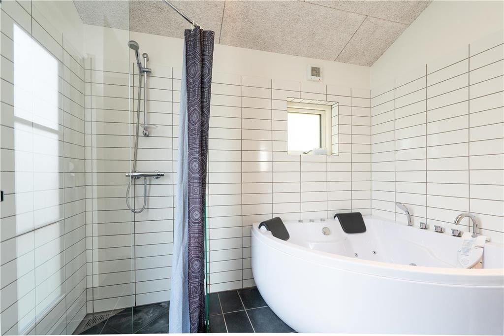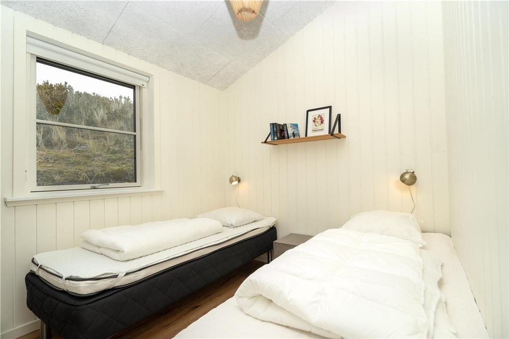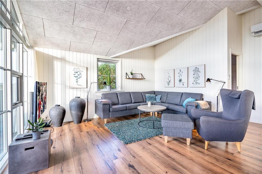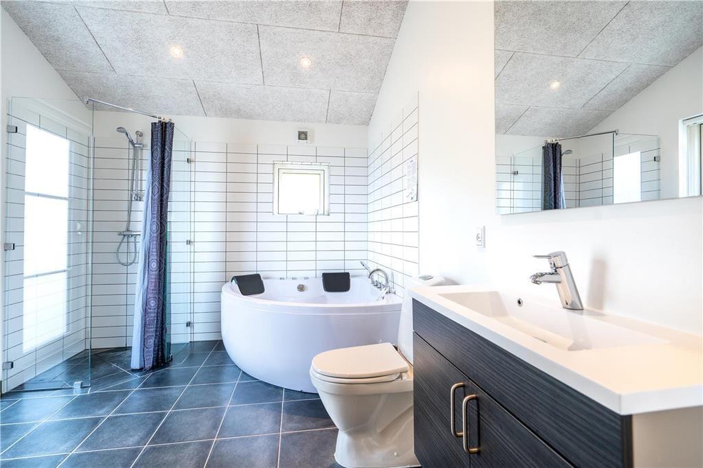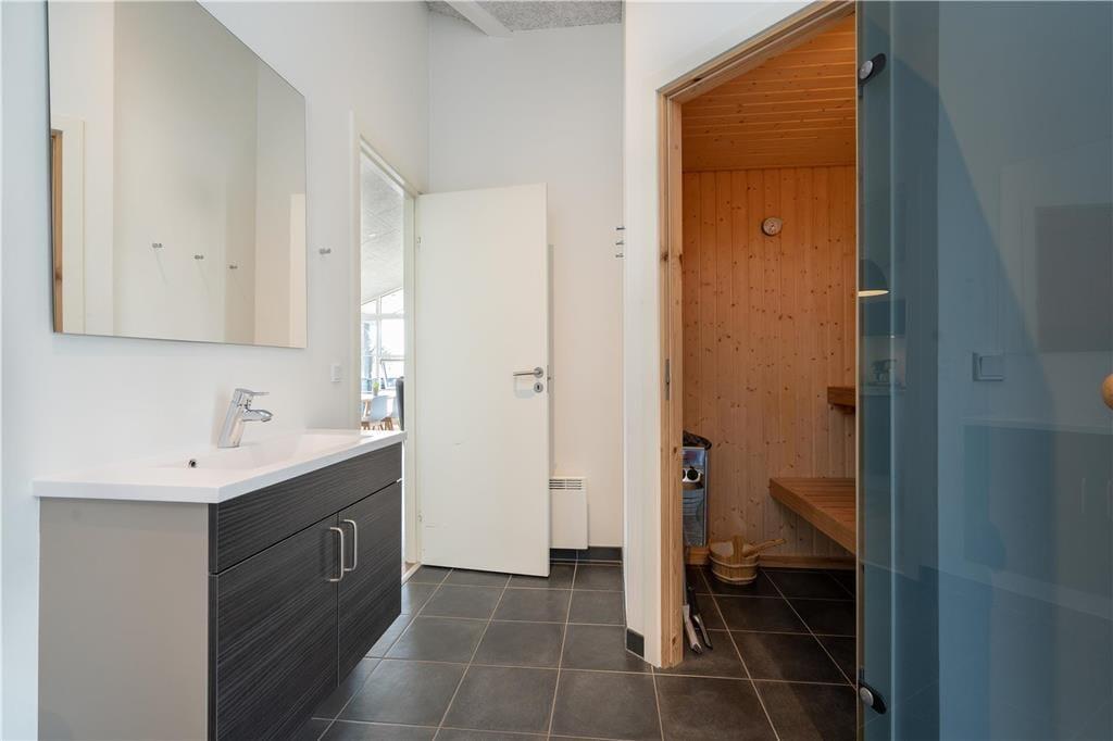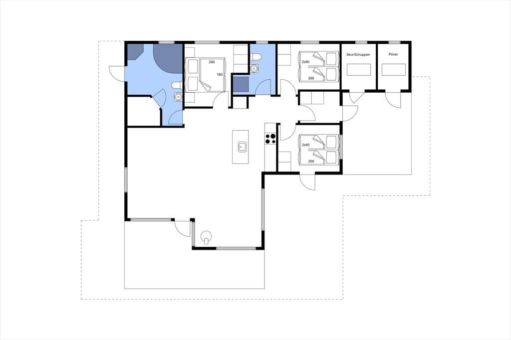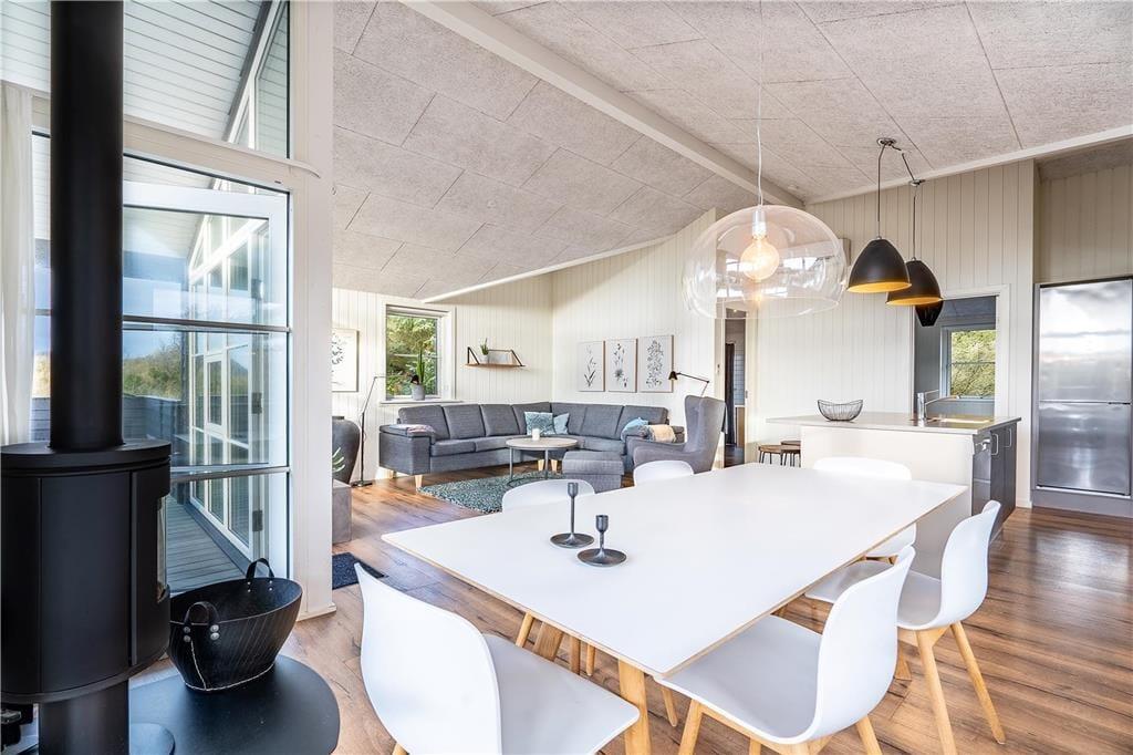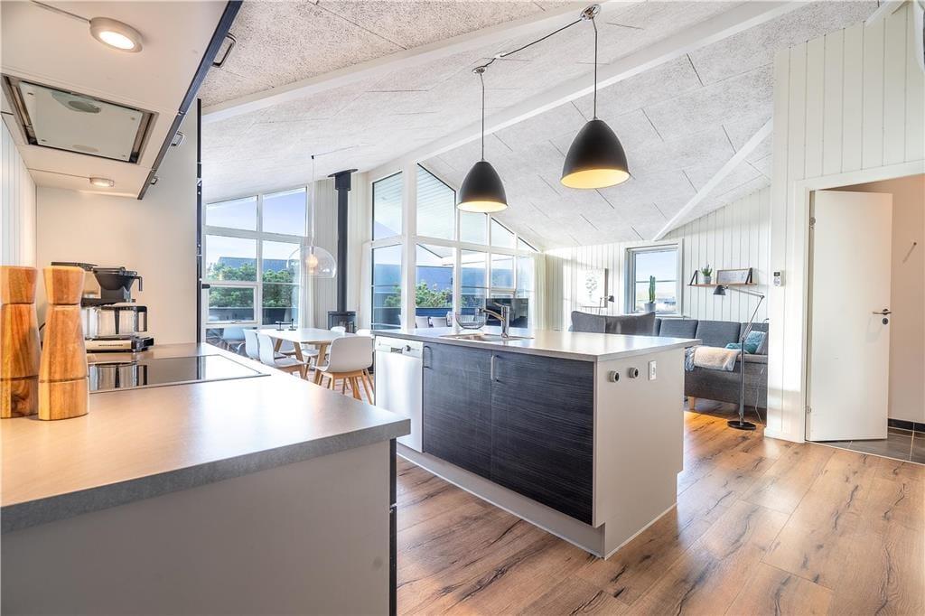 Feriehuset er indrettet med tre regulære soveværelser, som tilsammen giver jer sengepladser til seks personer. Badeværelset byder på en bruseniche, og med både et spabad og en sauna er wellness-faktoren helt i top. Foruden entréen rummer resten af huset et åbent opholdsområde, hvor køkkenet og stuen glider i ét, og her har I optimale forhold for at nyde feriedagene i hinandens gode selskab. Køkkenet er superlækkert indrettet, og ved køkkenøen er der siddepladser, hvor I kan nyde et godt glas vin og give gode fif til kokken. Retterne serveres let ved spisebordet, hvor brændeovnen luner. Stuen er indrettet med et hyggeligt sofaarrangement, og varmepumpen, akustiklofter til kip samt vinduespartier fra gulv til loft giver en behagelig atmosfære.