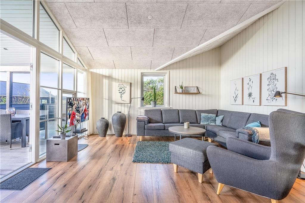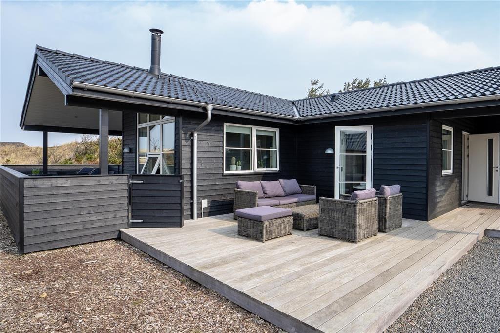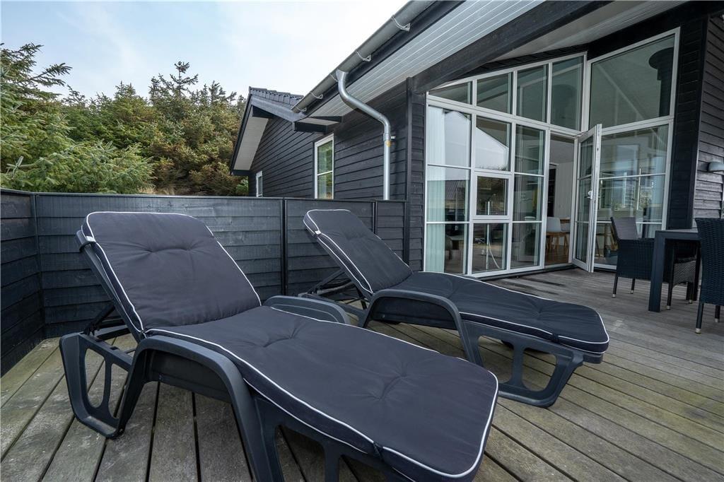 Huset er omkranset af åbne og overdækkede terrasser, så jeres feriedage kan I også bruge under solen i den friske luft. Her kan I falde hen i liggestolene, nyde et godt glas vin i sofaarrangementet eller servere måltiderne ved terrassebordet. En del af terrassearealet er aflukket, og her kan børn og hunde løbe frit. Som ekstra service er der opsat ladestik til elbiler.