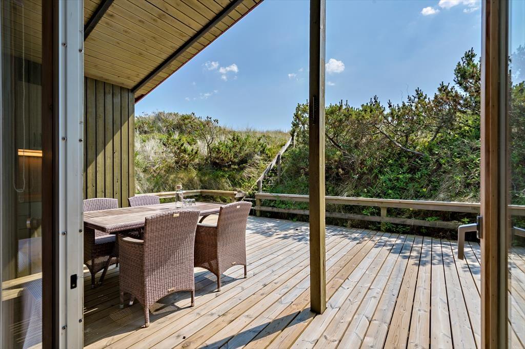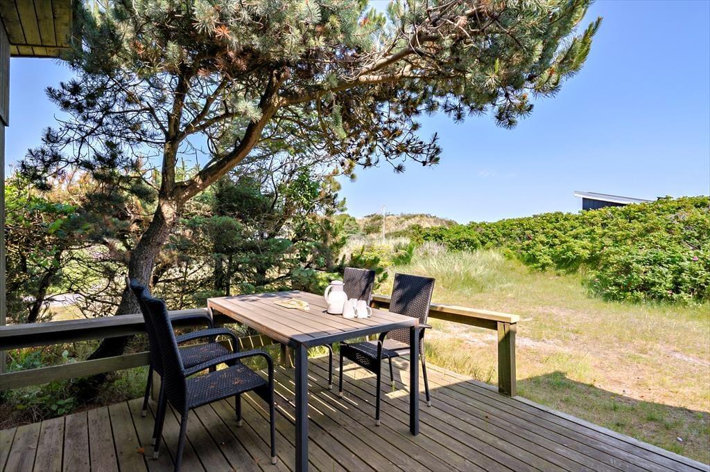 En nordvendt terrasse samt et stort øst- og sydvendt terrassemiljø giver jer rig mulighed for at nyde sommerens lune dage i solen. Den skønne naturgrund er stemningsfuld og uforstyrret, og fra udsigtsbænken kan I nyde en pragtfuld udsigt over området og Ringkøbing Fjord.