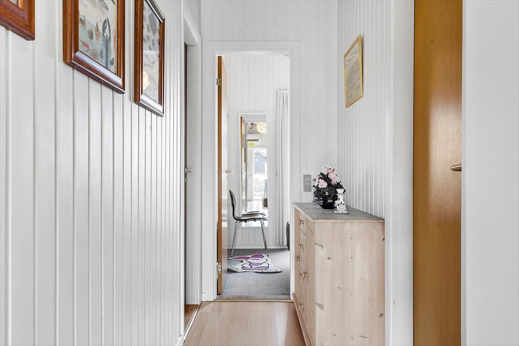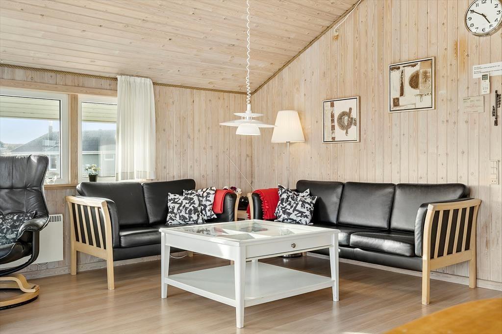 Feriehuset er indrettet med tre soveværelser med sengepladser til seks personer. Badeværelset har bruseniche og vaskemaskine, og der er tilmed en tilstødende sauna. I opholdsafdelingen ligger køkkenet og stuen i åben forbindelse, og her har I god plads til at være sammen om madlavning og måltider. Køkkenet er tosidet og udrustet med opvaskemaskine, så rengøringen går som en leg. Stuen har loft til kip og store vinduespartier, der giver et skønt lysindfald. Varmepumpen holder sammen med brændeovnen en behagelig temperatur, og med et spisebord såvel som et hyggeligt sofaarrangement kan I rigtigt hygge jer med en god bog, brætspil eller en film.